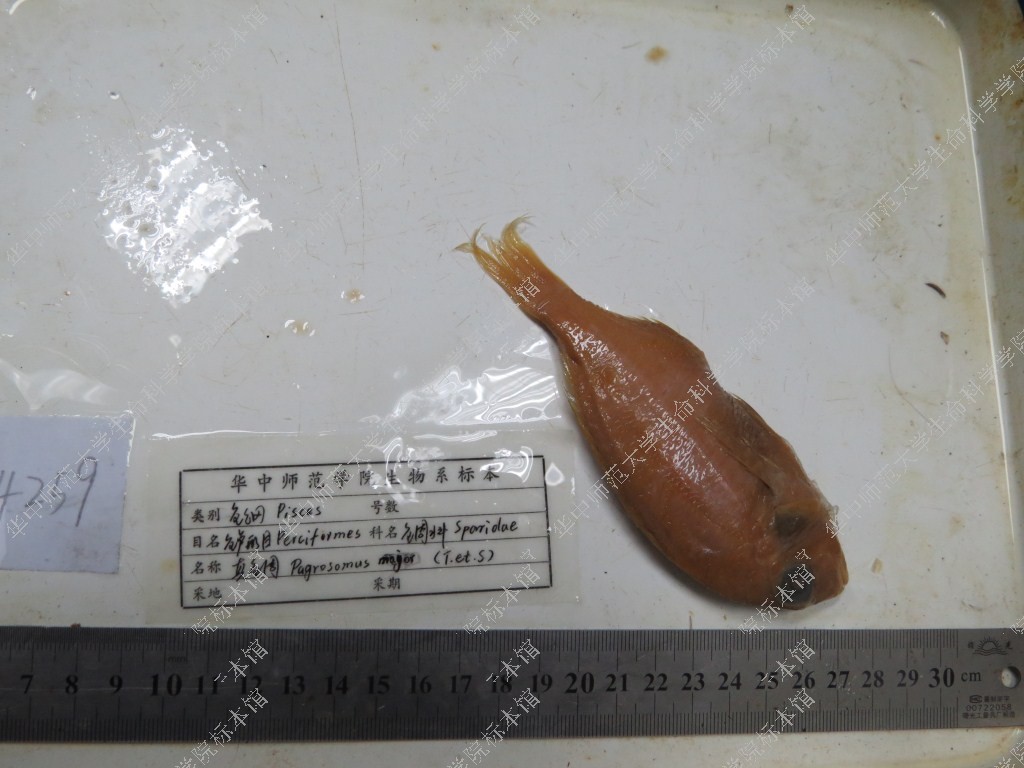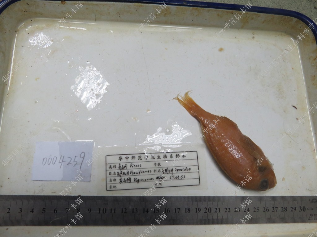体侧扁,呈长椭圆形,一般体长15~30厘米、体重300~1000克、自头部至背鳍前隆起。体被大弱栉鳞,头部和胸鳍前鳞细小而紧密,腹面和背部鳞较大。头大,口小、左右额骨愈合成一块,上颌前端有犬牙4个,两侧有臼齿2列。前部为颗粒状,后渐增大为臼齿;下颌前端有犬牙6个,两侧有颗粒状臼齿2列、前鳃盖骨后半部具鳞、全身呈现淡红色,体侧背部散布着鲜艳的蓝色斑点。尾鳍后缘为墨绿色,背鳍基部有白色斑点。