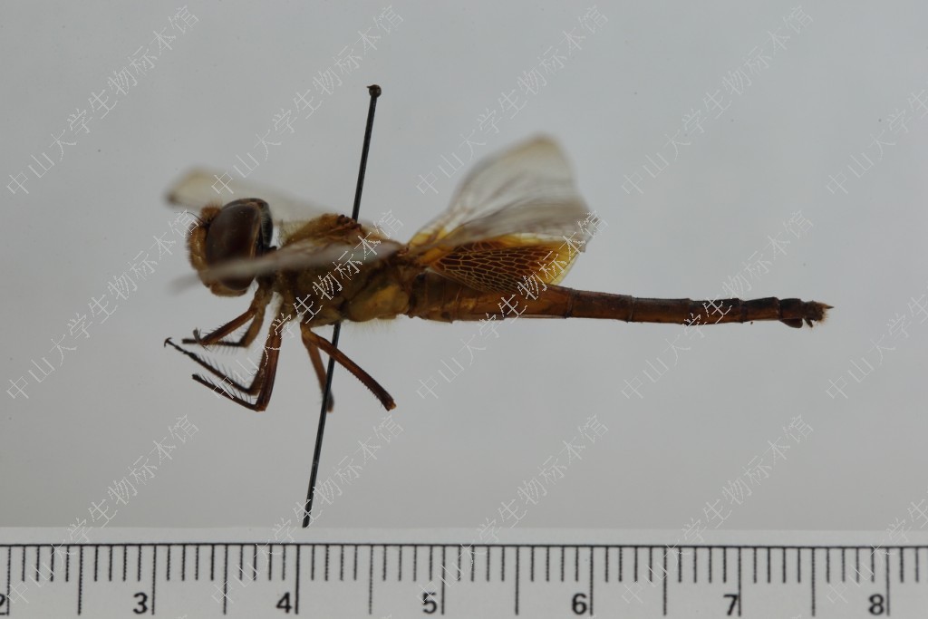 腹长31-32mm,后翅长38-40mm。合胸背前方赤褐色,侧面淡赤褐色,具不清晰深褐色条纹。翅透明;翅基具褐斑,前翅的较浅,覆盖至弓脉;后翅的较浓,覆盖三角室及臀套基半部。腹部红色,第8-9节背面具黑色斑。肛附器红黄色。雌性腹部色较淡,肛附器黄色。