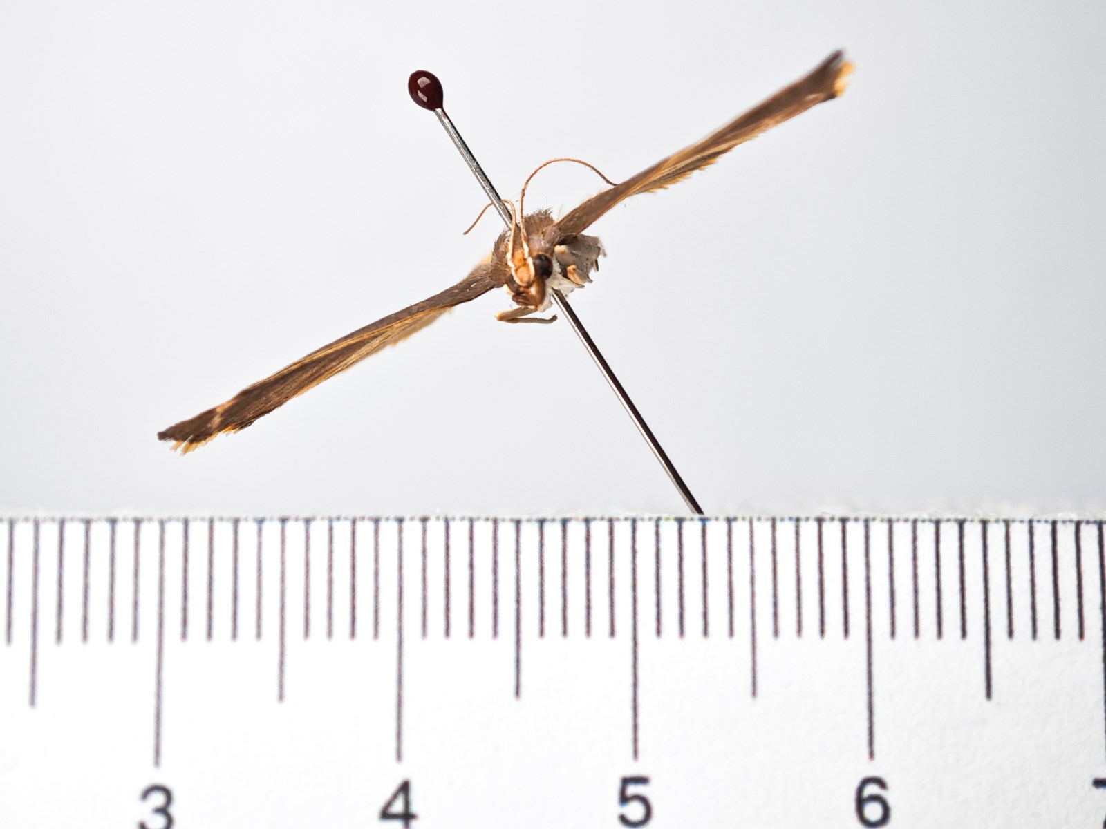翅展32-35mm。头、下颚须及触角淡赭黄色。下唇须淡灰黄色。胸腹部赭黄色。前翅淡赭黄色有闪光,缘毛赭黄色基部灰褐色,后翅赭黄色,前缘及臀区暗赭褐色,缘毛赭黄色。雄性外生殖器:爪形突宽圆,披疏稀短毛;背兜宽阔、弯曲,末端有1棘刺;抱器瓣短宽,顶端钝圆,抱器背基突三角形;由抱器瓣中部向背缘伸出1具刚毛的指形突,向腹缘伸出1三角形及1钩形突,抱器腹宽圆肿胀;阳端基环基部粗状,端部分双叉;阳茎粗壮筒状,内部有一束粗细不等针状角状器。