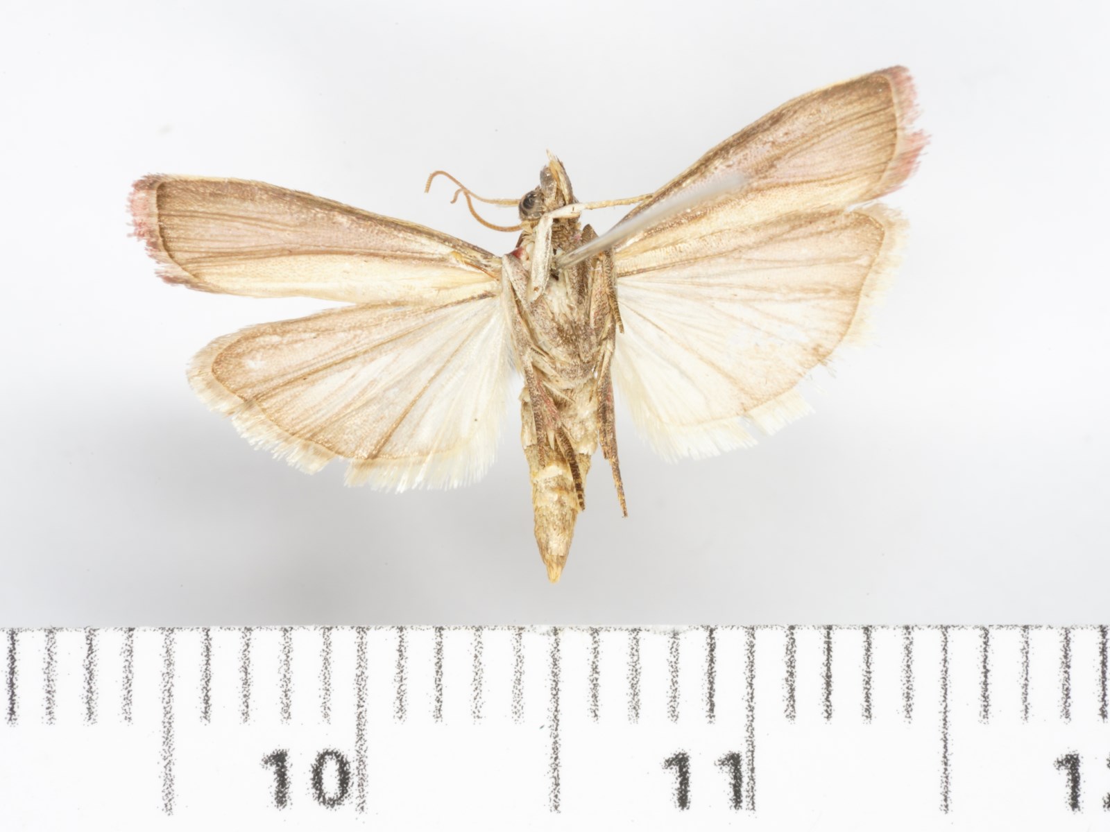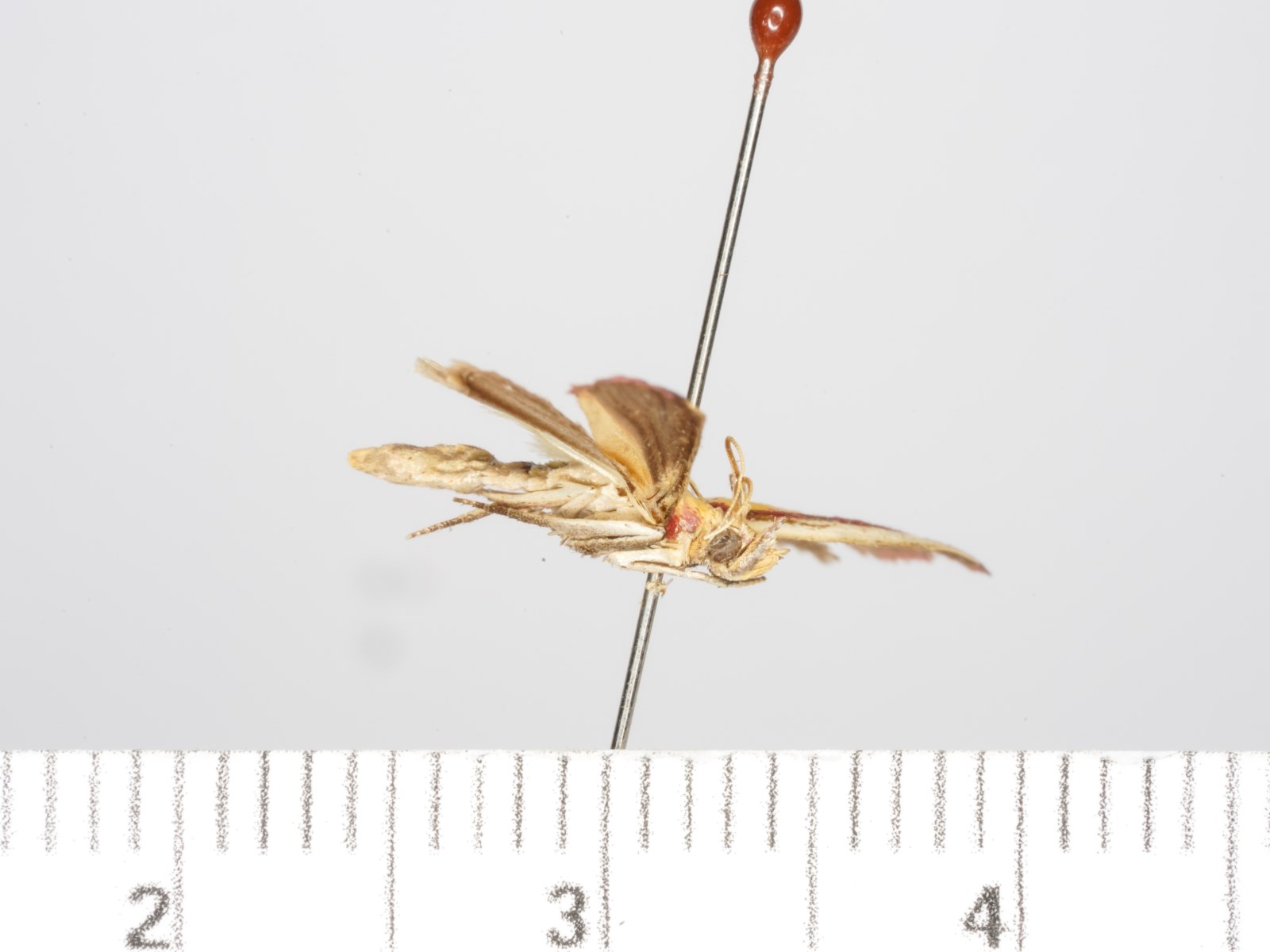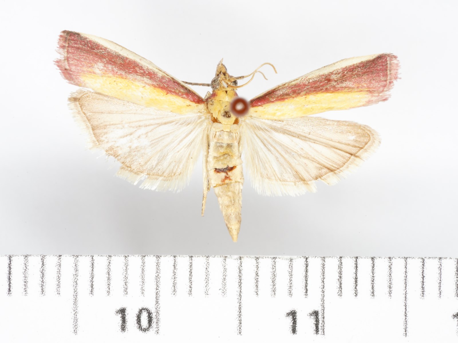 翅展19.0 -28.5 mm。头顶被淡黄色隆起鳞毛。触角淡黄褐色,柄节长为宽的2 倍,雄性缺刻内鳞片簇上面灰褐色,下面黄白色。下唇须弯曲上举,明显超过头顶,约是头长的2 倍,内侧淡黄色,外侧褐色。雄性下颚须淡黄色,刷状,藏在下唇须第2节的凹槽内;雌性较短,灰白色,端部鳞片扩展。领片和翅基片的内侧淡黄色,外侧红色。前翅前缘白色,后缘黄色,中部桃红色,有的中部为黄色和棕褐色纵带所替代;内、外横线均消失;缘毛红色。后翅茶褐色,缘毛黄白色。