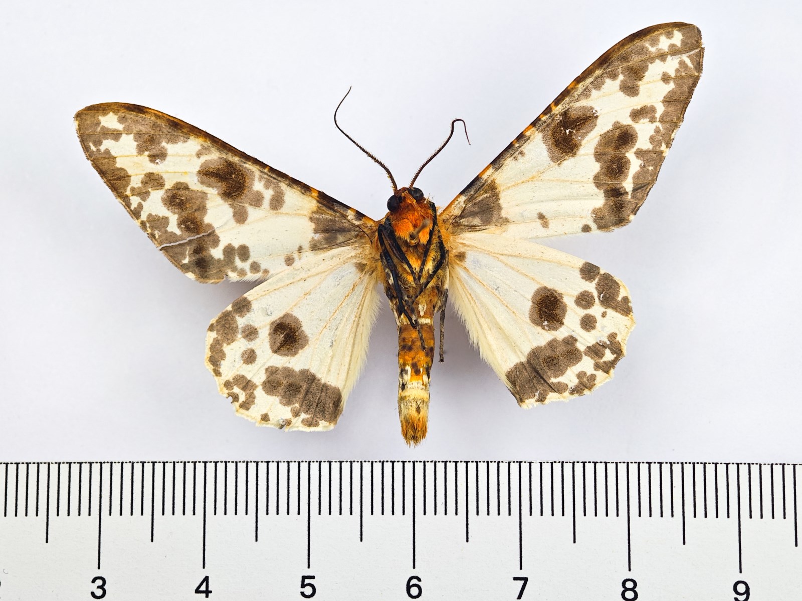 前翅长28-35 mm。雄触角锯齿状,具纤毛簇;雌触角线状。下唇须极短,仅达额下,黑褐色。额、头顶、胸背黄色至黄白色,腹背灰白色。前翅前缘延长,顶角钝圆,外缘平直且内斜;后翅外缘圆,翅白色,散布大小不一的深灰褐斑。前翅基部有一大斑,深灰褐色;外线由深灰褐色斑点组成,斑点中部黄褐色,斑点相连,则成中部为黄褐色、两侧为灰褐色的带,带在M2脉处外凸后直达后缘,带上有深灰褐色斑块和黄褐纹。后翅无基斑,外线与前翅相同。两翅中室端点为深灰褐色大斑。翅反面与正面相同。