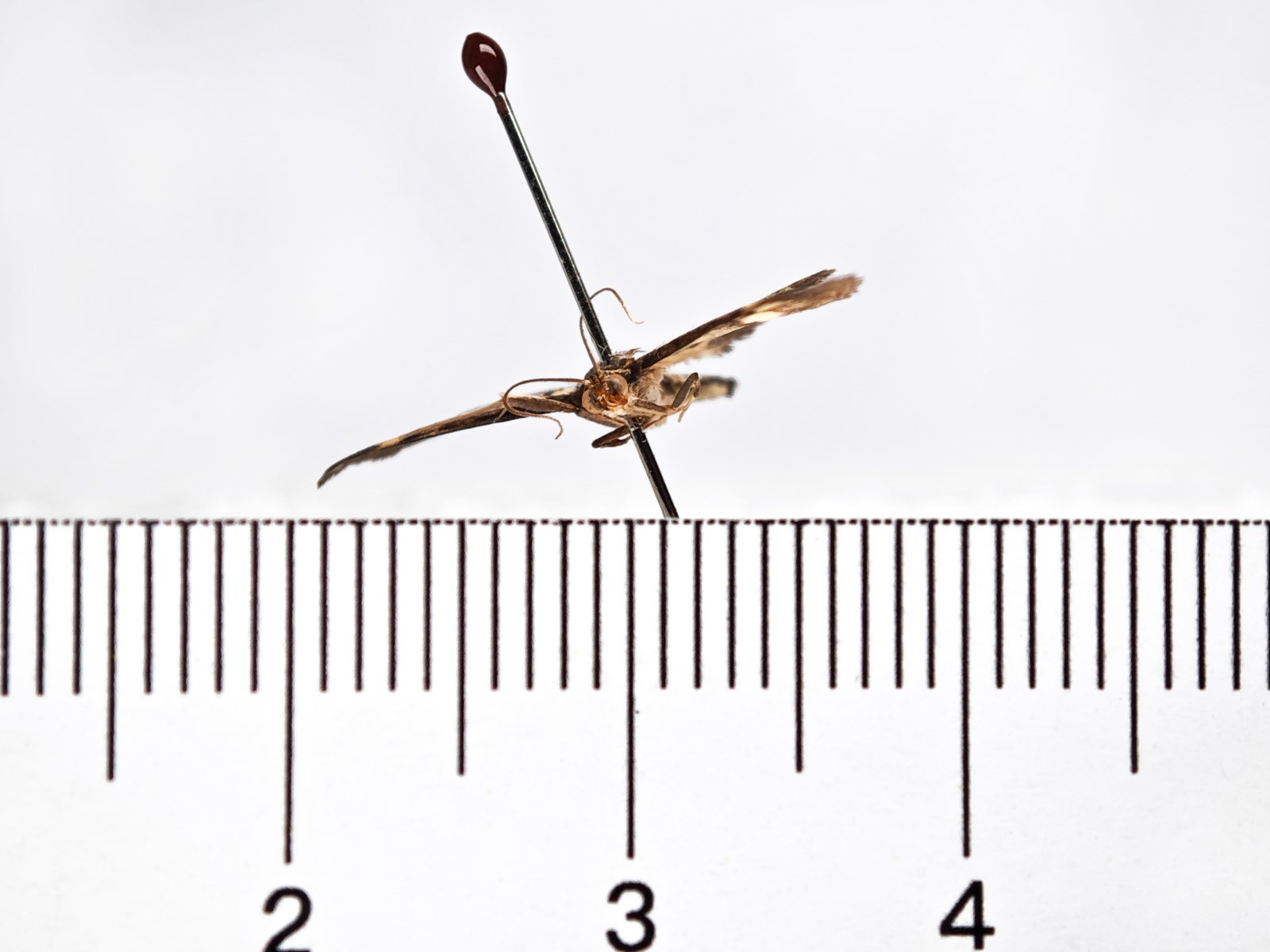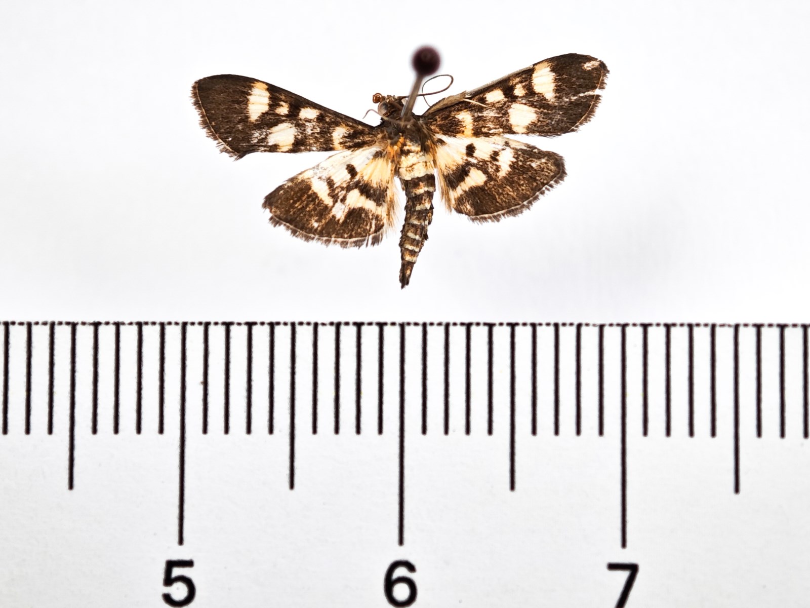 描述翅展19.0-24.0mm。额灰褐色,近触角处两侧白色。触角背面灰褐色,腹面棕褐色;雄性腹面纤毛长约为触角直径的1/2。下唇须基部及腹面白色,端部及背面黑褐色,末节污白色。下颚须黑褐色。领片、翅基片、胸部背面黑褐色,中胸背面淡黄色。前翅黑褐色,其上斑纹淡黄色;中室后缘基部下方有一横条斑;中室内有一近方形斑;中室端外侧紧靠中室端有一近椭圆形小斑,其外侧有一椭圆形大斑;中室端下方有一近卵圆形大斑。后翅基部2/3淡黄色,端部1/3暗褐色;中室端斑暗褐色,肾形;后中线暗褐色,弯曲,在M2和CuA1脉之间显著向外凸出。前、后翅缘毛灰褐色,近基部色稍深,基部色浅。足黄白色,前足基节、腿节内侧具灰褐色鳞片,胫节端半部暗褐色。腹部背面第1节淡黄色,其余各节暗褐色且后缘白色,腹面黄白色。