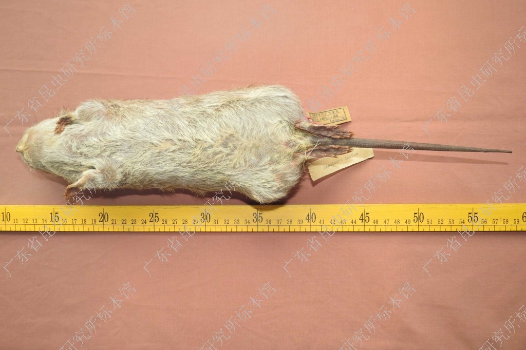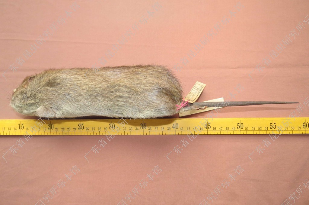 头体长188~328;尾长190~280;后足长46~60;耳长25~33;颅全长48.6~63.6;体重500~1000g。体型很大,粗毛。背毛粗浓,暗棕色,沿背中线有黑色粗长针毛。体侧呈浅棕灰色。腹毛暗棕灰色。尾粗,稍短于头体长,单一的暗棕色到接近黑色,覆有短而硬的刚毛。前足和后足背面暗棕色,但是爪呈淡棕色,爪强健发达适于挖掘。雌体有6对乳头(1对胸位、2对腋下、1对腹位、2对鼠蹊部)。
