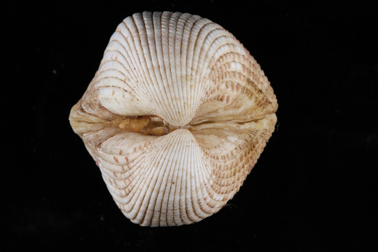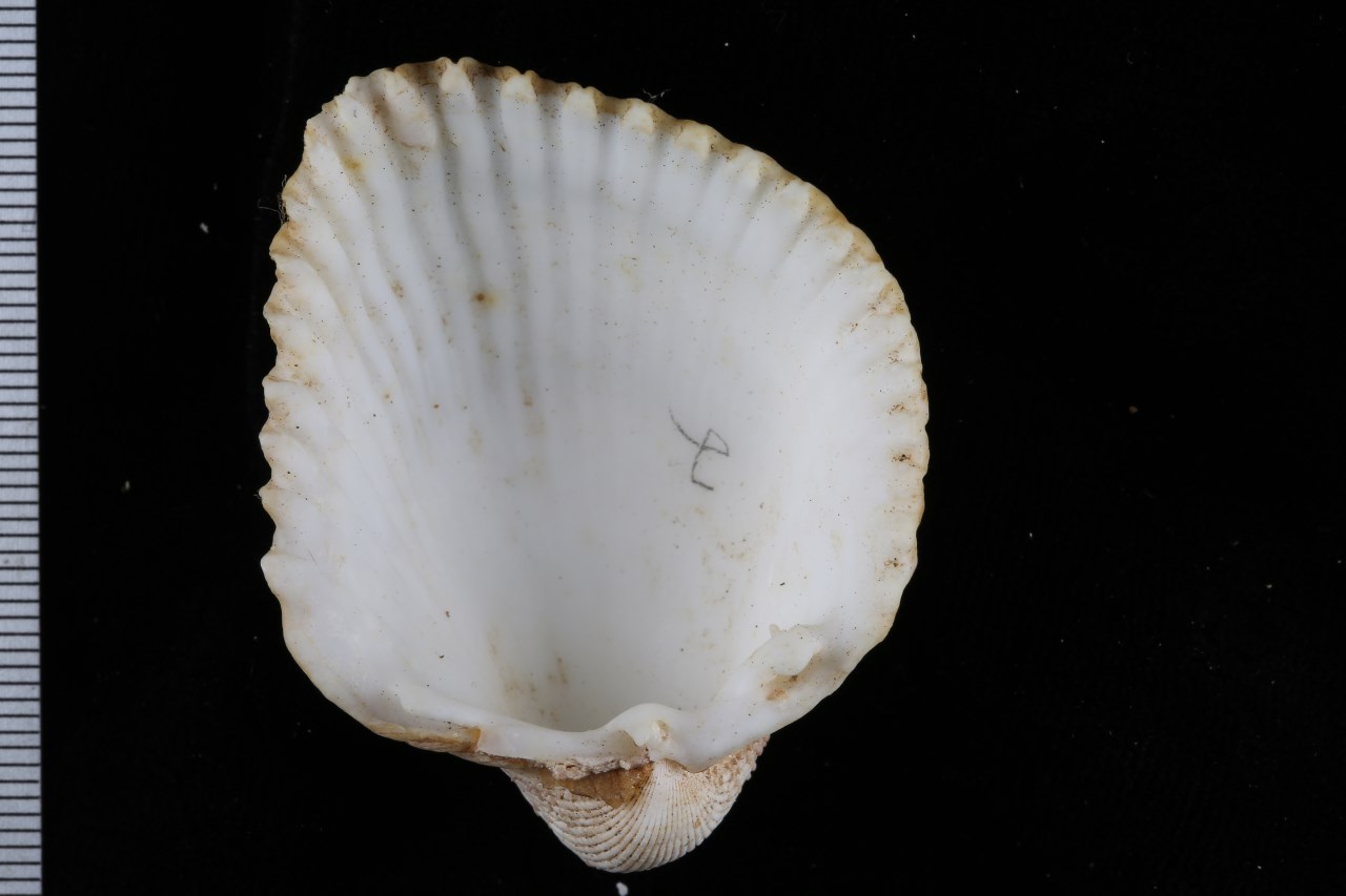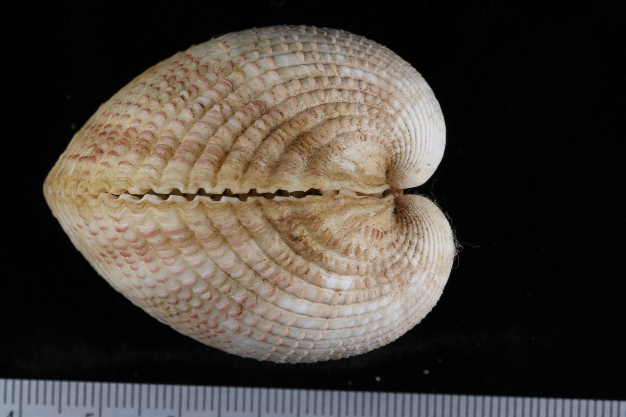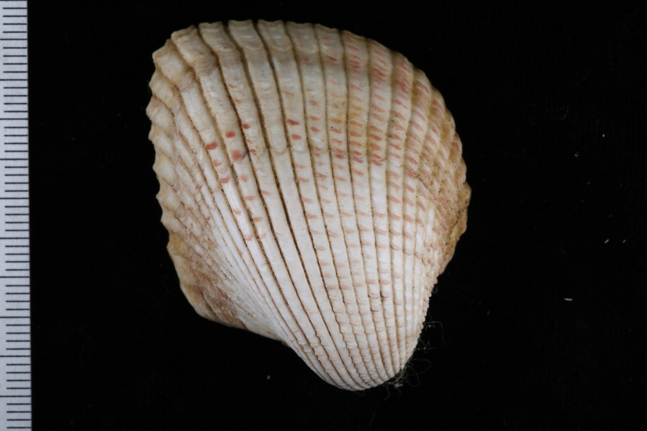 壳长约35~45mm;壳顶高出背缘并向内扭卷;壳面黄白色,有数十条宽平的放射肋,肋上有紫红色的稀疏的鳞片状突起。壳内白色,周缘有齿状缺刻,后缘者较长;铰合齿发达。台湾和海南;栖息于潮间带低潮带至浅海沙质海底。