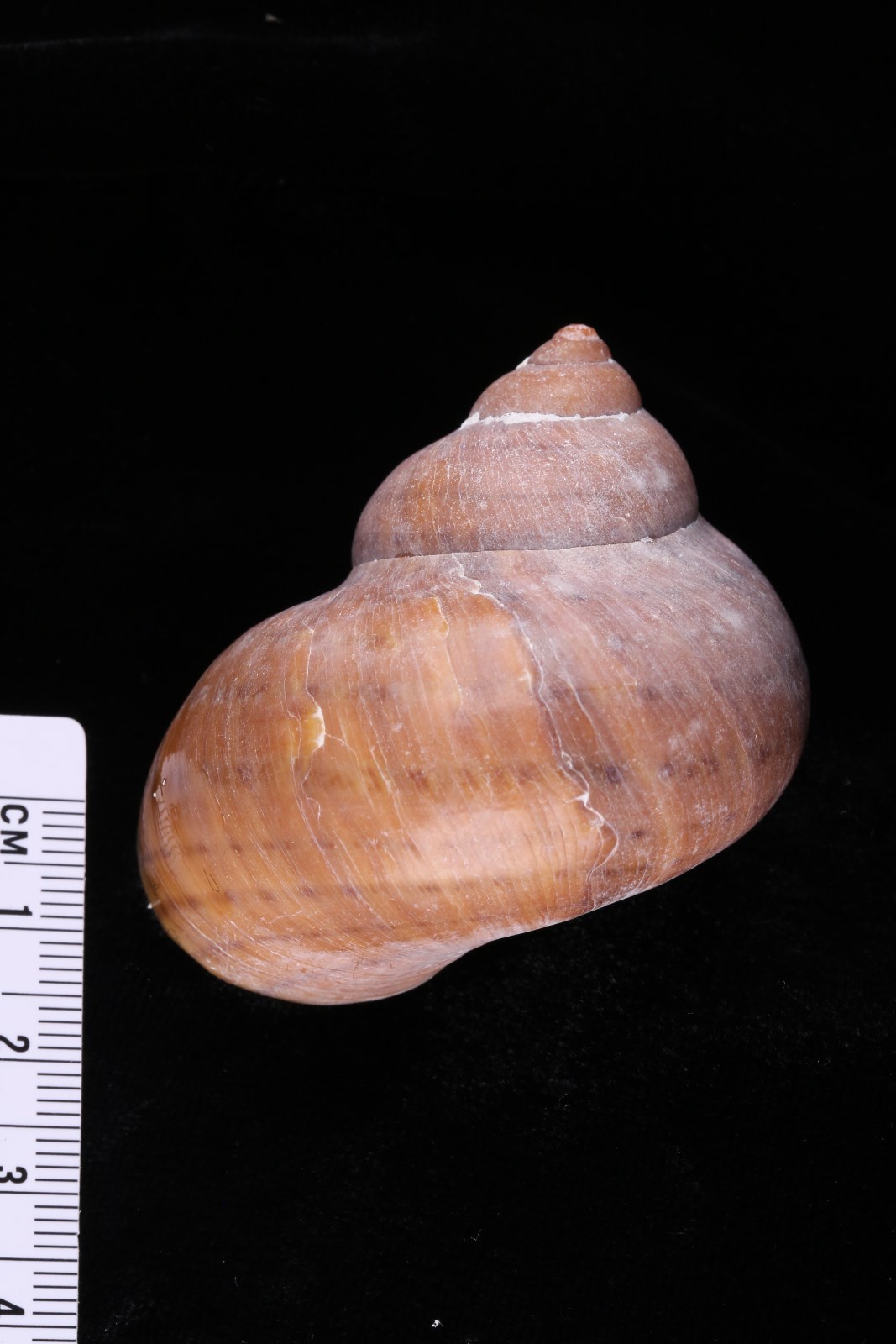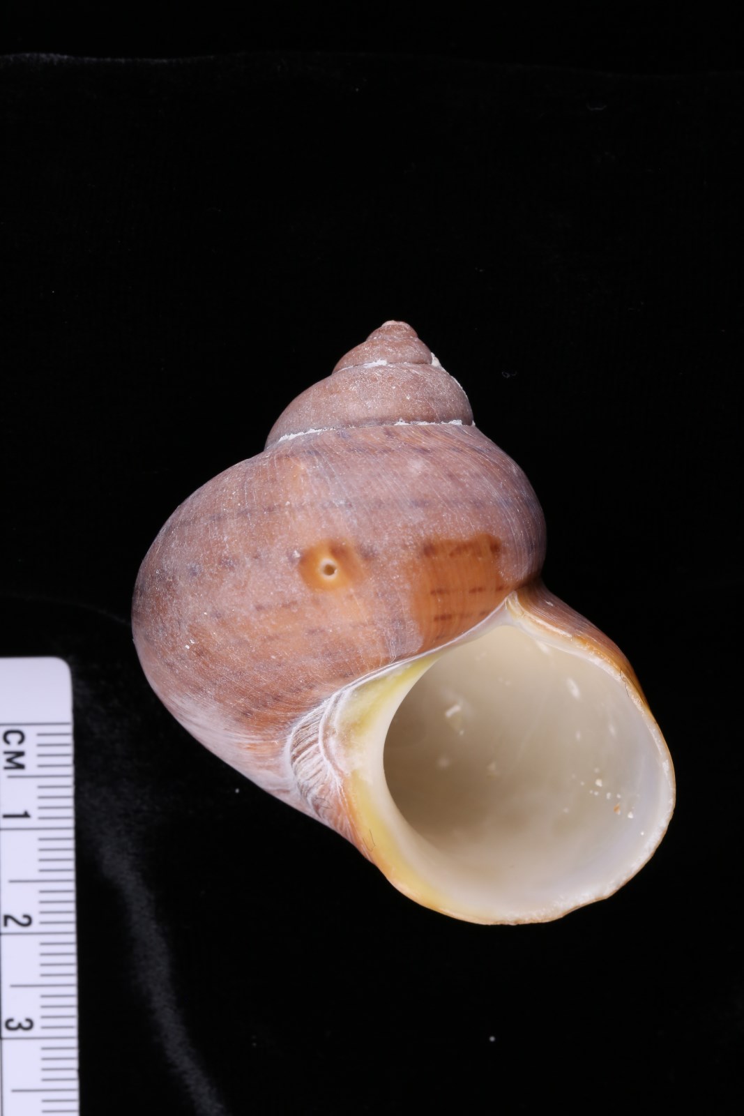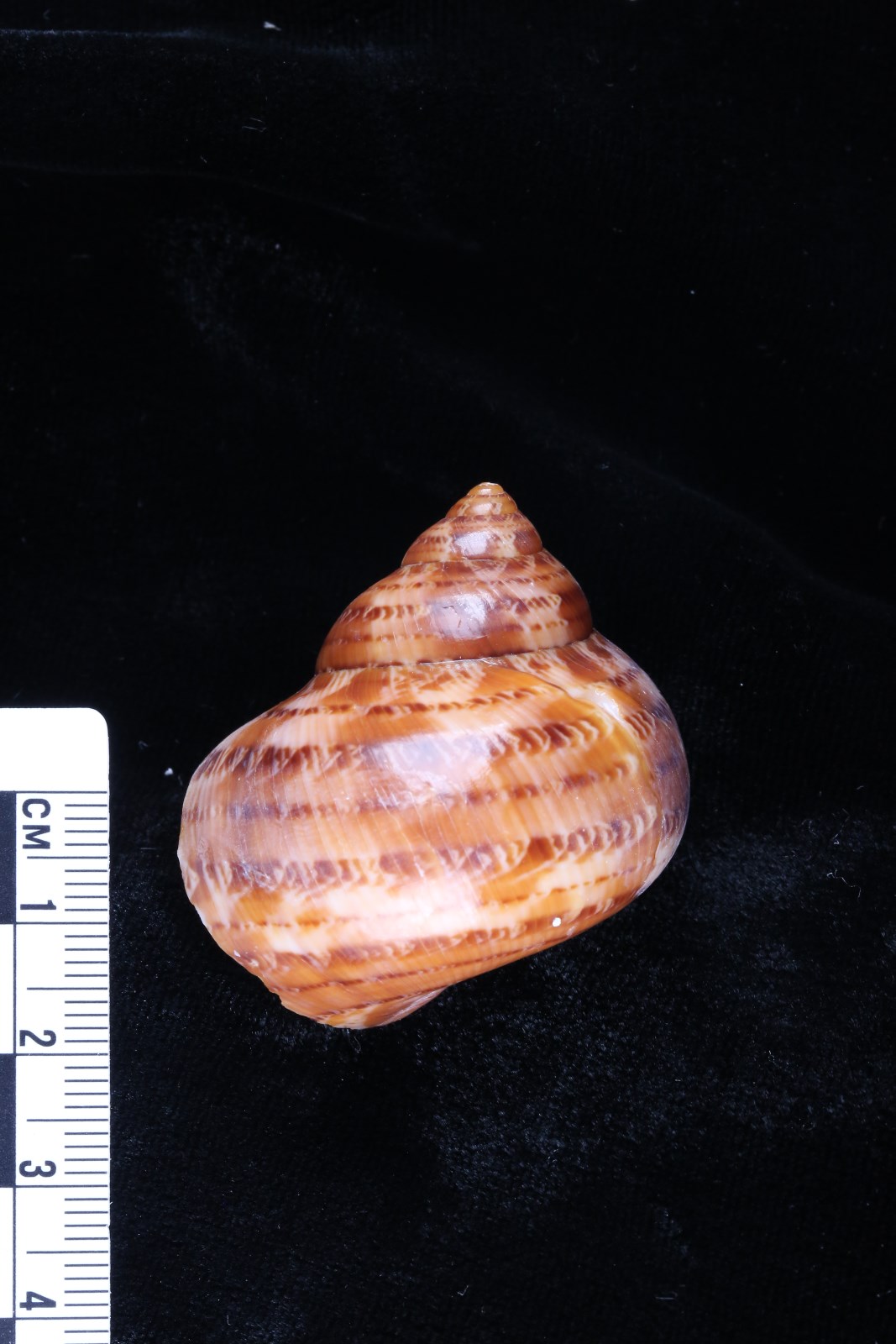 贝壳中等大,壳貭结实,壳高55毫米,宽50毫米。螺层约6层,缝合线明显,壳顶略尖,体螺层较宽大,生长纹纤细,壳面稍膨胀,甚光滑。壳色鲜艳夺目,丰富多彩,壳顶粉红或紫红色。贝壳通常为淡黄或褐色底,配有棕色或棕绿色螺带,螺带上具有不规矩的黄白色斑纹。贝壳基部膨胀,色彩和光泽与壳面同。无脐孔。壳口圆,内面白色,有真珠光泽。外唇简单;内唇厚,黄或黄绿色,在上端向内扩展掩盖脐部,下端多少反折成一扩张面。靥石灰貭:靠内唇部加厚,白色,光滑;中央部翠绿;靠外唇部较薄,褐色,有细小的颗粒突起。