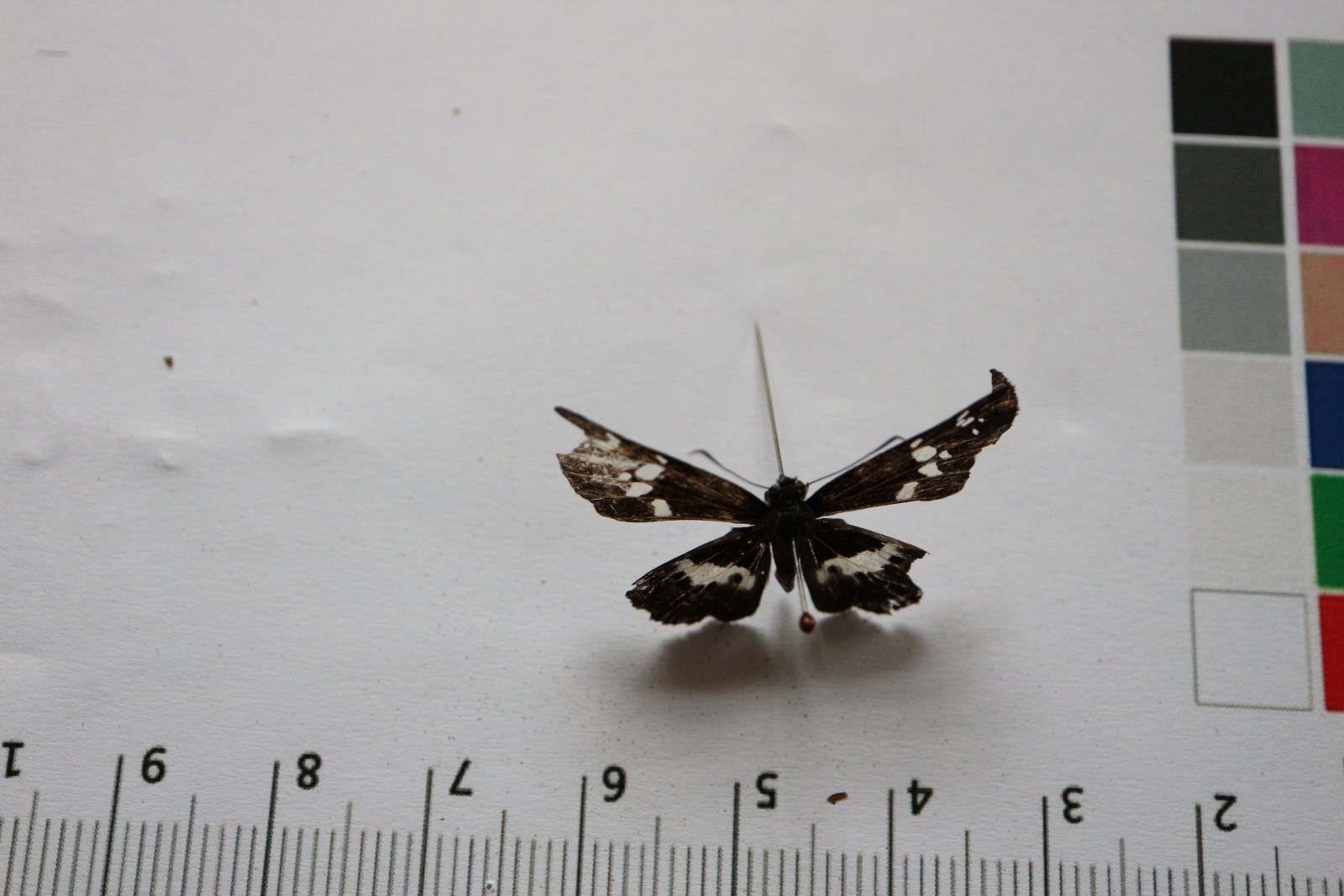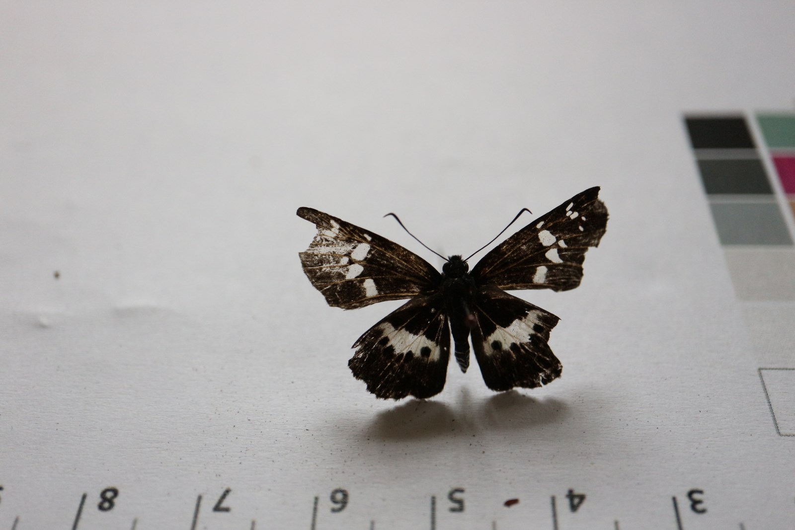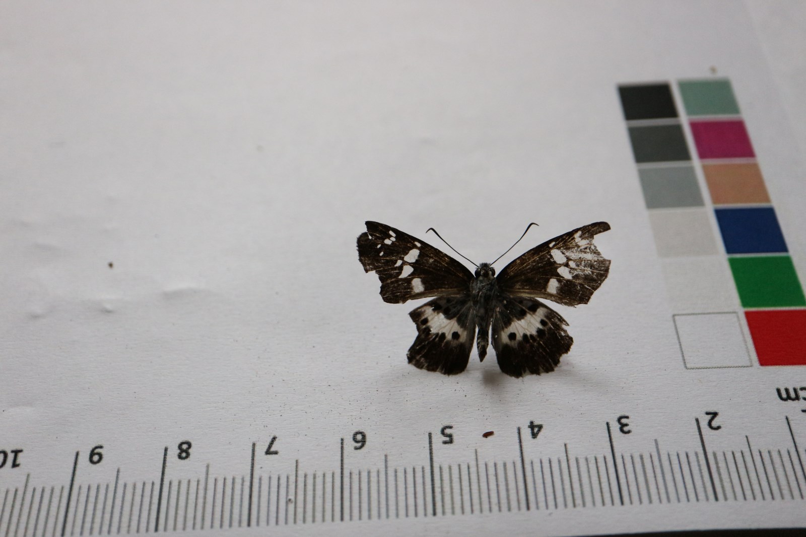 黑弄蝶成虫展翅3.0-3.3厘米,其翅面呈黑色,翅的边缘呈齿状,斑纹和缘毛均为白色。前翅的正面顶角处有3个小斑纹,其下侧有2个极小的斑点,中域还有5个大小不等的白斑排列。其中m3室斑外移;后翅中区有一个斑带,比较模糊。