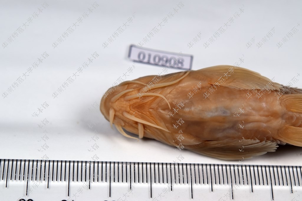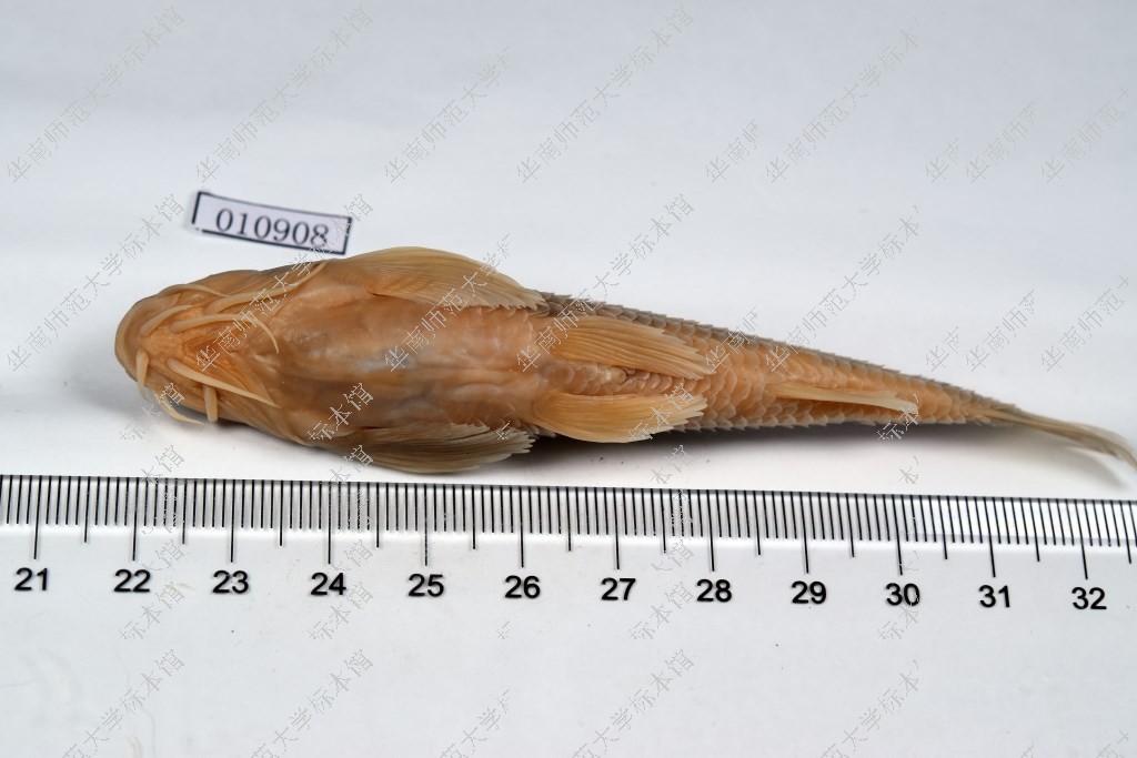 体长,头平扁。吻稍尖,被有微细皮质颗粒。眼大。眼间和颊部被有明显皮质条纹。须4对,稍短。背鳍基部之前的侧线以上的鳞片具有棱脊。夫妻基部前的胸腹部裸露无鳞。体背黄褐色,腹面灰白,头部及鳃盖为褐色,横跨背部有7-8个较大的黑色斑块,体侧正中有8-9个黑色斑块。