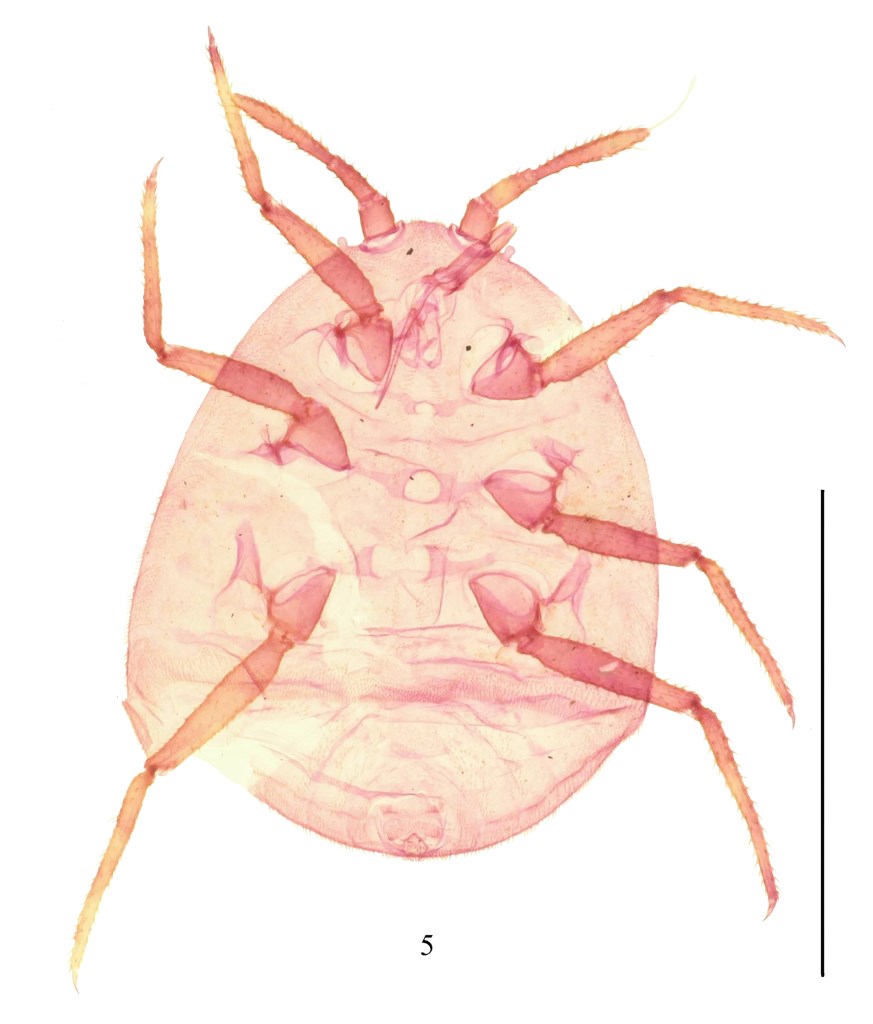 Body oval, brown or yellow. Wax protrusions short, located at the edges of the body and on the dorsal midline. Ovisac as long as body.Slide-mounted female(n=5). Body 1.13–1.37 mm long, 0.91–1.01 mm wide. Antennal segment lengths: 1st 70–109 μm, 2nd 98–146 μm, apical segment 241–335 μm, nearly parallel sided; spine-like setae on antenna each about 17μm long, apical seta 146–153 μm long, subapical seta absent; with 4 flagellate sensory setae, each 19–42 μm long, and 3 hair-like setae; occasionally blunted setae present. Eyes elongate, prominent, each 24–38 μm long. Body cuticle wrinkled, with surface sclerotized. Body margin with seta-like structures.Venter. Labium about 170–183 μm long; stylet loop as long as labium. Leg measurements: coxa: front 97–136 μm, middle 101–130 μm, hind 134–159 μm long; trochanter-femur: front 319–336 μm, middle 322–344 μm, hind 388–393 μm long; tibia-tarsus: front 338–391 μm, middle 372–395 μm, hind 428–460 μm long; claw: front 46 μm, middle 50 μm, hind 60 μm long; claw digitules: front about 9 μm, middle about 15 μm, hind about 15 μm long; legs with rows of robust setae, each seta about 19 μm long, tibia with 1 flagellate sensory seta, about 28 μm long; trochanter with 4 campaniform sensilla on each surface. Some individuals with tibio-tarsal joint faintly detectable, others without a tibio-tarsal separation. Thorax without wax plates. Ovisac band not enclosing rows of spines. Thoracic spiracles each with a cluster of quadrilocular pores laterad of spiracular opening, each group containing about 8-10 pores, each pore 4 μm in diameter; pore group surrounded by some thumb-like simple pores. Diameter of each anterior thoracic spiracle about 18 μm. Hair-like setae few, scattered in medial areas of thorax, with several setae near anterior edge of ovisac band, several associated with anterior and posterior multilocular pore rows. Multilocular pores, each 6 μm in diameter, with 6 loculi around perimeter and 1 loculus in central hub , present in weakly developed rows anterior to, and scattered around, vulva. Abdominal spiracles not seen.