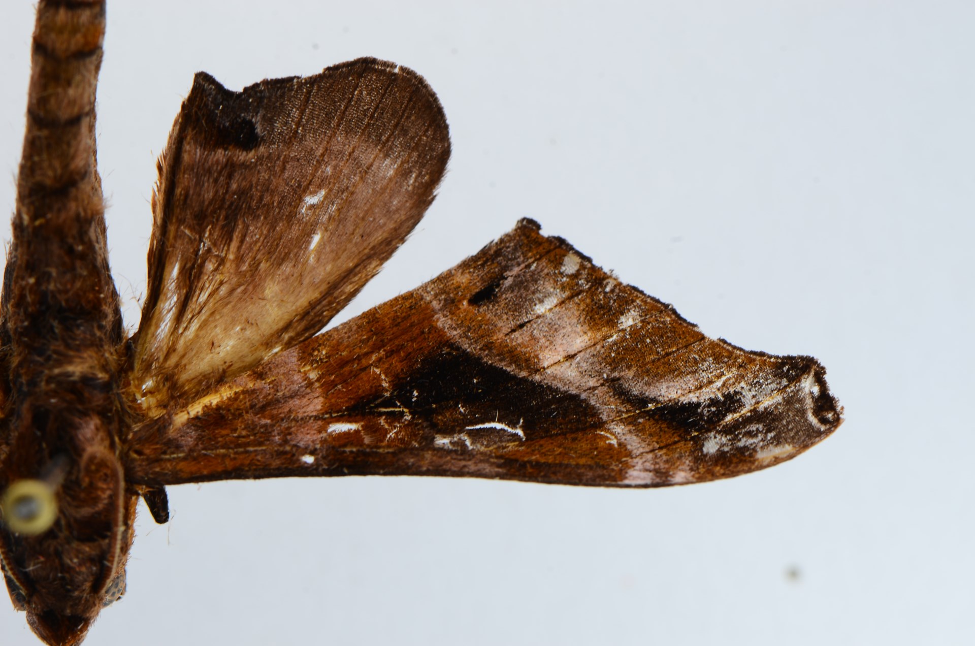 翅展40mm左右。体翅灰褐色。胸、腹背面色 较深。前翅内线较细不明显棕色,中线与外线间有一大块褐绿色斑,中室端有一白色点状斑。顶角呈截断状,内侧有赭黑斑及月牙形白纹,后角内上侧有一赭黑斑。后翅灰褐,后角有一赭黑色斑,翅的反面比正面色淡,自顶角顺外线下伸至后缘呈烟斗形纹。