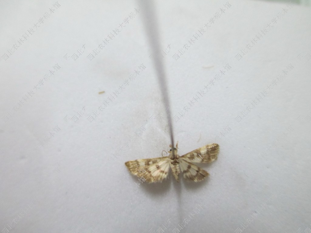 描述翅展17.0-22.0mm。额淡黄色。下唇须腹缘淡黄,背缘深褐色:第三节细长。领片和肩片淡黄色有褐色鳞片。胸部背面淡褐色,有深褐色斑纹。腹背深褐色,各节前缘白色。前翅黑褐色,翅基部有黄色斜条纹:前中线黄色,半圆形弯曲:中室圆斑黄色点状,其两侧有淡黄色方形斑纹;中室端脉斑黄色条状;后中线淡黄色弯曲;后中线内侧前缘及后缘各有一个淡黄色大斑纹,后缘黄色斑纹外侧有一条黄色细线。后翅黑褐色,翅基淡黄色:中室端有一个黑斑,黑斑外侧有一个大型黄色斑;后中线细弱弯曲。双翅缘毛褐色,臀角处淡黄色。