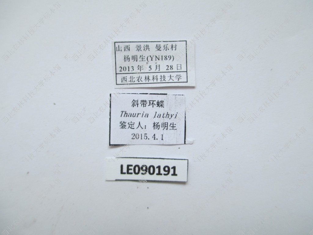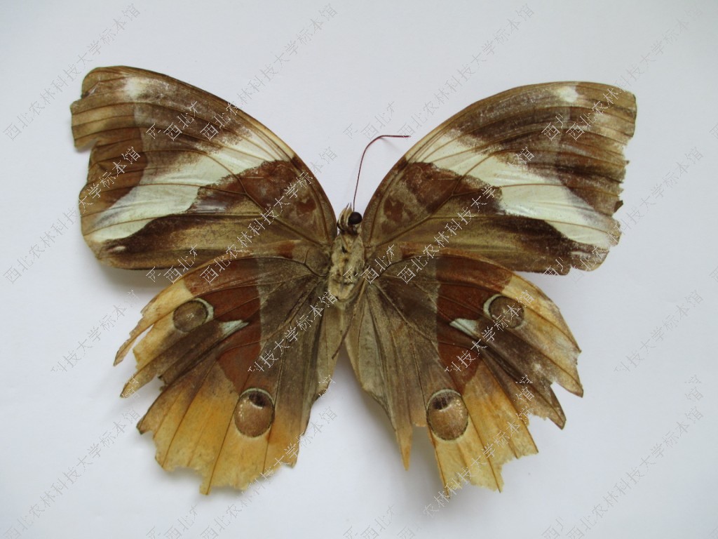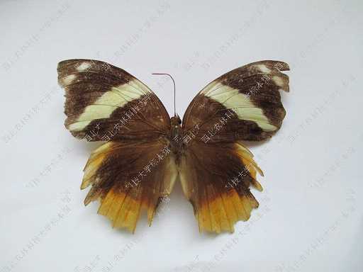 翅正面浅至黑褐色。前翅中部中室外部具一浅宽黄色斜带,自前缘脉中部延伸至臀角;亚顶区缘室r5和m1内各具一枚短白色斜带,均与宽黄色斜带平行。后翅顶区及臀角区橙色,其余无明显斑纹。 翅反面红棕色或赫石色,斑纹与正面大致相同。后翅m1和cu2始各具一圆型褐色眼斑,前者瞳点白色,眼眶黑色,后者无明显瞳点,但具一黑色斑点,眼眶黑色;后翅中部具一楔形红棕色直带,自前缘延伸至后缘,逐渐变细。