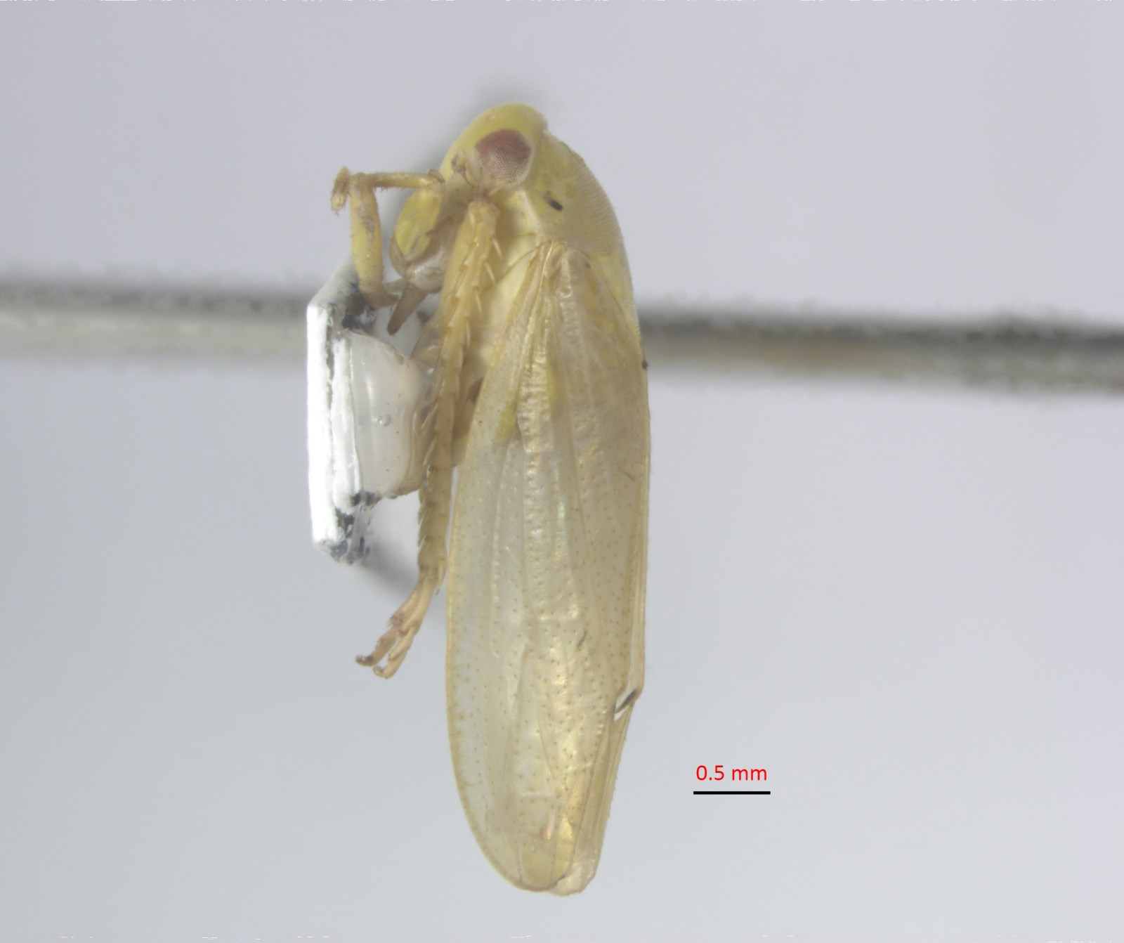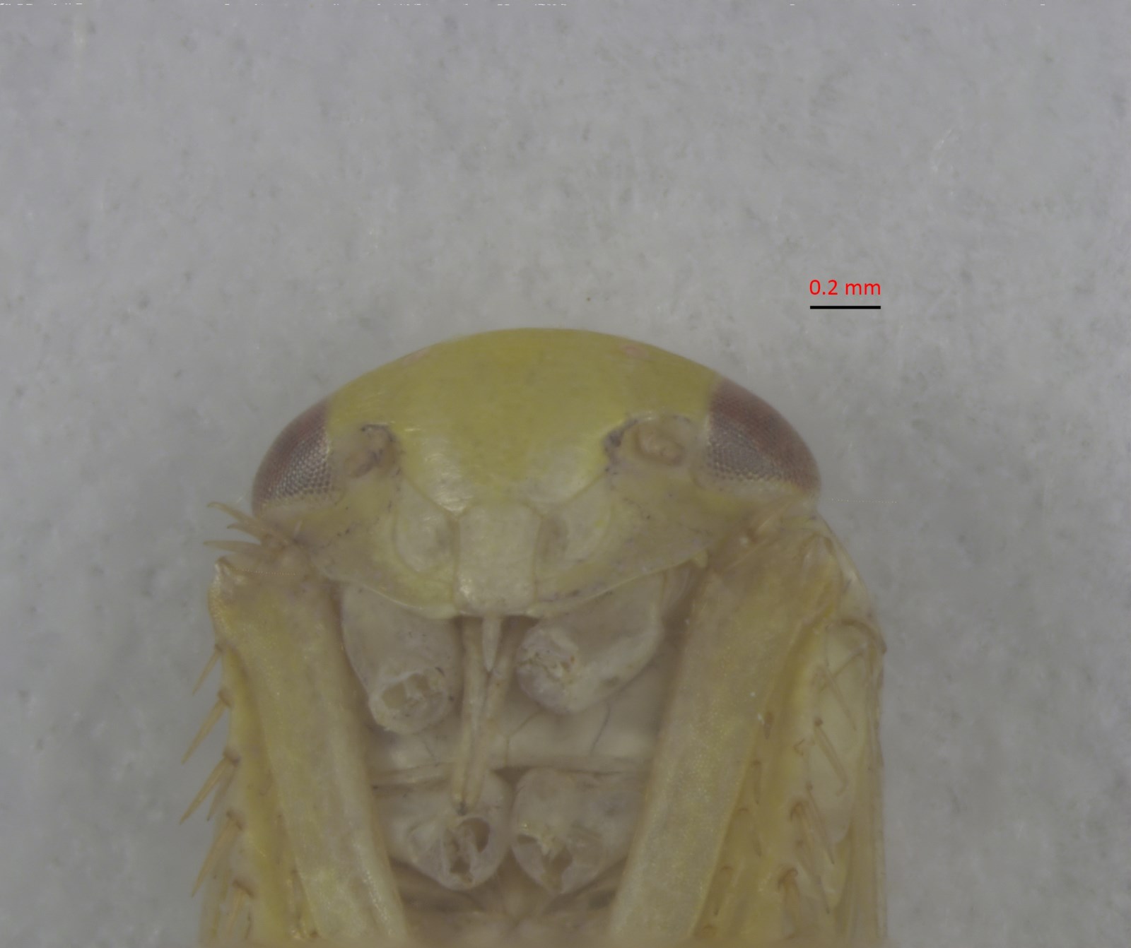 描述头冠淡黄白色,复眼褐色,单眼黄白色,颜面黄白色,无斑纹。前胸背板前缘淡黄白色,中后部淡黄微带绿色泽;前翅淡黄白色,翅脉淡黄绿色,爪片末端有褐色斑,胸部腹板和胸足淡黄白色。腹部背面淡黄微带绿色泽,腹面黄白色,无斑纹。雄虫尾节侧瓣宽大,端半部近长方形,端区有粗长刚毛,腹缘内突末端三叉状;下生殖板骨化程度低,近乎膜质,中部膨大,基部内缘和端部外缘均着生细长刚毛;阳茎腔复体细小,阳茎干腹面观粗宽,端腹缘从中部向两侧卷折呈小旗状齿突,侧面观端部背缘具强烈细齿,性孔裂缝状,背腔宽扁;连索“Y”形;阳基侧突较长,亚端部膨大,端部骤然变细。