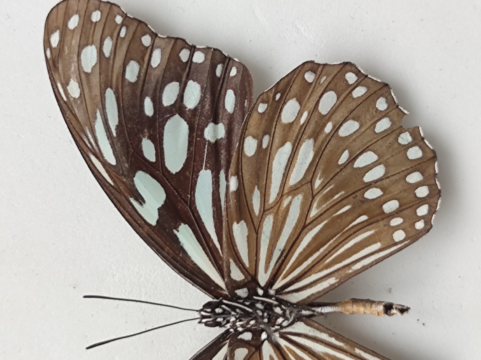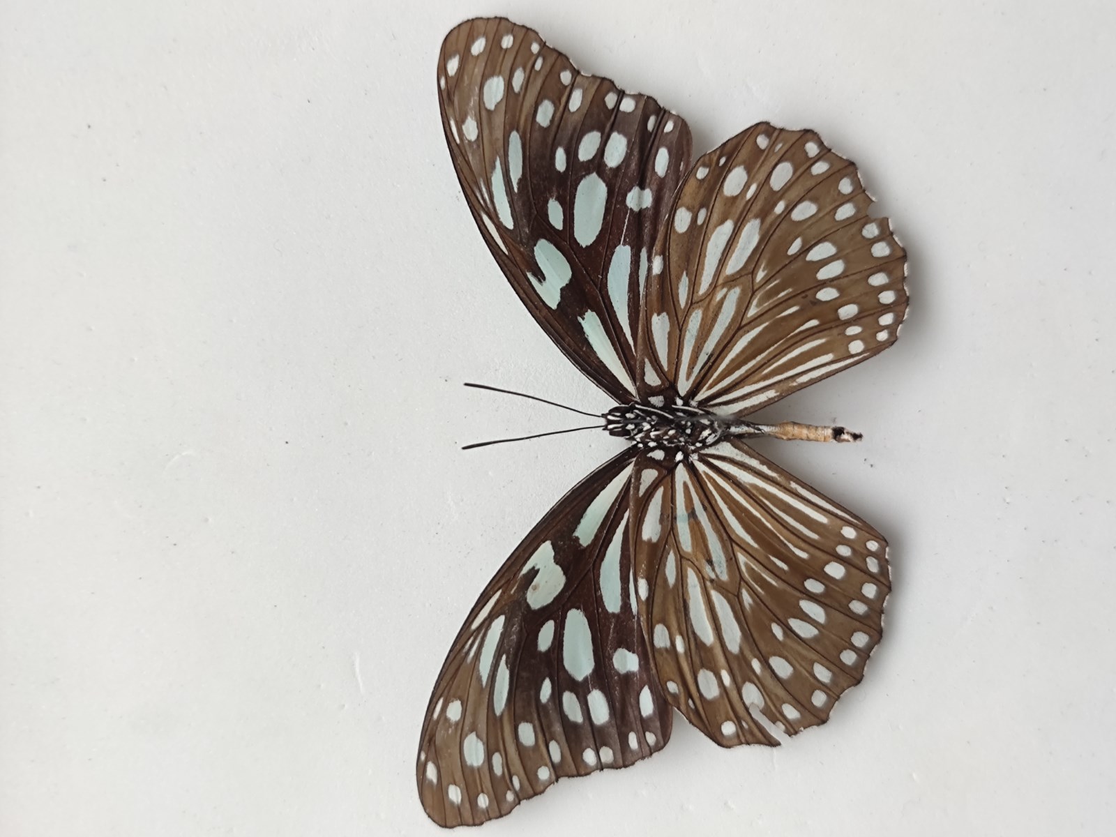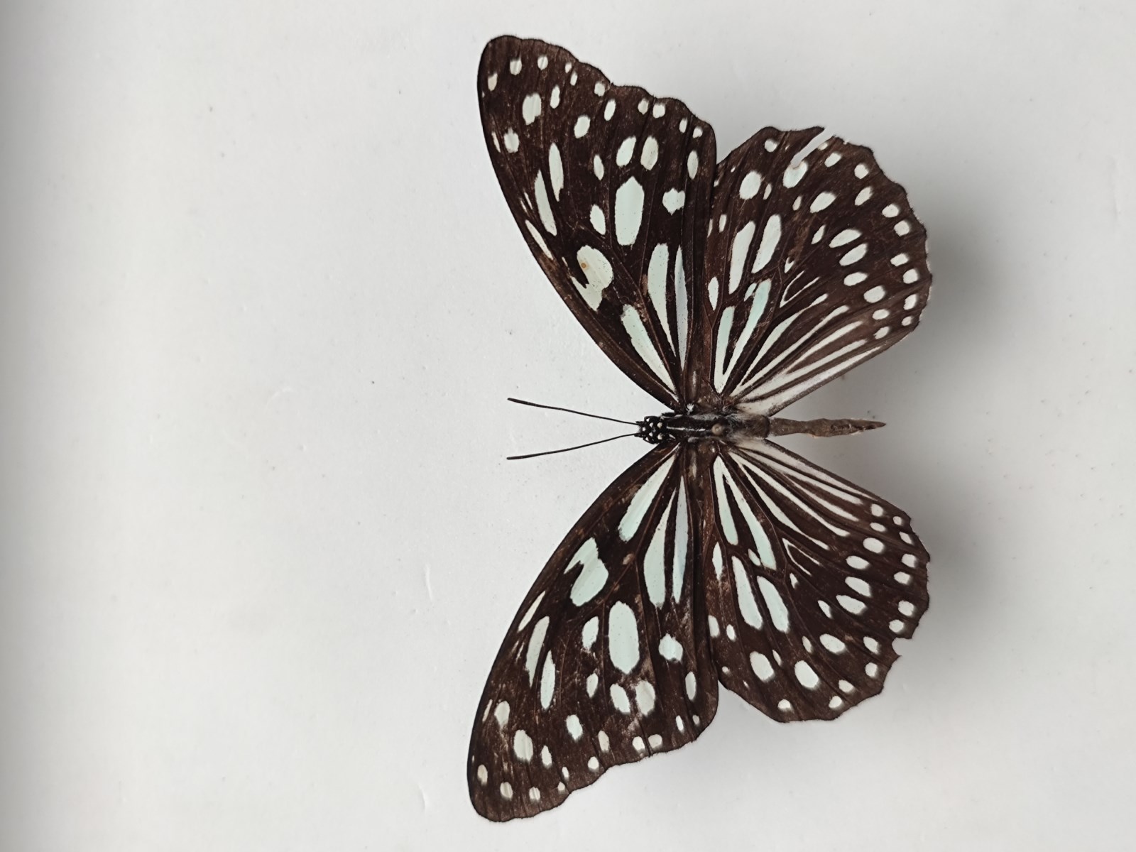 中型班蝶。身体黑褐色,带白色斑点及线纹,腹部腹面橙色,节间带白纹。翅底色为黑色,布满半透明淡蓝色的斑纹,其形状 由接近基部长条状,至靠外缘的斑点伏。翅腹面斑纹大致相同,但底色较淡。雄蝶后翅cu?室内有带状性标。常常出现淡蓝色斑纹较发达的个体。