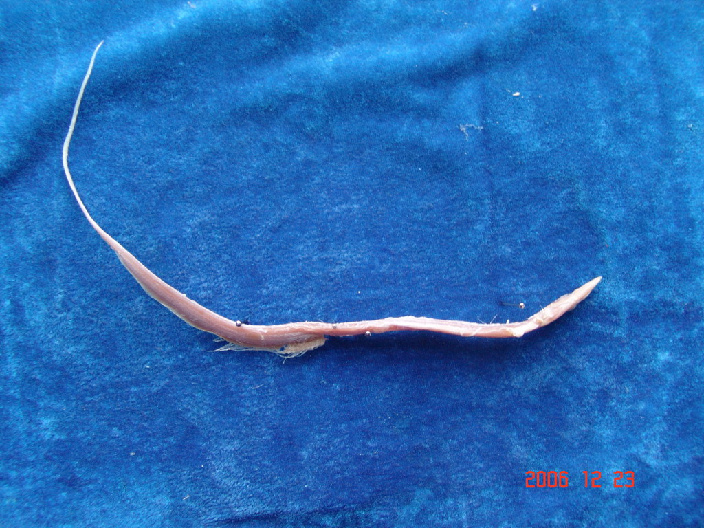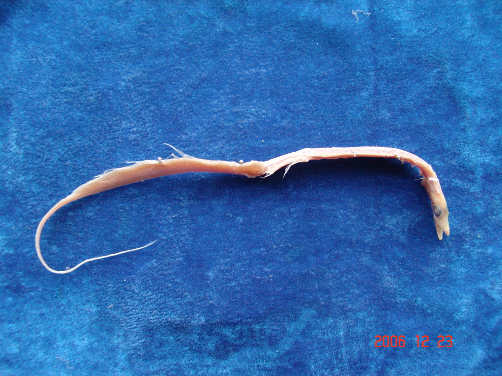 小带鱼(学名:Eupleurogrammus muticus)为带鱼科小带鱼属的鱼类。分布于印度洋北部沿岸、东至日本、南至印度尼西亚以及沿海等,属于近海暖温性鱼类。其多栖息于沿海浅海的中下层。体甚侧扁,延长呈带状,背腹缘平直,向后渐细呈鞭状。头狭长,侧扁,背面凸起,两侧平坦,吻端尖突。时底拖网渔具和沿岸定置渔具可兼捕到。可鲜食。欲称带鱼条子、鳞刀梢、小金叉。硬骨鱼纲、鲈形目、带鱼科。系暖温性近海中下层鱼类。体甚侧扁,延长呈带状,背腹缘平直,向后渐细呈鞭状。头狭长,侧扁,背面凸起,两侧平坦,吻端尖突。口大,前位,前部较平直,后部斜裂。下颌长于上颌。齿发达,上颌前端有钩状犬齿3枚;下颌前端有犬齿2枚,口闭时外露于上颌前端。眼中大,侧上位;眼间隔圆凸,中间有1纵脊至吻端。鼻孔每侧1个。鳃孔大。尾部长稍大于全长2/3。背鳍1个,基底几乎与背缘等长,鳍条较长。胸鳍小,侧下位,鳍条上翘,向下渐短。腹鳍退化,仅留1对小片状突起。臀鳍由甚短的分离小棘组成,仅棘尖外露皮外。尾鳍消失。体光滑无鳞。有侧线,在胸鳍基上近平直延伸至尾端。体银白色。尾黑色。各鳍均灰色。全长一般为10—40厘米。喜栖息于浅海的江河口附近咸淡水混合处水域。有时也进入淡水索饵。主要食物为小型鱼类、甲壳类。1龄可达性成熟。生殖期6—8月。卵生。我国沿海均有分布,现数量极少。有时底拖网渔具和沿岸定置渔具可兼捕到。可鲜食。
