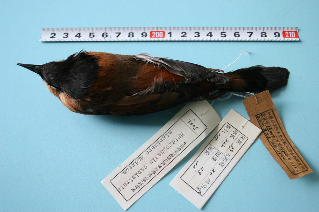 背部中央棕褐色,棕色较浓,最内侧次级飞羽栗色部分较宽,外侧浅蓝灰色边缘较窄………………………………………珠峰亚种H.c.nigriceps