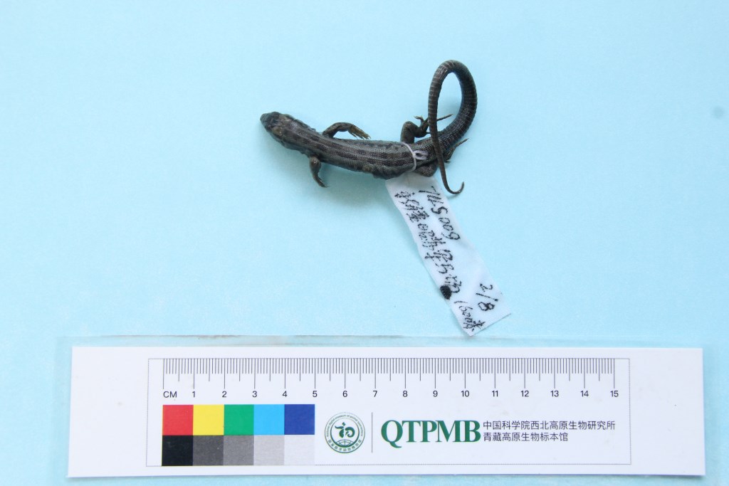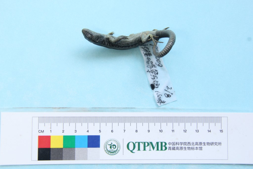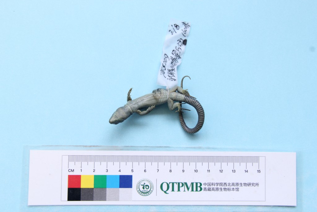 描述鉴别特征 头背具对称大鳞,躯干背面被粒鳞,躯干腹面具纵横成行的长方形平滑大鳞。后鼻鳞2枚,无鼓膜前鳞,领围游离缘居中1枚鳞片最大,中段一横排背鳞40-45枚,股孔每侧12-17个。 形态 全长雄性(86+150)mm(尼勒克),雌性(92+141)mm(尼勒克)。 体型修长适度。头长大于头宽,略呈三角形,吻端圆钝,吻鳞宽大于高或宽与高约相当,其上缘中央向后尖出,从前方看呈五角形;吻鳞之后为一对彼此相切的上鼻鳞(吻鼻鳞),吻鳞上缘的尖角楔入其间;之后为一单枚略呈菱形的额鼻鳞;再后为一对彼此相切的前额鳞;头顶较大而呈窄长五角形的额鳞介于左右眶上鳞之间;眶上鳞每侧4枚,中央2枚最大,前后2枚较小;额鳞之后、左右后2枚眶上鳞之间为一对彼此相切甚多的额顶鳞;头背最后的一对大鳞为顶鳞,彼此常为其间单枚顶间鳞与其后的一枚小鳞完全分开不切,顶鳞后缘较平直,顶间鳞中央可见一白色点即顶眼。鼻孔位于靠近吻端的两侧,圆形,开口向外侧,由上鼻鳞、2(偶为1或3)枚后鼻鳞与第一上唇鳞围绕而成。鼻孔与眼之间主要为一枚较大的颊鳞,有的后鼻鳞与颊鳞之间尚分化出1-3枚小鳞,都计入颊鳞数目。眼大小适中,瞳孔圆形,下眼脸被鳞;眼周的鳞片有上睫鳞、眶前鳞、眶后鳞与眶下鳞围成一圈;上睫鳞为位于眼上方、眶上鳞外缘的一列窄长鳞片,2-5(4-5枚最多)枚,构成上睫脊;眶前鳞与眶后鳞分别位于眼前后方,较小,仅眶后鳞上枚较大,与上睫鳞相续;眼下有一列极小的粒鳞。眼后至耳孔前缘之间的颞区有若干大小不等的平滑鳞片,以切顶鳞外缘的2-3枚鳞片中的前枚最大,切耳孔前缘的鳞片都较小。耳孔较大,竖立椭圆形,恰位于口角后上方,其后缘与顶鳞后缘几乎在一直线上;耳孔后缘较平直,故有的标本耳孔略呈半月形;外耳道凹陷不深,鼓膜明显可见;除耳孔前缘上部围以颞区鳞片稍大外,耳孔周缘其余部位都围以较小的粒鳞。头侧口上缘的上唇鳞每侧5-8(常为7)枚,口下缘的下唇鳞每侧5-7(常为6)枚;下颌前端与吻鳞相对应的颏鳞宽大于高,且较吻鳞略宽;颔片5对,第四对最大,其中前2-3对相切,后2对为窄长的小鳞分开。上、下唇鳞与颔片的数目相当稳定,据所观察80号标本,上唇鳞每侧主要是7枚,只8号标本(10%)的一侧有变异,下唇鳞每侧主要是6枚,只3号标本(3.75%)的一侧有变异,如少于或多于此数1枚者,可以看出基本上是原有数目鳞片两枚愈合为一或一分为二形成的;至于颔片则无一例外都是5对。头腹的其他鳞片都较小,平滑而略凸出,往后过渡到颈腹的较大的平滑鳞片;领围显著,其游离缘为8-12(常为9-10)枚扁平的平滑大鳞片,居中1枚最大。躯干背面及侧面被覆较小粒鳞,中段自左至右一横排有小鳞40-45枚,从解剖镜下可见两侧粒鳞平滑,中央若干行起棱;躯干腹面被覆排列整齐、纵横成行的长方形平滑大鳞6纵行,中央2行最小,与之相邻的2行最大,外侧2行的大小介于上述二者之间。四肢短小而壮实,前后肢贴体相向时,指趾不相遇或略超越,后肢贴体前伸趾尖仅达体中部。前肢上臂与前臂前背侧被覆大的平滑鳞片,腋下、肘部及上臂与前臂的后内侧被覆较小的平滑鳞片;后肢股与胫前背侧被覆大的平滑鳞片,背面者大而扁平,腹面者较小;指趾均较粗短,仅由背腹两枚鳞片围成,爪亦位于背腹两枚鳞片之间。股孔每侧12-17(多为14—16)个。尾圆柱形,基部背面略平,往后逐渐变尖细,被覆长方形起棱大鳞,鳞游离缘中央尖出,各鳞排列整齐,形成环状构造,但不再分为节。尾的长度变异甚大,正常尾从约与头体长相等(1.03)到头体长的2倍以上(2.18),其中尾较短者,其结构与正常尾并无差别,与断后剑侠或再生尾不同。
