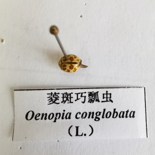 成虫:体长约5mm,宽约4mm。头部黄白色,有时后缘有2黑斑:复眼黑色,口器、触角黄褐色。前胸背板及鞘翅呈黄褐色或紫红色,前胸背板上具7个小黑斑。小盾片黑色或同体色而有黑色边缘。鞘翅上各具8个不同形状的黑斑。呈2、2、1、2、1排列。鞘缝黑色。腹面大部分黑色,仅外缘及端部黄褐色。足黄褐色。