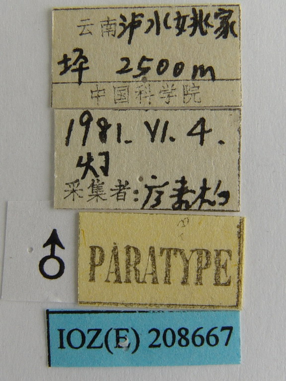 雄外生殖器爪形突端部稍膨大, 抱器腹上半部分叉, 腹缘细长, 背缘在顶端成叉状, 抱器背背缘中部有一较大指突, 阳茎中部及上部有小刺突, 上部较少, 中部较多。