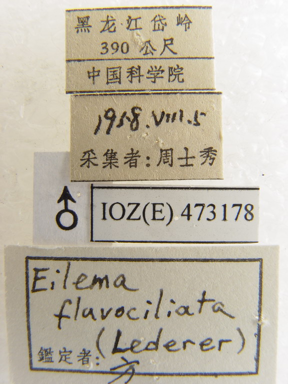 翅展24~31mm。头、胸橙黄色, 触角除基部外黑色, 腹部橙黄色, 背面基半部灰色;前翅橙黄色, 基部1/3具黑边, 反面前缘外半及外缘橙黄色, 其余暗褐色;后翅暗褐色, 后缘区稍黄, 缘毛橙黄色, 反面同正面。有些个体翅色变暗。