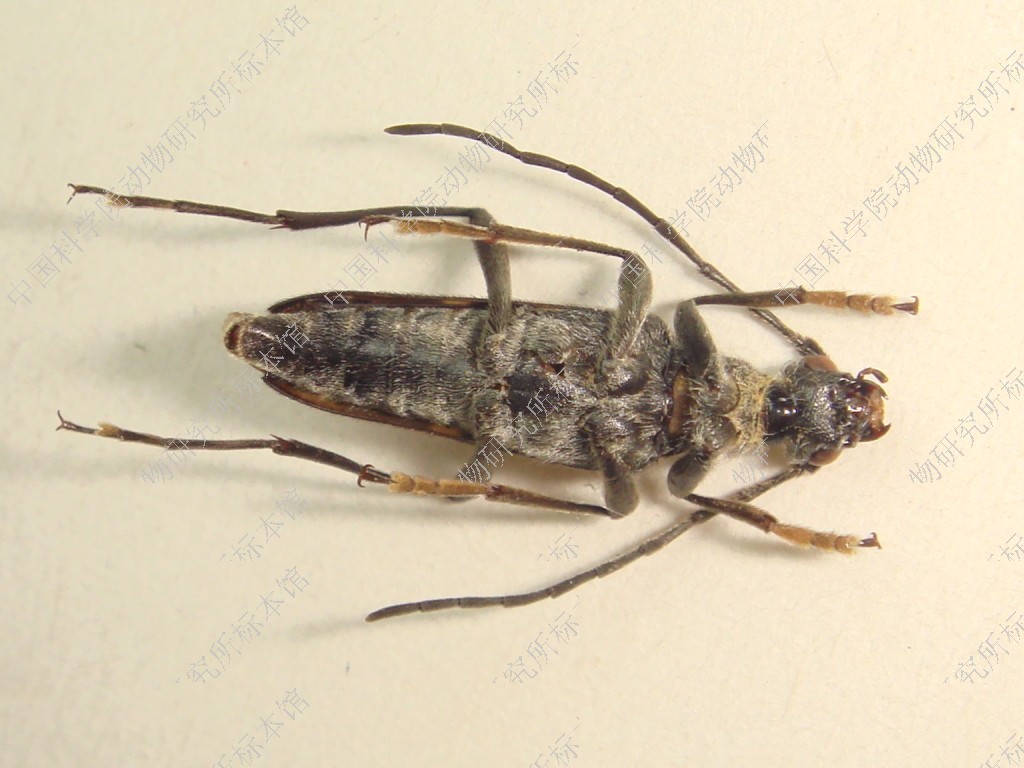 体长11.0-18.0毫米。体黑色,每个鞘翅有六个黄褐小斑纹:靠中缝从基部至中部稍后有一列三个斜斑,近侧缘有一列二个小斑点,端部为一个横斑;头、胸被灰黄色绒毛,鞘翅绒毛稀而短,体腹面密生绒毛。触角一般达鞘翅中部稍后;前胸背板前端窄,后端宽。小盾片三角形,着生极细密刻点。鞘翅刻点细密,端缘凹切,外端角尖锐,缝角明显,腹部末节长胜于宽,突出于鞘翅之外。