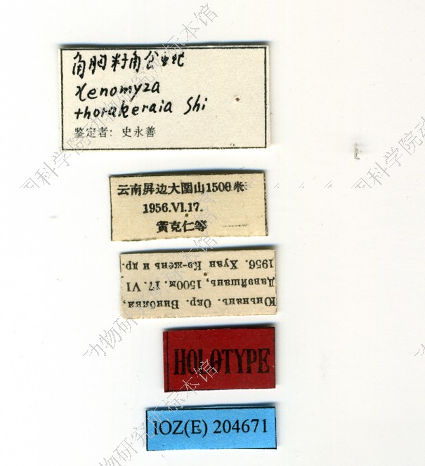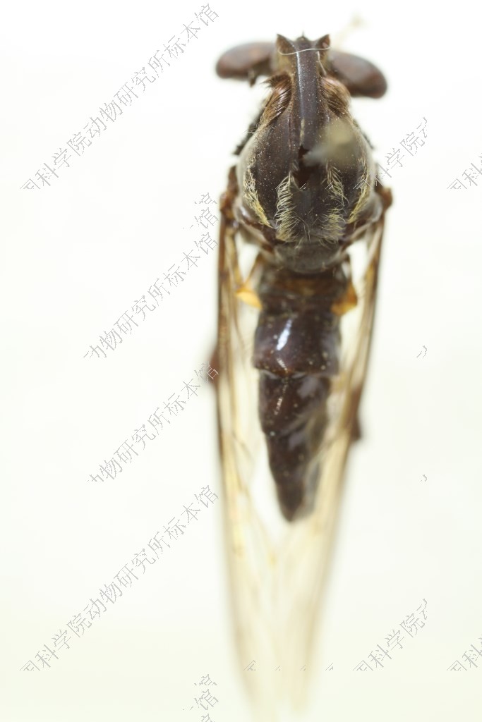 胸部黑色,覆淡黄绵毛,被黑毛,后部被少量淡黄长毛,肩胛黑色,胸部各侧片黑色,覆淡黄绵毛;小盾片黑色,背面覆淡黄绵毛,后缘被淡黄毛。足红棕色,前足腿节膝部黑色,后足腿节长而加粗,腹面全长具粗鬃,中部具宽阔黑环,胫节端半部黑色,跗节黑色。翅烟褐色,缘室和5个后室均开放,臀室闭合具长柄,前横脉位于中室后方1/3的部位,平衡棒黄褐色。