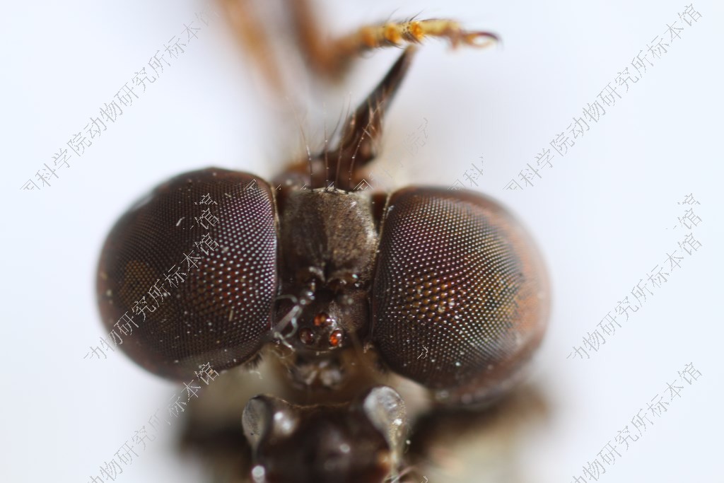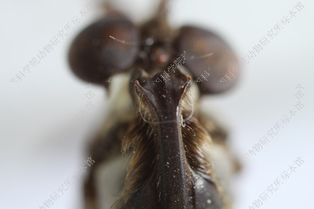 头部宽于胸部,黑色,覆金黄色绵毛,口鬃黑色,一行4根,额鬃和单眼鬃缺如,后头黑色,覆淡黄色绵毛,被淡黄毛,无后头鬃,触角黑色,第1节短,为第2节长度之半,腹面具一根黑鬃,第3节念珠形,触角芒红棕色,端部白色,下颚须黑色,被黑鬃,喙黑色。