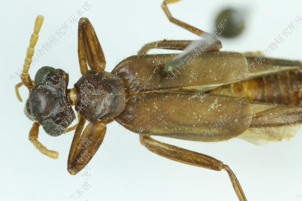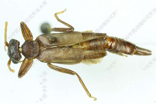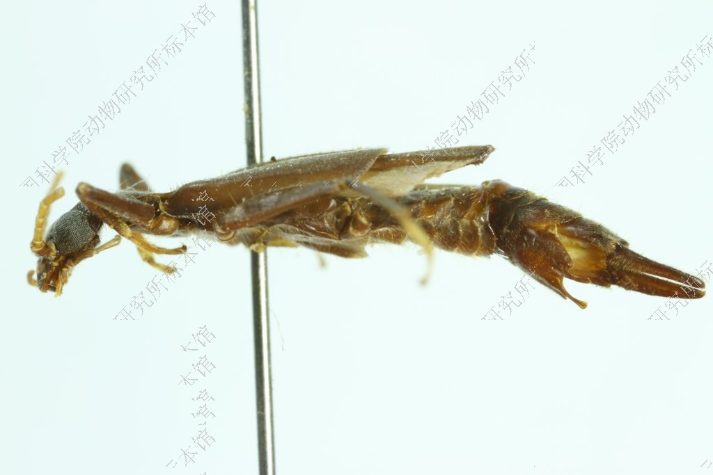 描述 体型相对较长大,暗栗色,有时触角、前胸背板和足颜色较浅,鞘翅多为褐色。头部宽大,眼部最宽,两侧向后变窄,后角稍圆,后缘弧凹形,额部稍圆隆,雄虫的头缝不明显; 复眼大而突出,大于面颊长,眼后脊较高;触角细长,17节,浅黄色或黄褐色,基节较粗,暗褐色,第2节长短于宽,第3节长稍大于宽,第4节长宽几等,第5节约与第3节等长,其余各节较长。前胸背板长宽几等,两侧向后稍变窄,后角连同后缘为直弧形,表面前部圆隆,中沟稍显。小盾片短三角形。鞘翅狭长,两侧平行,端部稍圆;后翅发达,翅柄约为前翅长的1/3。腹部狭长,圆柱形,末腹背板接近方形,后缘弧凹形,表面圆隆,光滑;雄虫亚末腹板后角呈直角形,后缘中央凹,两侧各有1个末端扩大的突叶(图34, a);雌虫的末腹背板两侧向后变窄;亚末腹板较狭长,舌形,末端圆。尾铗扁而直,基部宽,外侧向后逐渐变窄,顶端尖。足稍长大,腿节较粗,后足较长。雄性外生殖器后部较宽,阳茎端刺细长,端部尖,阳茎基侧突小而尖,内外侧向后强度变细(图34, b)。
