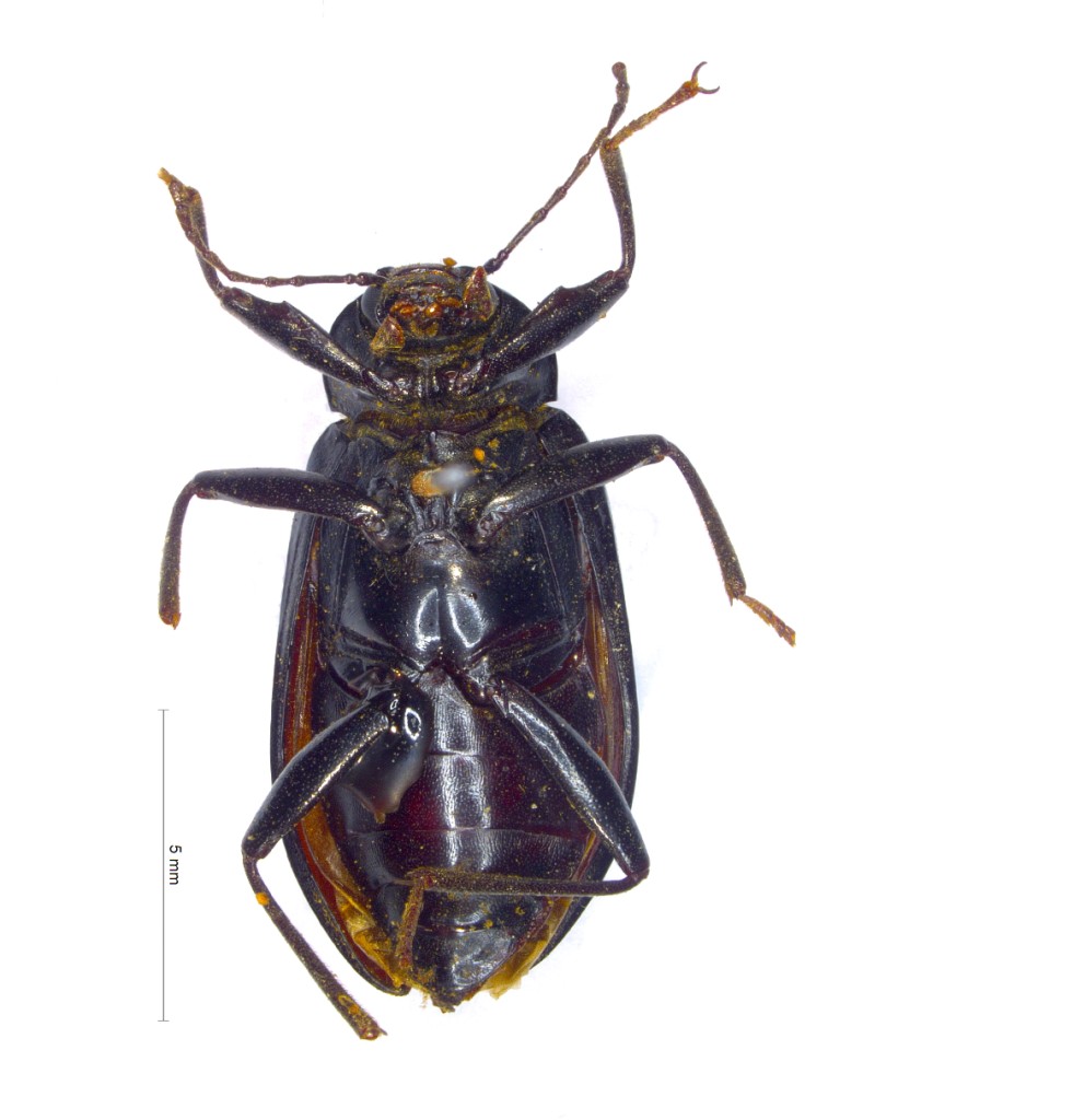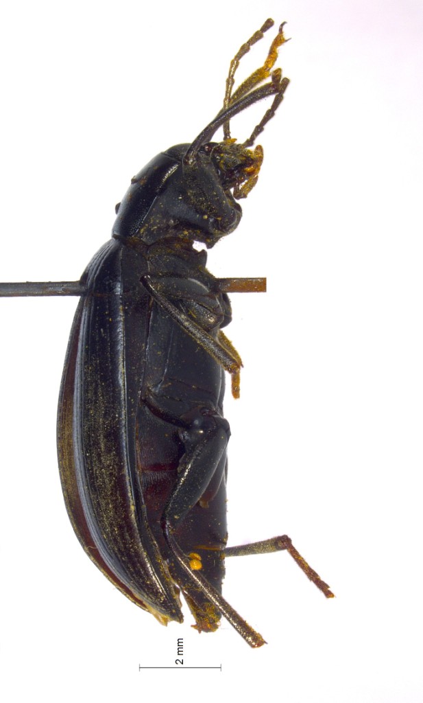 描述长椭圆形,均匀隆起。黑色,发光;触角红褐色,跗节红棕色。额刻点小而密,头顶刻点粗密,几乎彼此连接;唇基缝细凹,U形,两端伸达外缘;唇基宽,两侧近平行,布密刻点;颊向侧面适度翘起;♂性眼间距约是其自身横径的0.3倍,♀性略宽。颏近心形;外咽片抛物线状,扁凹。触角伸达鞘翅基部1/3,从基部到端部各节长度之比为:0.7,0.3,1.6,0.9, 1.1,1.0,0.9,0.85,0.8,0.8,1.0。前胸背板梯形,宽大于长1.65倍,基部1/3最宽,向端部圆缩,向基部微弱变窄;前缘几乎直,饰边清晰;基部略向后突出,中间1/3圆突;侧缘饰边细, 轻微延展,背面观可见;盘区布不规则刻点。小盾片三角形,布细小的刻点。鞘翅长大于宽1.5-1.7倍,是前胸背板长的4.2倍,宽的1.3-1.5倍;背面基部2/5最高;盘区刻点线细而清晰;行间宽,微隆,具小刻点和横纹;两侧端部2/5最宽,向基部逐渐变窄,向端部圆缩,侧缘细饰边清晰,背面观易见。前胸腹突钝伸;腹部两侧扁凹,具细皱纹;♂性肛节端部直截。前足腿节端部1/4具齿;♂性前足胫节基半部微弯,端部4/7内缘加粗具密毛;中足胫节端半部具金黄色密毛;前、中、后足各部分长度之比为:腿节:5.6,6.0,6.7;胫节:5.0,5.5,7;跗节各节从基部到端部各节长度之比为:0.6,0.3,0.25,0.2,1.1;1.2,0.5,0.4,0.3,1.2;2.0,0.7,0.4,1.4。♂性阳茎长5mm,宽1.0mm,基侧突延长,端部匙状,基板/基侧突=3,基侧突长/宽=1.5。