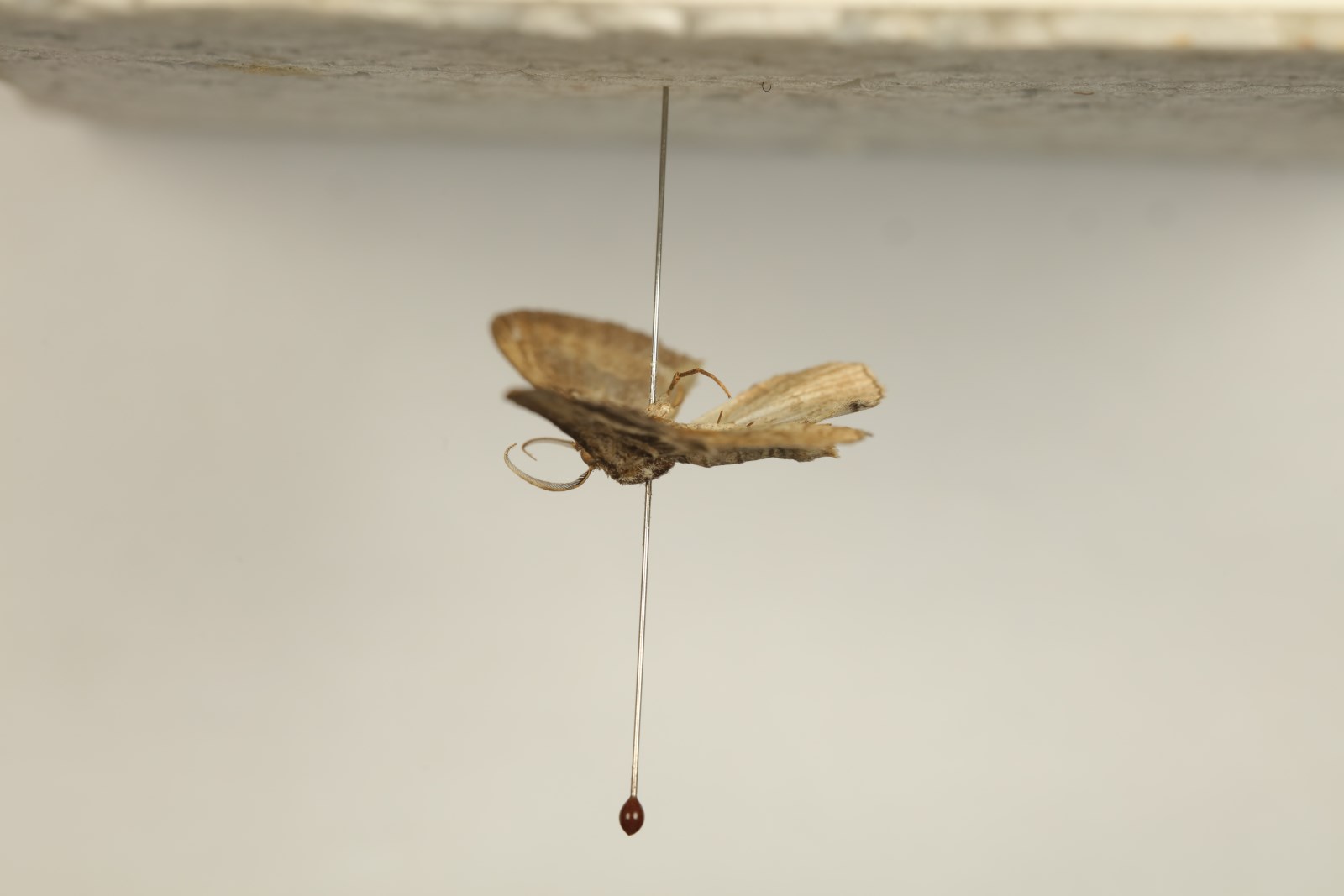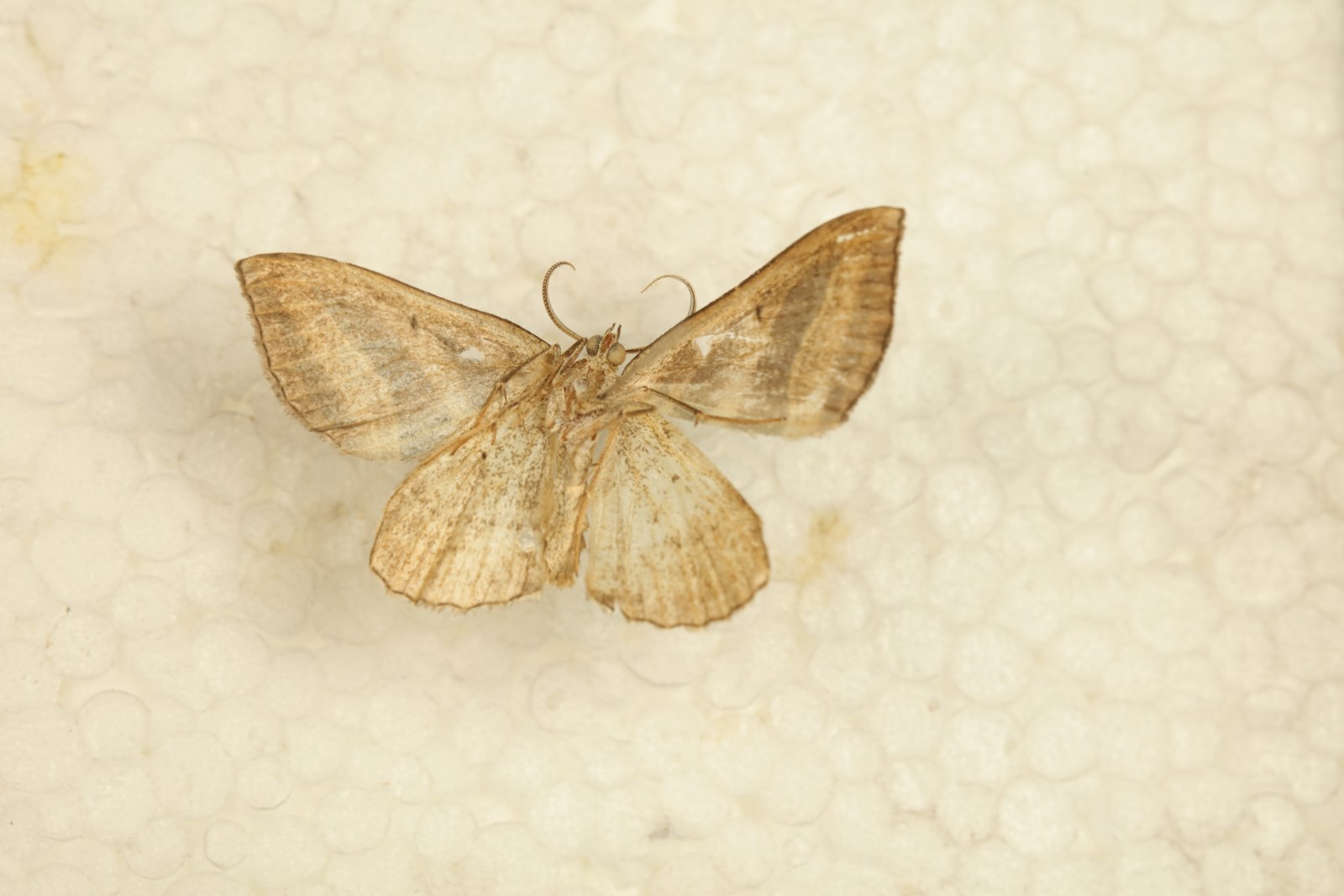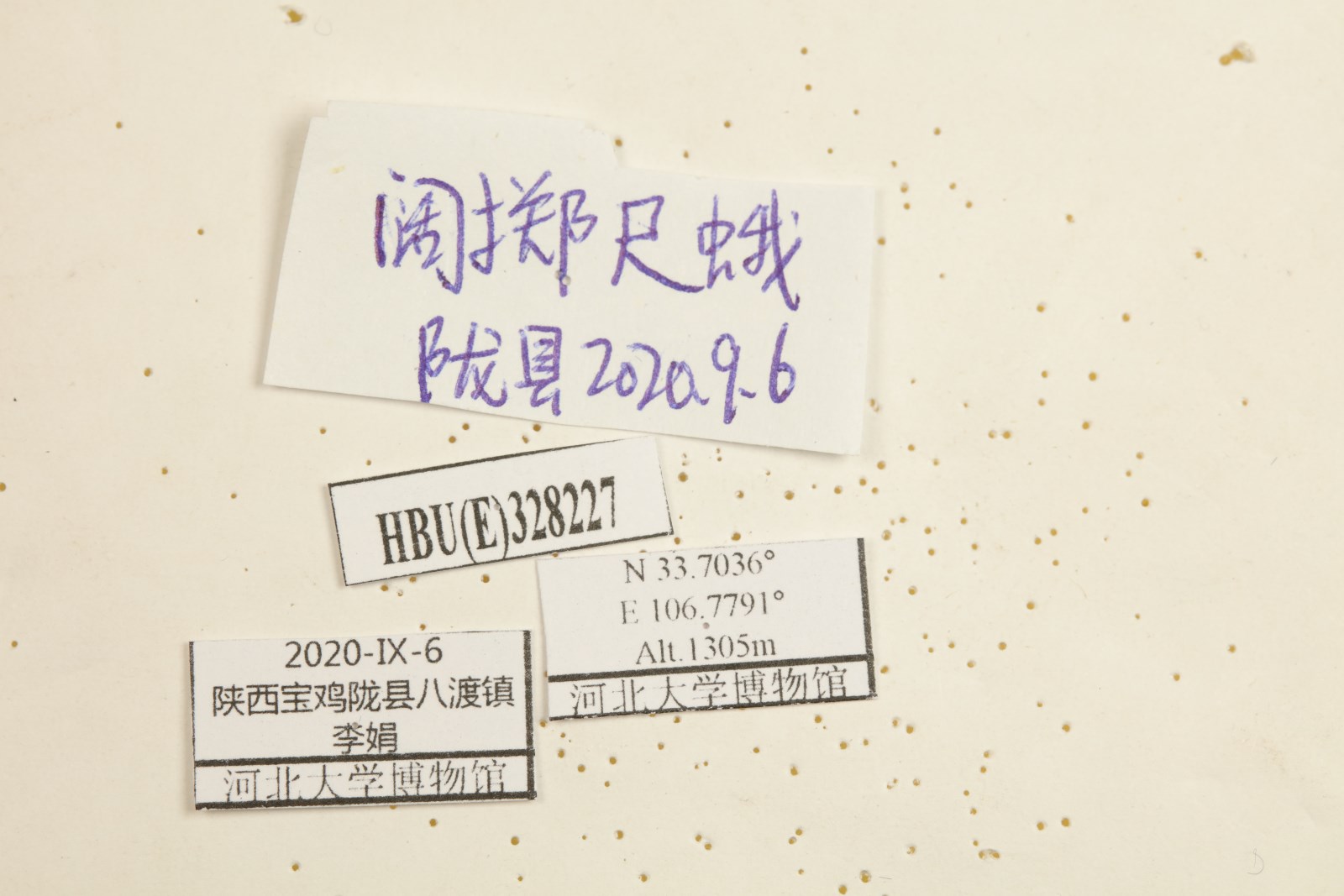 描述前翅长:♂17~20 mm,♀18~21 mm。头和胸背深灰褐色与灰黄色掺杂,腹部背面灰褐色。前翅黑褐色,大部分为污白色条带所覆盖,只留下几个黑褐色楔形斑;前缘有一条由翅基直达顶角的污白色纵带,其下缘在中室前缘脉下方,前缘至Sc之间散布灰褐色;内线、中线、外线各为一条污白色带,其中内线和外线各由4条白线组成,前者上端向顶角方向倾斜,后者接近外缘,呈弧形弯曲;中线与后缘近于垂直,最大宽度约1.5 mm ,但其下端常不同程度消失,有时中线完全消失;亚缘线污白色纤细,其外侧色较浅;缘线黑褐色纤细;缘毛灰褐色,基半部色较深。后翅白色,灰色中点极微小,通常无外线和亚缘线,在少数个体中可见灰褐色外线残迹和亚缘线;翅端部略带灰褐色,缘浅深灰褐色,缘毛基半部土灰色,端半部灰白色。前翅反面隐见正面斑纹,前缘附近和翅端部散布黄褐色;后翅反面污黄色,翅脉黄色,散布大量褐鳞,前后翅反面均有深褐色中点。雄性外生殖器:钩形突细。阳茎基环侧突棒状。囊形突宽度大于背兜。抱器背短小,具一对小突;抱器腹极发达,端部延伸并包在抱器瓣端部之外,呈矛状。阳茎粗大,直径大于背兜上端宽度,无角状器。雌性外生殖器:前表皮突短小。前阴片骨化宽大。囊导管短粗,骨化。囊颈骨化并膨大,扭曲。囊体膜质,具一片由微刺组成的囊片,近圆形。