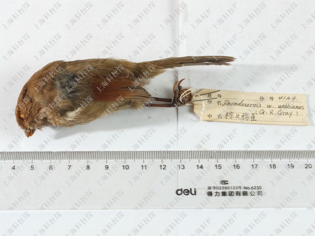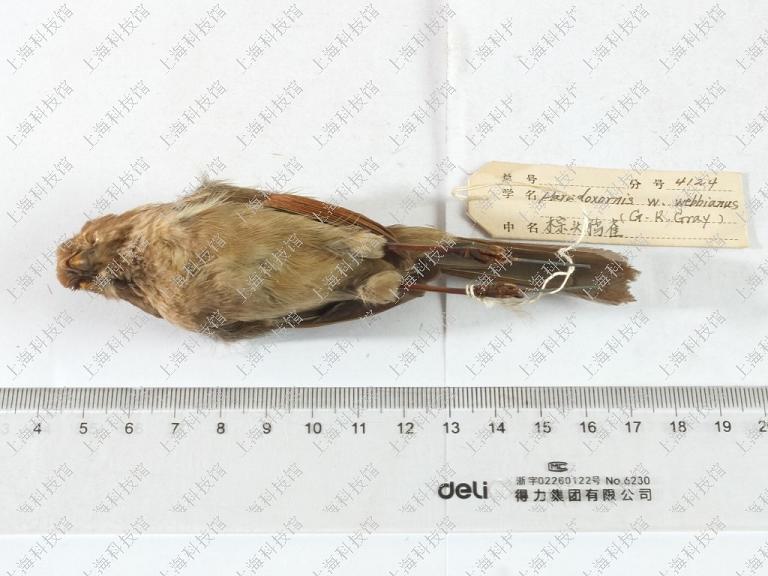 描述棕头鸦雀(学名:Paradoxornis webbianus)一种全长约12厘米。头顶至上背棕红色,上体余部橄榄褐色,翅红棕色,尾暗褐色。喉、胸粉红色,下体余部淡黄褐色的鸟类。常栖息于中海拔的灌丛及林缘地带,分布于自东北至西南一线向东的广大地区,为较常见的留鸟。雌雄羽色相似。额、头顶至后颈有时直到上背均为红棕色或棕色,头顶羽色稍深,眼先、颊、耳羽和夹侧棕栗色或暗灰色。背、肩、腰和尾上覆羽棕褐色或橄榄褐色,有的微沾灰、呈橄榄灰褐色。尾羽暗褐色,基部外翈羽缘橄榄褐色或稍沾橄榄褐色,中央一对尾羽多为橄榄褐色具隐约可见的暗色横斑。两翅覆羽棕红色或与背相似,飞羽多为褐色或暗褐色,除小覆羽和第一枚飞羽外,其余各羽外翈均缀有深淡不一的栗色或栗红色,往先端逐渐变淡,内翈羽缘淡棕色或淡玫瑰棕色。颏、喉、胸粉红棕色或淡棕色具细微的暗红棕色纵纹,腹、两胁和尾下覆羽橄榄褐色或灰褐色,腹中部淡棕黄色或棕白色。 虹膜暗褐色,嘴黑褐色,脚铅褐色。"头顶暗葡萄棕色;背棕褐;两颊和耳羽以及颏、喉、胸等部概为灰色。量衡度:性别 体重 体长 翅长 尾长♂♂(3) 9 109—112 49—51 58—63♀♀(2) 9—9.5 112—116 46—49 60—65"