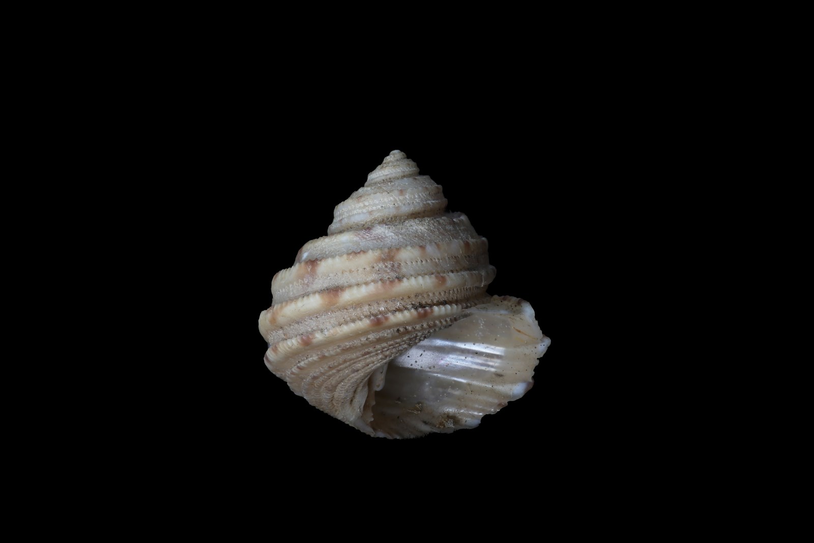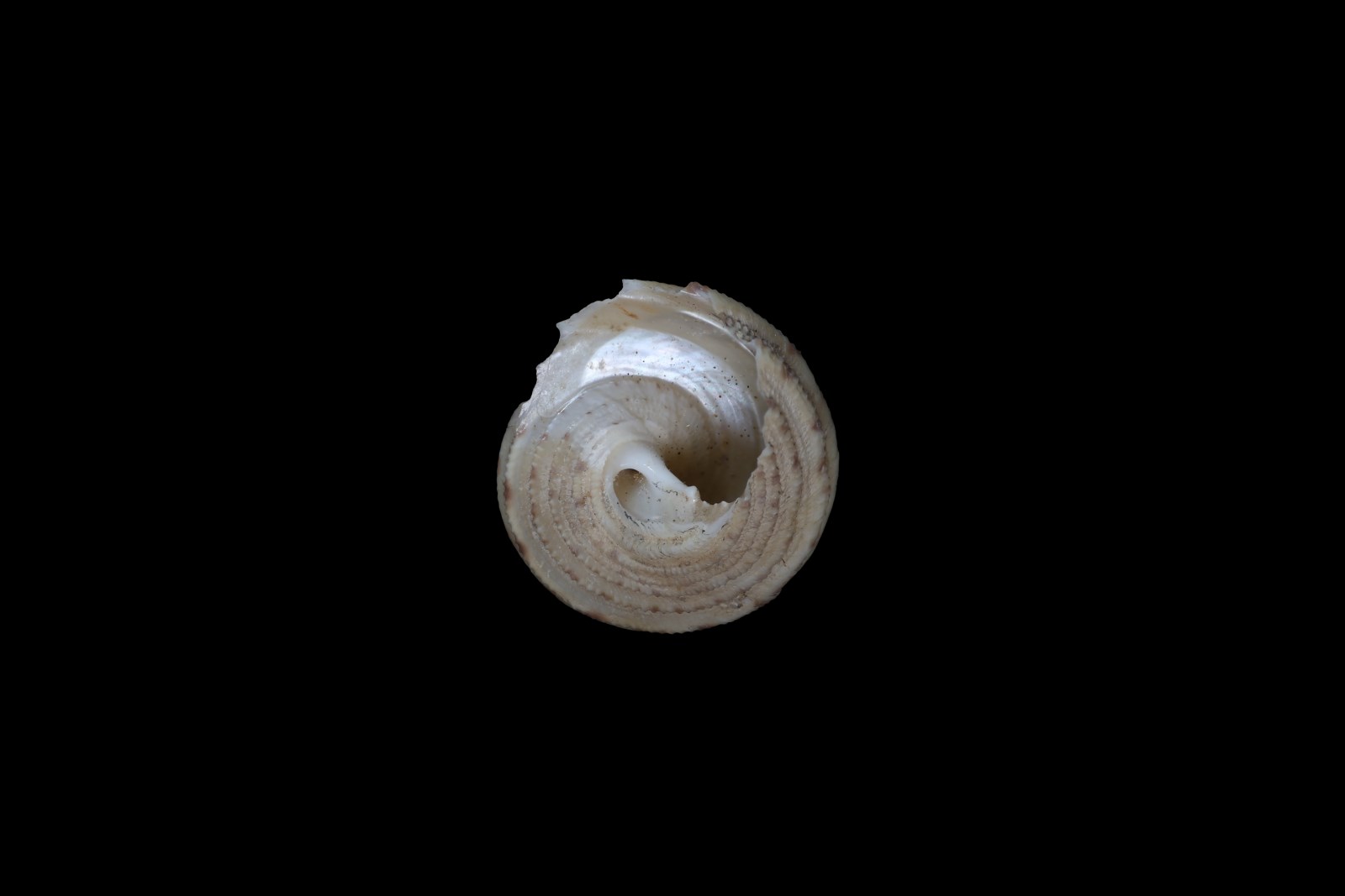 壳体小型,近球形,壳质坚实,壳高20mm,壳宽19.8mm。螺层6层,周缘膨圆,螺层因肋环绕而隆起。体螺层较大于螺旋部,每一层面具4条粗螺肋,肋由许多织密的两行小棱条组成,其上散布7、8个土黄色斑块,肋与肋间布满3、4行小棱条。螺旋部的螺肋形态和结构,与体螺层基本一致。底面为光亮的滑层覆盖,中部形成斜条浅沟,遮住脐孔,仅余痕凹;螺轴较直,轴唇生有4个钝头轴褶,上端者较大,其余3个轴褶呈外内两层;外唇厚,锯齿状边缘,内壁有光泽,与内侧生有近20余条褶襟,布满整个内缘。