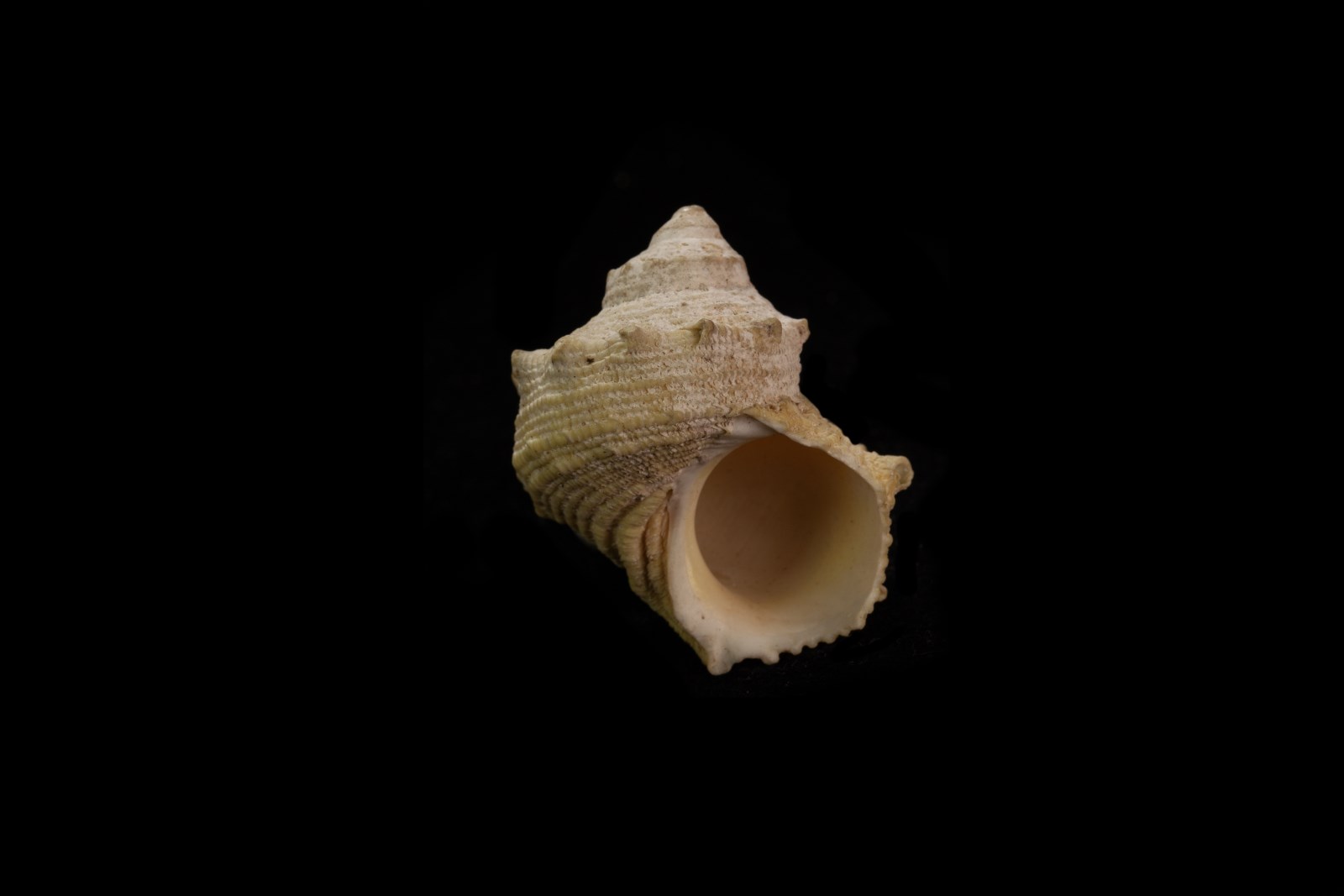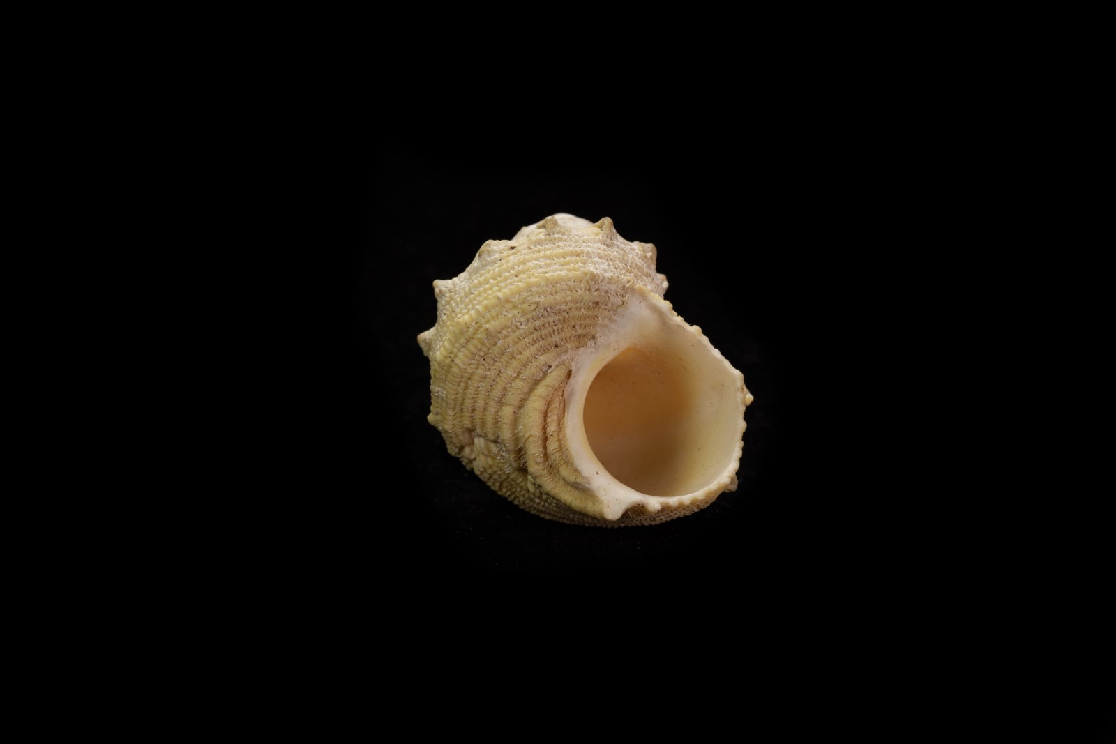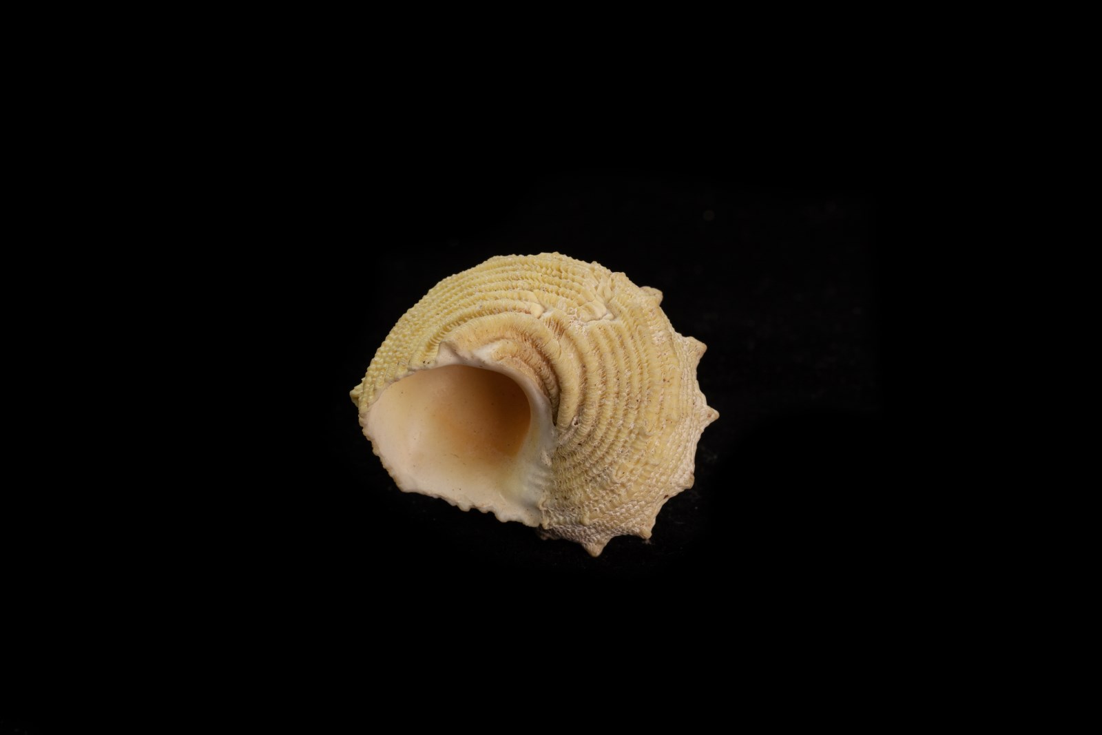 壳体中型,圆锥形,壳高54mm,壳宽48mm,壳质坚厚,周缘膨突。整个壳体灰白色,有少许深褐色块斑。螺层6层,壳顶尖突,螺层具许多环行的肋径一致的中肋,由细薄鳞片组成,螺旋部最大螺层和体螺层中部与偏下方的肋上长出一些中空的短棘突,共约4行,棘突朝上,以体螺层中部者较大。底面隆突,肋条变粗,靠近内缘者更粗,结构与壳面同。螺轴平滑,轴唇向下略伸,质地变厚;外唇有缺刻,口缘外方为浅黄色,内方为金黄色,内壁光滑有亮泽。脐部已不复存在,无脐孔。厣外橘黄色,近边缘处色浓,中央部略暗,外方具细旋纹。