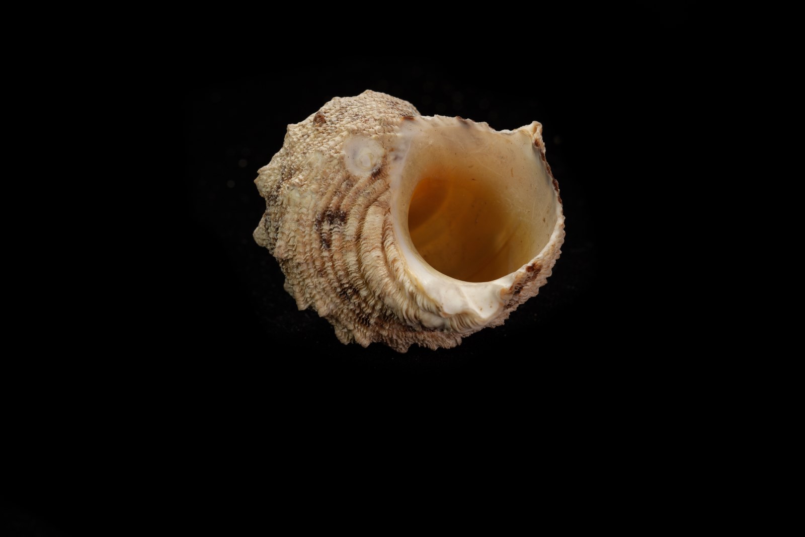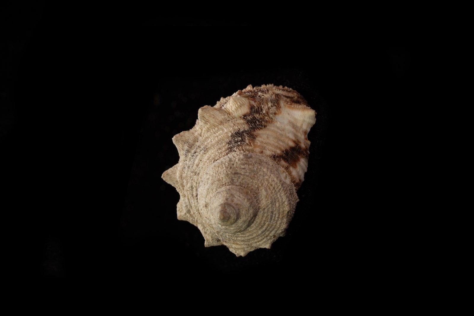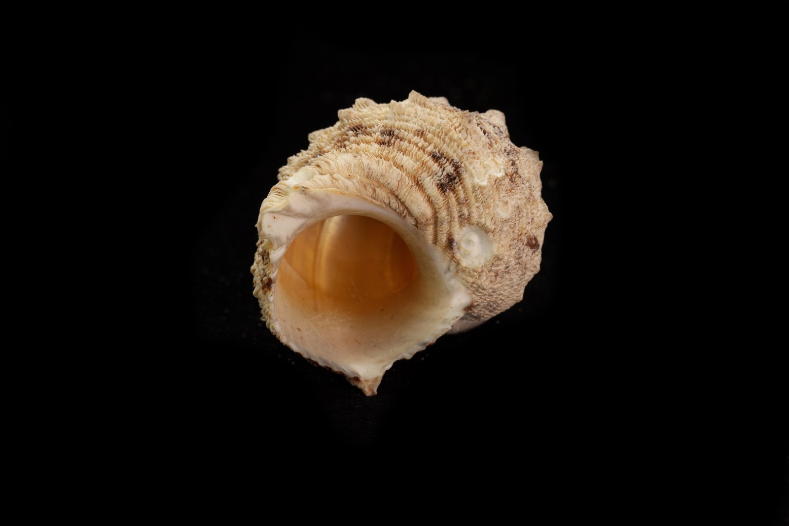 壳体中型,圆锥形,壳高54mm,壳宽48mm,壳质坚厚,周缘膨突。整个壳体灰白色,有少许深褐色块斑。螺层6层,壳顶尖突,螺层具许多环行的肋径一致的中肋,由细薄鳞片组成,螺旋部最大螺层和体螺层中部与偏下方的肋上长出一些中空的短棘突,共约4行,棘突朝上,以体螺层中部者较大。底面隆突,肋条变粗,靠近内缘者更粗,结构与壳面同。螺轴平滑,轴唇向下略伸,质地变厚;外唇有缺刻,口缘外方为浅黄色,内方为金黄色,内壁光滑有亮泽。脐部已不复存在,无脐孔。厣外橘黄色,近边缘处色浓,中央部略暗,外方具细旋纹。