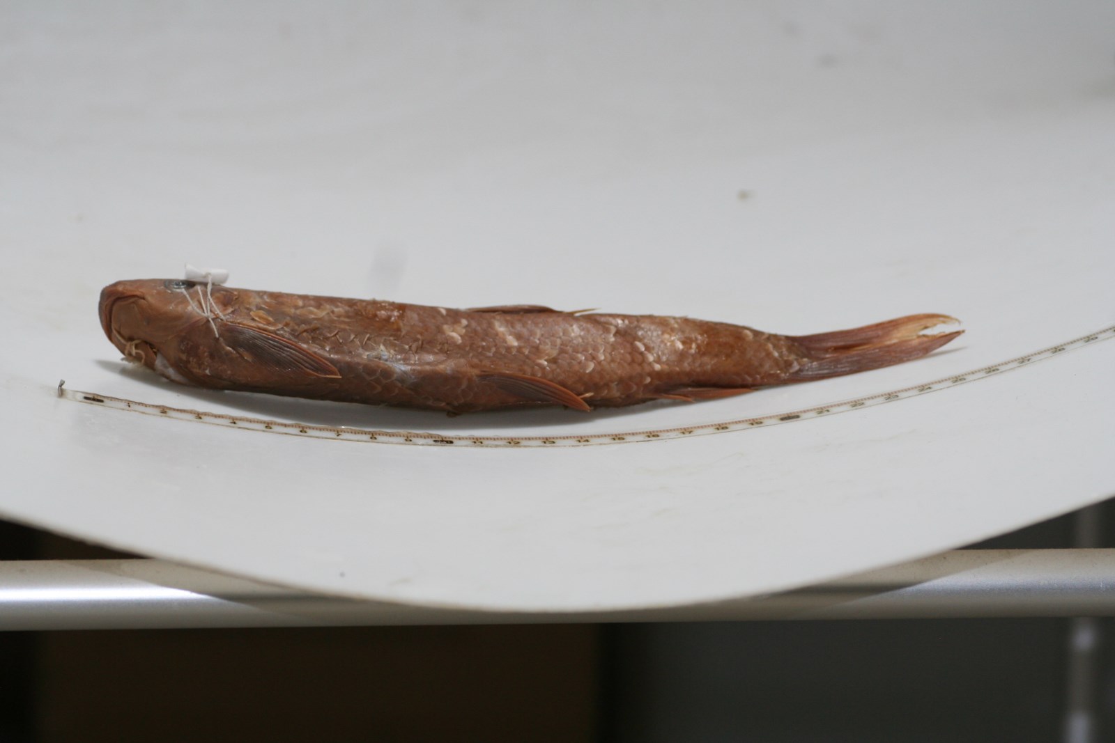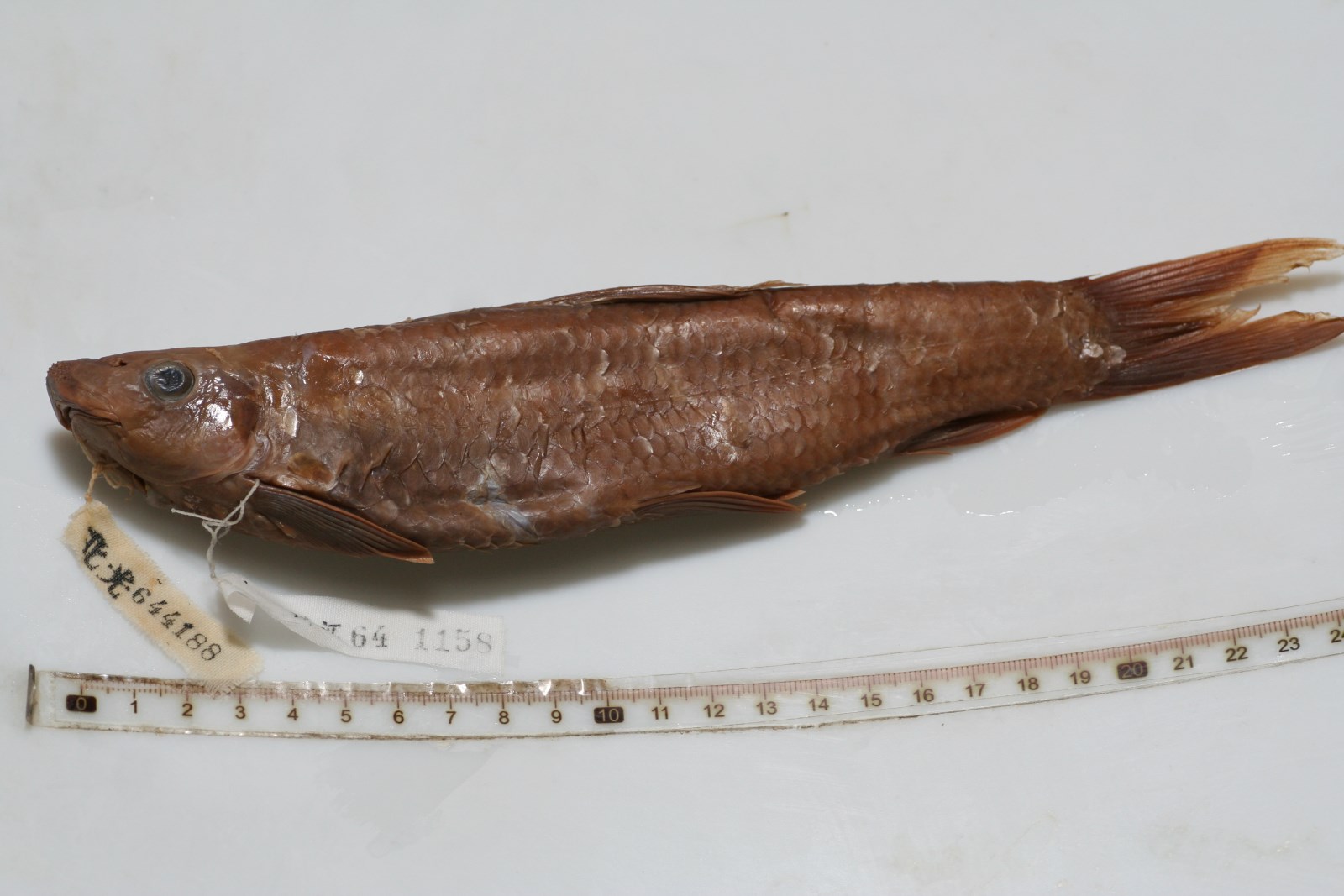 体长,稍侧扁,背部微隆起,腹部略圆。头略小,其高大于宽。吻圆钝,吻端具较大颗粒状的珠星。吻皮下垂覆盖住上唇的大部分,仅两侧角外露,且与上唇分离,吻皮中部边缘具微浅缺刻,两侧光滑。上唇厚,包在上颌的外面,近口角处被细小乳突。下唇较薄,与下颌有深沟相隔,内面与外缘具细密乳突,前缘稍向上翻.在口角处上下唇相连。下颌较厚,具锐利角质边缘,易脱落,左右唇后沟通过浅沟使之相通,颏沟显著。口下位,呈弧形,其宽超过头长之半,上颌后伸几达眼前缘垂直线。眼较小,位于头的中部上方,眼间宽而隆起。须2对,吻须细小或消失,口角须亦细弱,隐匿于口角后沟内,其长小于眼径。鳃盖膜在前鳃盖骨后缘下方与峡部相连,其间距比眼后头长为小。鳞片中等大,胸部鳞片小,背绮前鳞排列不规则,腹鳍基部具一腋鳞。侧线平直,向后径行至尾柄中部。背鳍无硬剌,其前距为体长的47%—49 %,外缘微凹,最长鳍条约等于或稍长于头长。胸鳍后伸达腹鳍起点, 相距5—6个鳞片。 腹鳍起点位于背鳍第四、五根分枝鳍条基部的下方, 后伸不达肛门,相距2—4个鳞片。臀鳍外缘浅内凹,后伸不达或近达尾鳍基。尾鳍深分叉, 最长鳍条为最短鳍条的3.0倍左右。下咽齿侧扁,排列紧密,齿端斜截。鳃耙细密。鳔2室,前窒小, 后室较长,后室长约为前室的2倍。肠细长,多盘曲。腹膜灰黑色。鲜活时体侧每个鳞片的周边紫蓝色,中央朱红色。固定标本,体背侧黑褐色,体侧部鳞片颜色亦转为黑褐色,腹部较浅,各鳍灰黑色。