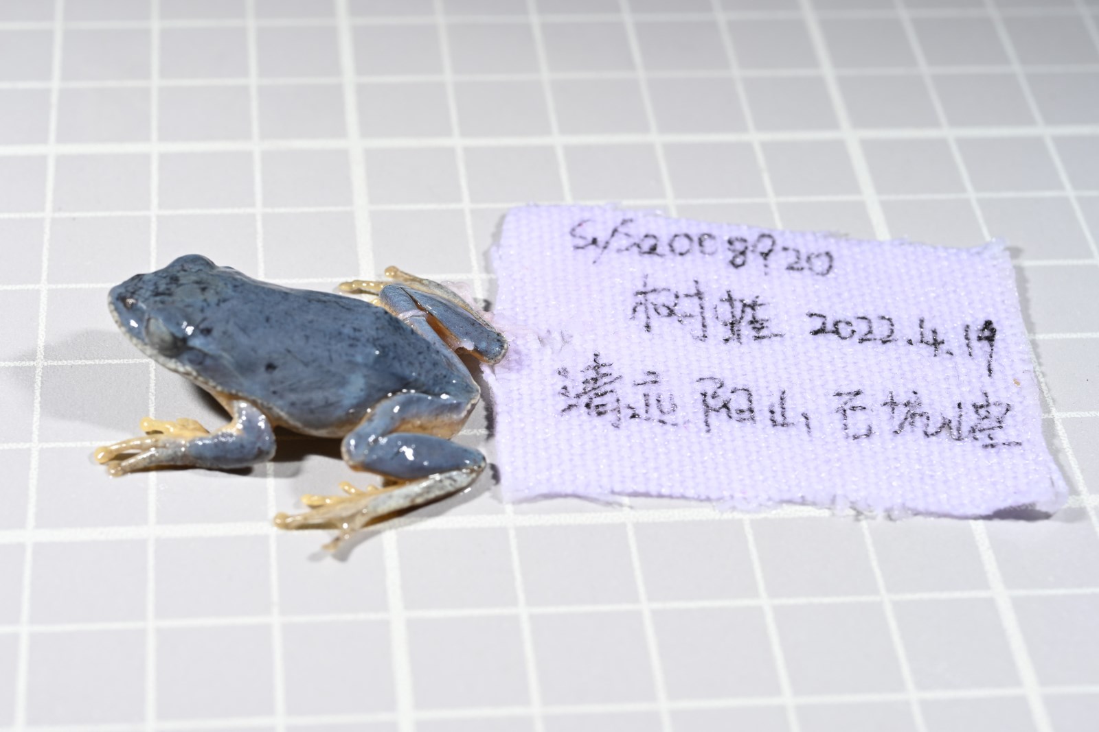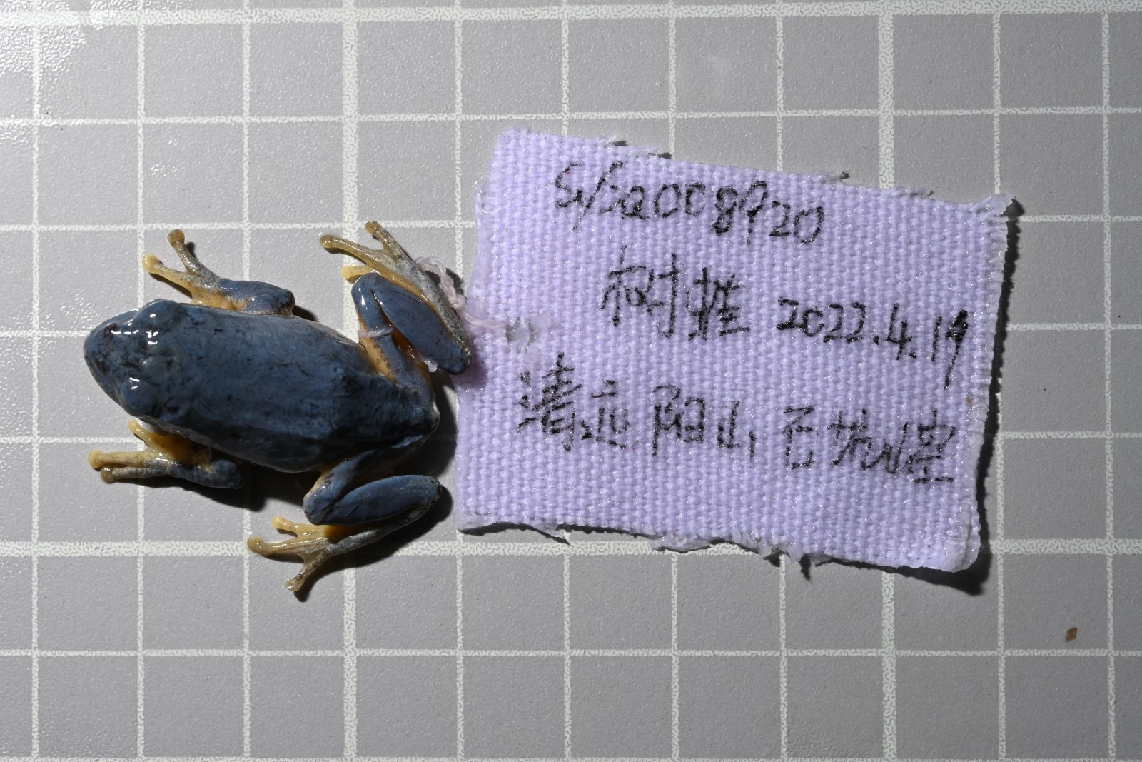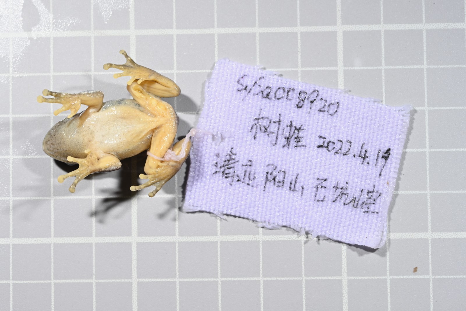 鉴别特征 本种体形小,雄性体长28.1mm,雌性37.0mm左右;从上唇经颞部下方和体侧至胯部有一条白色带纹;体和四肢背面有褐色小斑点;指间具微蹼;第三指吸盘小于鼓膜的直径。皮肤较光滑,上眼睑、颔后部和前臂外侧有小疣,咽胸部有疣小或不明显,腹部和股部腹面满布扁平疣,股后部疣粒较大,肛上方略显肤棱。体和四肢背面呈浅绿色,散有褐色细点;从上唇经颞部下方和体侧至胯部一条黄白色带纹;四肢内外侧、手和跗足的外侧均为黄白色;四肢被遮盖部位以及指、趾端均为肉黄色;腹面肉黄色或肉红色,无斑或有褐色斑