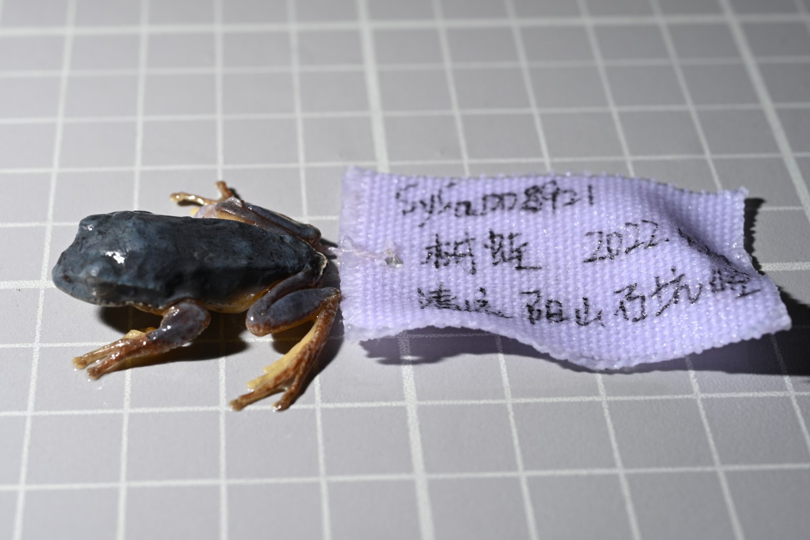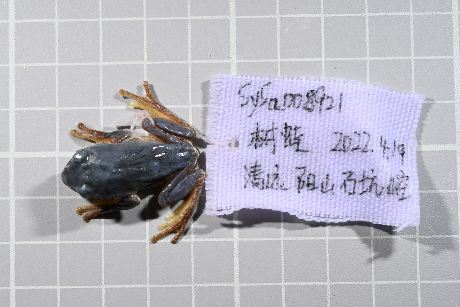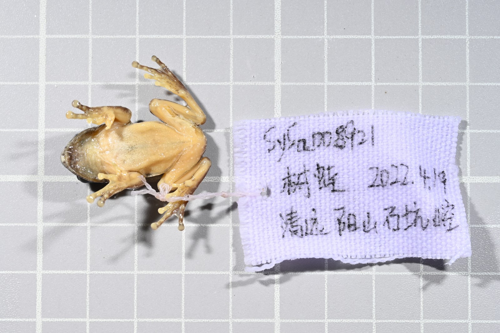 鉴别特征 本种体形小,雄性体长28.1mm,雌性37.0mm左右;从上唇经颞部下方和体侧至胯部有一条白色带纹;体和四肢背面有褐色小斑点;指间具微蹼;第三指吸盘小于鼓膜的直径。皮肤较光滑,上眼睑、颔后部和前臂外侧有小疣,咽胸部有疣小或不明显,腹部和股部腹面满布扁平疣,股后部疣粒较大,肛上方略显肤棱。体和四肢背面呈浅绿色,散有褐色细点;从上唇经颞部下方和体侧至胯部一条黄白色带纹;四肢内外侧、手和跗足的外侧均为黄白色;四肢被遮盖部位以及指、趾端均为肉黄色;腹面肉黄色或肉红色,无斑或有褐色斑