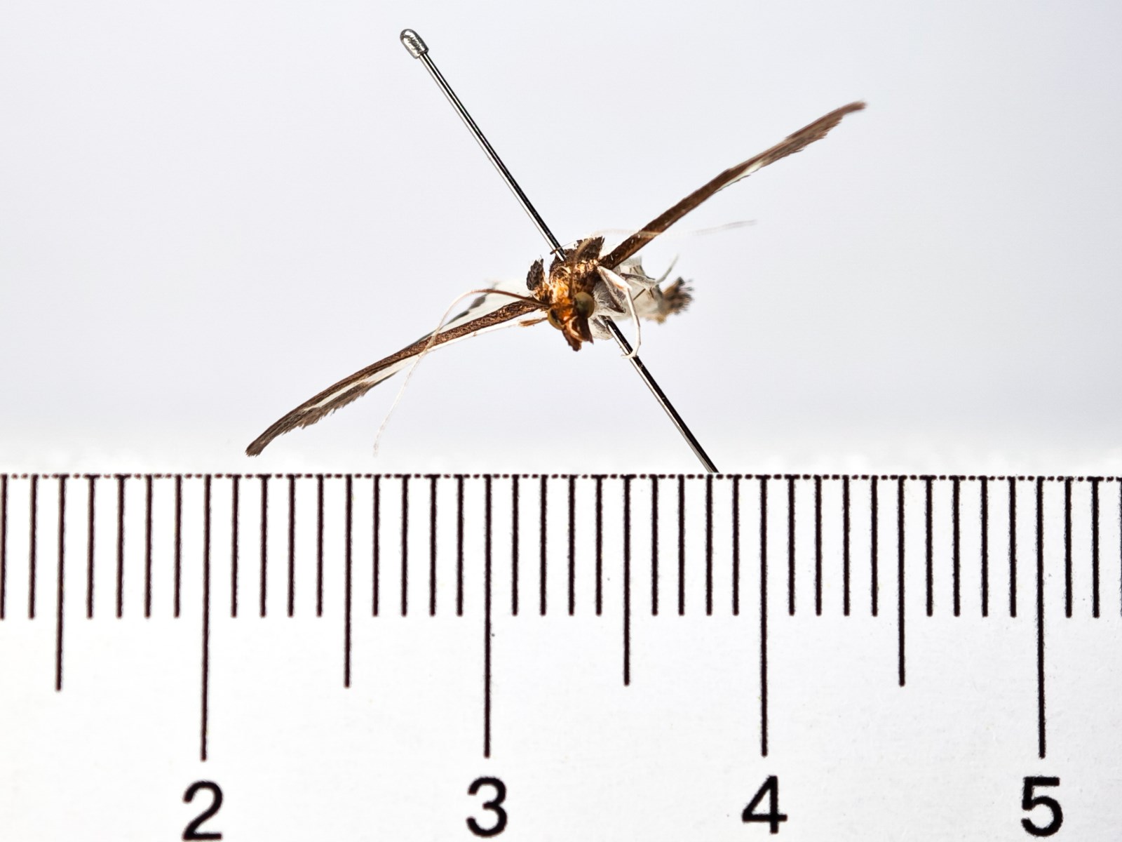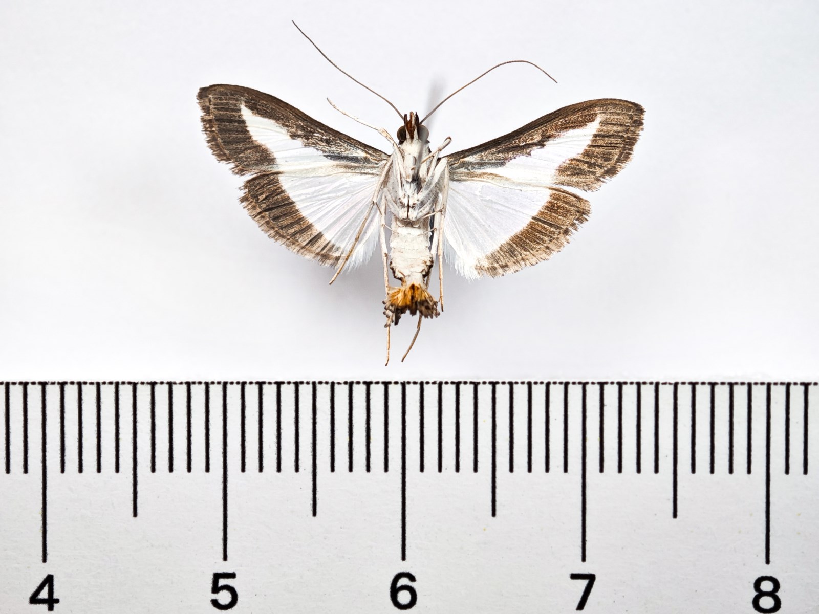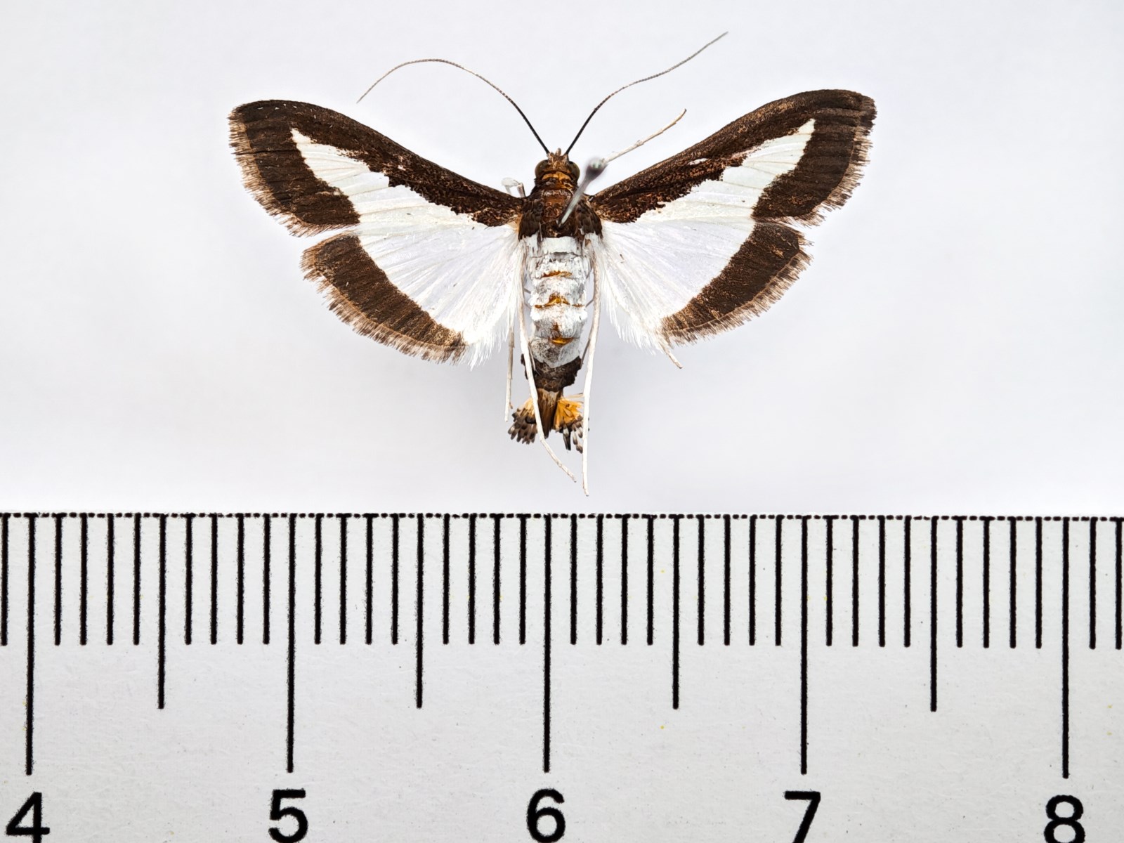 翅展23-26mm。头、胸黑褐色;触角灰褐色;下唇须褐色,下侧白色。领片、肩片暗褐色,肩片末端白色。腹部白色,第7-8节黑色,尾毛黄褐色,腹部腹面及足白色。双翅白色半透明,前翅前缘及外缘及后翅外缘有黑褐色宽带。双翅缘毛黑褐色。雄性外生殖器:爪形突细长弯曲,端部刀片状,背侧具短刚毛;抱器瓣舌状,端部宽圆,腹侧中部有1长弯曲指形突;阳端基环锤状;囊形突宽方形;味刷发达;阳茎粗壮长筒状,顶端有1壮弯曲钩形角状器。
