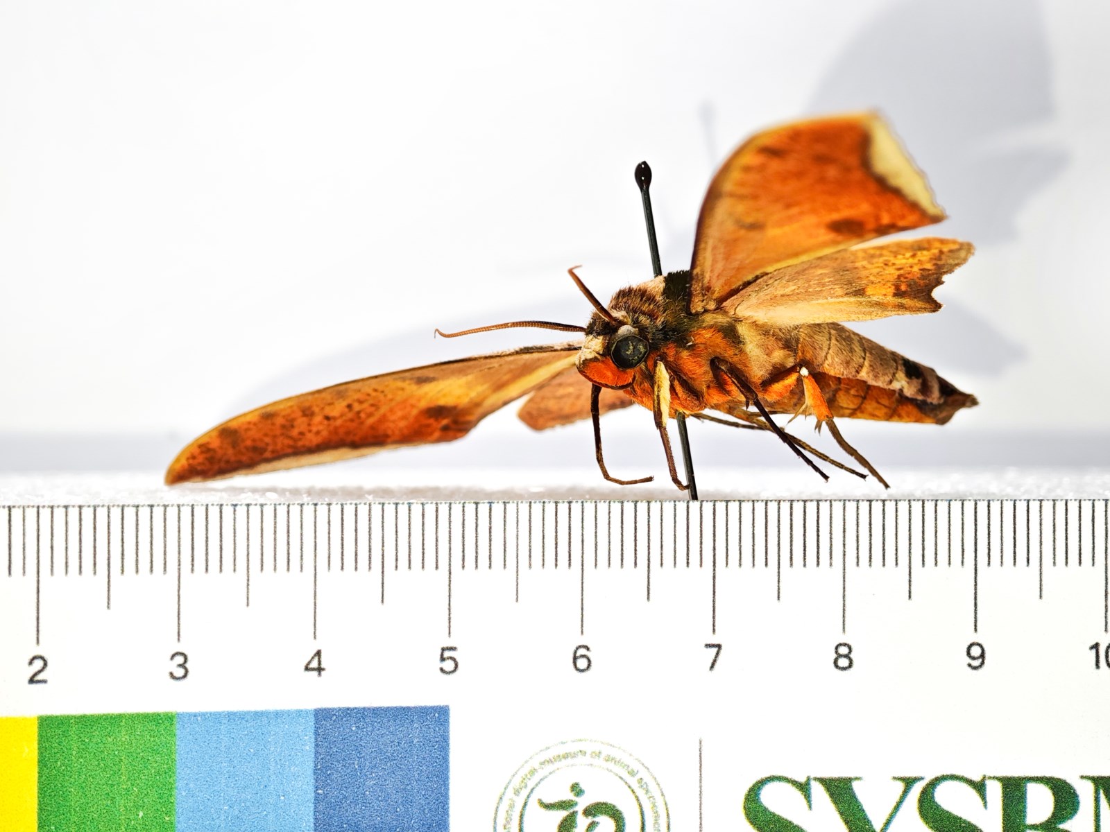 成虫体长48-50毫米,翅展97-110毫米。体翅橙褐色。胸背黄褐色,两侧浓绿至褐绿色;腹部第六节两侧及第八节背面有褐绿色斑;胸及腹部的腹面为橙黄色。前翅暗黄,内线不明显,中线和外线褐绿色波状,顶角弯曲呈弓状似鹰翅,在内线部位近前缘及后缘处有2个褐绿色圆斑,后角内上方有褐色及黑色斑;后翅呈黄色,有较明显的棕褐色中带及外缘带,后角上方有褐绿色斑;前、后翅反面橙黄色,前翅外缘宽带灰色。