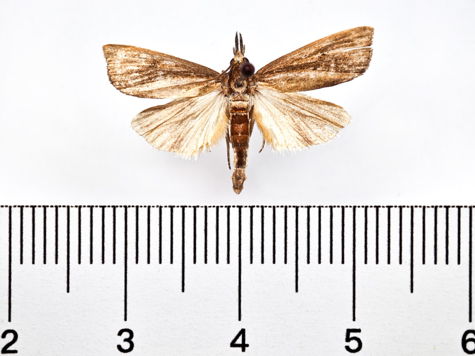成虫翅展雄约20mm﹐雌25~28mm。头部淡灰褐色﹐额白色至烟色﹐圆形﹐顶端尖。胸部和翅基片白色至灰白﹐并带褐色。前翅黄褐至暗褐色﹐中室先端有紫黑斑点﹐中室下方有3个斑排成斜线。前翅外缘有7个黑点。後翅白色﹐靠近翅外缘稍带褐色。雌虫体色比雄虫稍淡二化螟为害造成的枯鞘﹐前翅黄褐色﹐后翅白色。 二化螟在我国分布比较广泛,国内分布北达黑龙江克山县,南至海南岛,但其主要分布为害地区为湖南、湖北、四川、,江西、浙江、福建、江苏苏北、安徽皖北、陕西、河南、辽宁以及贵州、云南高原地带。国外分布于朝鲜、日本、菲律宾、越南、泰国、马来亚、印度尼西亚、印度、埃及等。