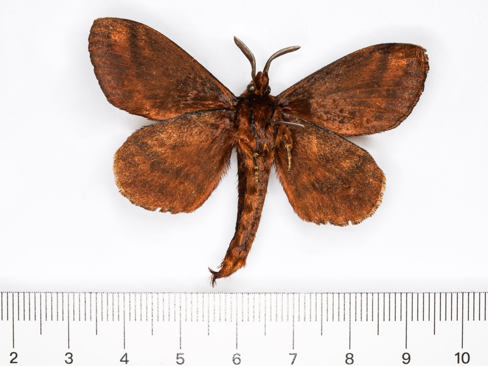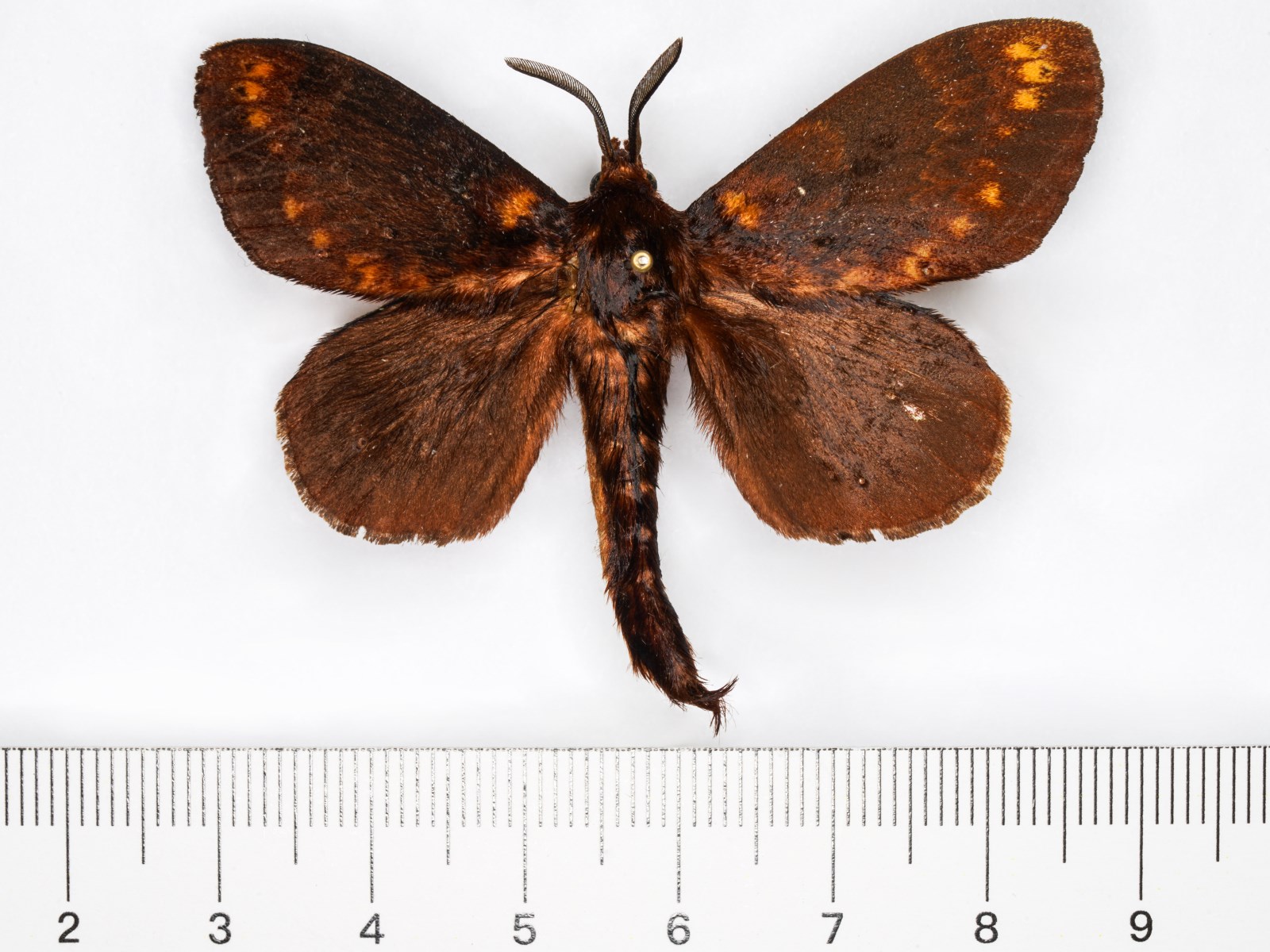 幼虫:体长74-99mm。棕褐色。全身布满白色、黑色及棕色长毛。花斑显著。缺少贴体倒伏鳞毛。头部褐黄色,傍额区暗褐,额区亦呈褐黄色。中后胸节背面有明显毒毛带,前胸节两侧有长丛毛。腹部各节前亚背毛簇中缺少窄而扁平的片状毛,仅有一丛长而粗硬的刚毛;体侧纵带清楚,每节前方由纵带向下有斜斑伸向腹面。