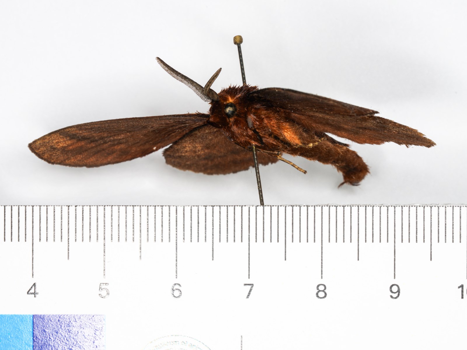 描述 体长:雄蛾25-31mm,雌蛾28mm;翅展:雄蛾53-54mm,雌蛾68-75mm。成虫棕褐到深褐。最明显的特征是在亚外缘黑斑列的内侧有淡黄色斑,前翅中室末端的白点很明显,亚外缘斑列最后两点的连线约与翅顶角相交。雌蛾前翅前缘近末端1/3处开始有较强烈弯曲;外缘弧度也很大。雄蛾前翅中室白斑内侧有两块紧接在一起的淡黄色斑。触角鞭节皆呈褐色,栉枝黑褐色。