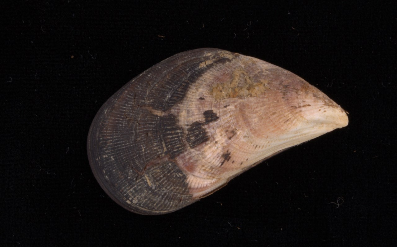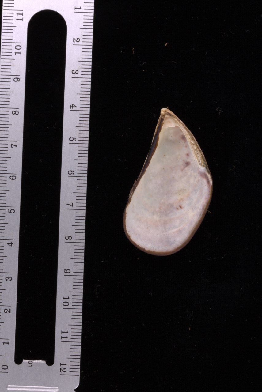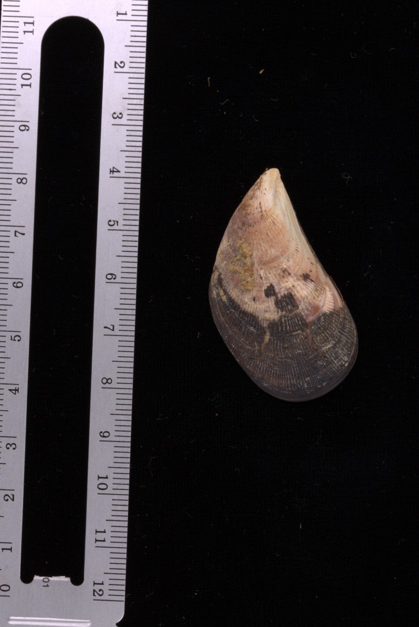 贝壳前端尖细,后端宽圆,略呈楔形,壳长约50 mm;壳面紫褐色,密布放射状细肋,顶部色浅;壳内灰蓝色,壳顶下方具1 个三角形的白色小隔板,闭壳肌痕明显;铰合部窄,具1~3 个小突起。分布于浙江以南沿海;附着生活在潮间带中、低潮区岩石及贝壳等物体上。
