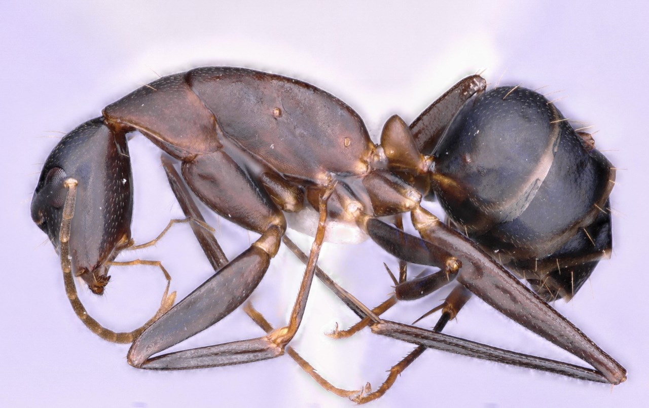 大型工蚁: 正面观头部长宽相等,近梯形,向前变窄,后缘深凹,后角窄圆,侧缘轻度隆起。上颚三角形,咀嚼缘具5齿。唇基近梯形,向前变宽,具钝的中央纵脊,中叶明显前伸,前缘近平直。缺额叶,触角窝外露;额脊较长,到达复眼中央水平。触角12节,柄节约1/6超过头后角,鞭节各节丝状。复眼较小,位于头中线稍后处,远离头侧缘。缺单眼。侧面观胸部背面弓形较完整,被平直的并胸腹节斜面稍打断。前胸背面轻度隆起,前中胸背板缝明显但不凹入;中胸背板轻度隆起,向后缓坡形降低;后胸沟细弱,不凹入。并胸腹节背面轻微隆起,坡形,后上角宽圆形;斜面近平直,陡坡形,约与背面等长;气门椭圆形,位于侧面后下角。腹柄结较薄,轻度前倾,鳞片状,前面轻度隆起,后面近平直,顶端锐角状。后腹部长卵形,5节,前部最宽,向后变狭,端节小,末端开口近圆形。背面观前胸最宽,前缘窄圆,侧缘中度隆起。前中胸背板缝明显,向前弓形弯曲。中胸窄于前胸,近梯形,向后变窄,侧缘轻度隆起。后胸沟细弱,近横形。并胸腹节长宽近相等,近方形,侧缘中度隆起,后侧角近直角形。腹柄结横形,宽大于长,前面中度隆起,后面轻度凹入,两侧锐角状。后腹部长卵形,前中部最宽,向前向后均变狭,第一节前缘强烈隆起。上颚较光滑,具稀疏具毛微刻点。头部较光滑,具稀疏具毛微刻点。胸部、腹柄和后腹部光滑发亮。身体背面具丰富亚直立至亚倾斜毛和丰富平伏短绒毛被,前胸背板立毛较密集,并胸腹节背面前部缺立毛;柄节背面具密集平伏短绒毛被,顶端具少数立毛;胫节背面具密集平伏绒毛被,缺立毛。身体棕黄色,复眼浅黑色,上颚和后腹部暗棕红色,后腹部各节后缘灰白色。小型工蚁:与大型工蚁相似,但身体较小。头较小,长显著大于宽,近长方形,后缘宽圆,后角宽圆,侧缘轻度隆起。唇基前缘轻度隆起。触角较长,柄节约5/9超出头后角。复眼较大,刚到达头侧缘。侧面观并胸腹节背面很长,近平直,后上角宽圆;斜面很短,约为背面长的1/4。腹柄结厚,三角形,前面坡形近平直,后面陡坡形近平直,顶端尖锐。身体背面立毛稀疏。头部和后腹部黑色,胸部和腹柄棕黄色,触角柄节和足暗棕黄色,复眼灰色。