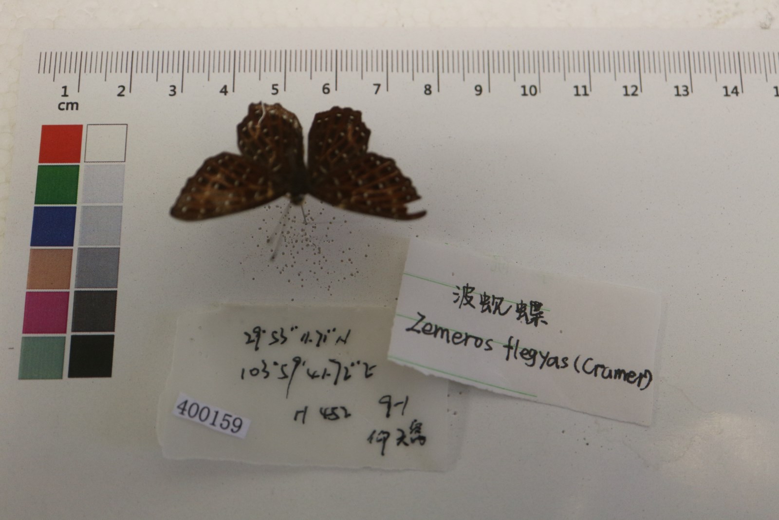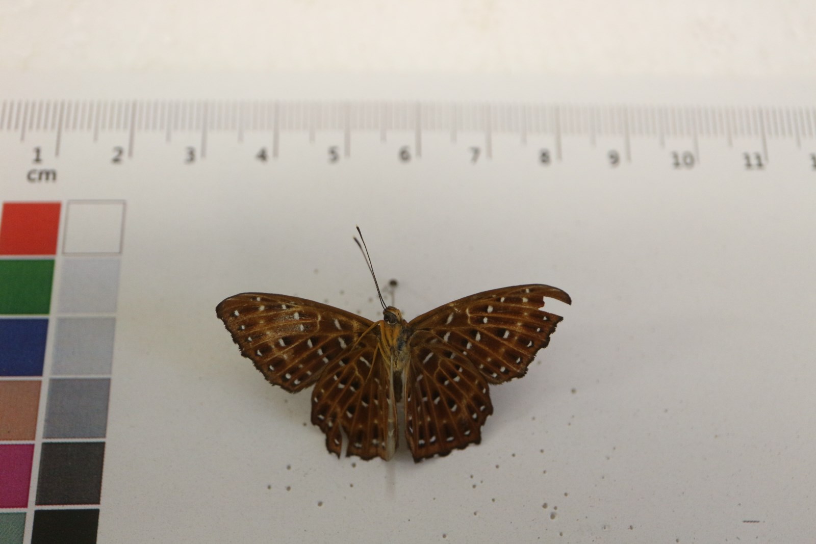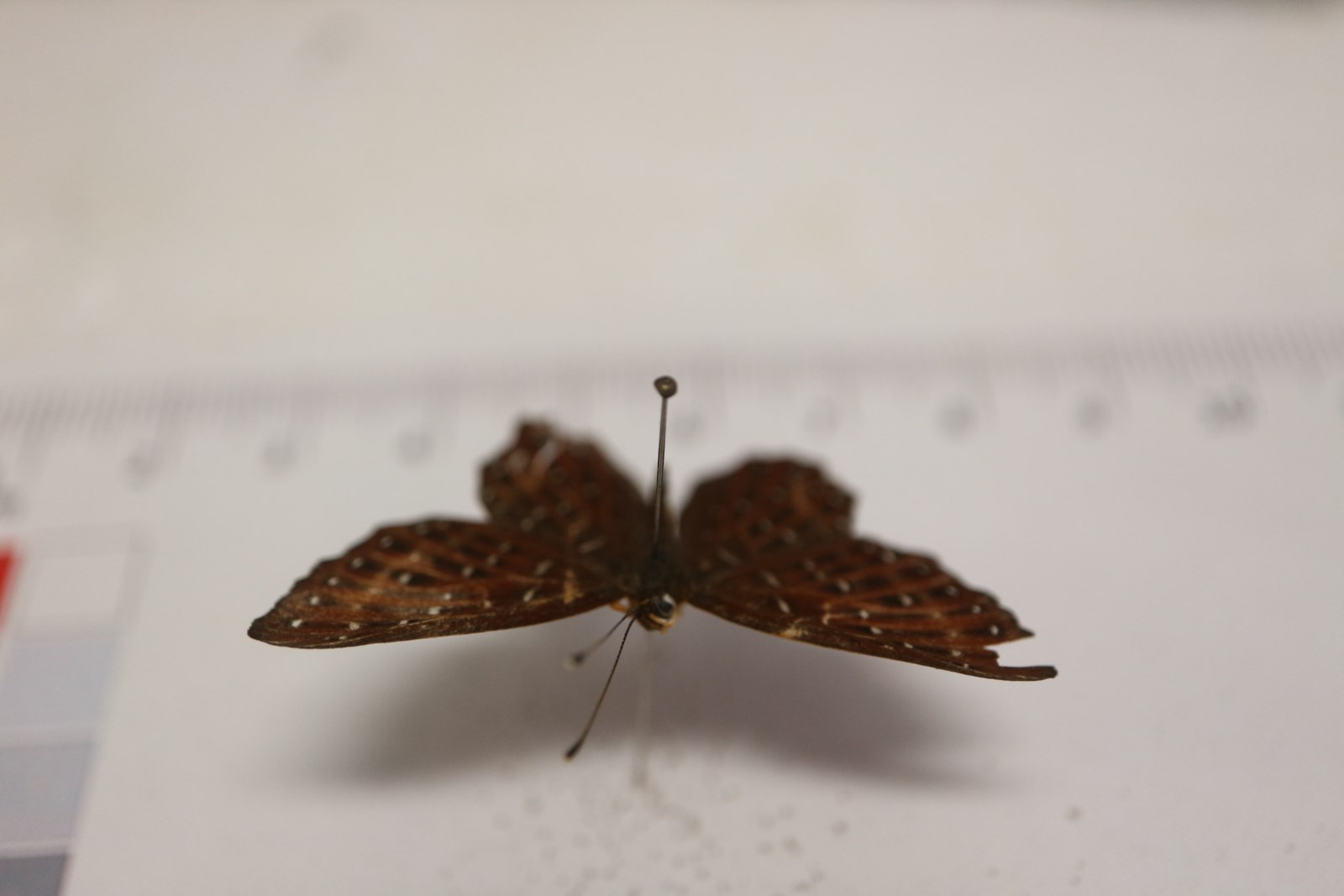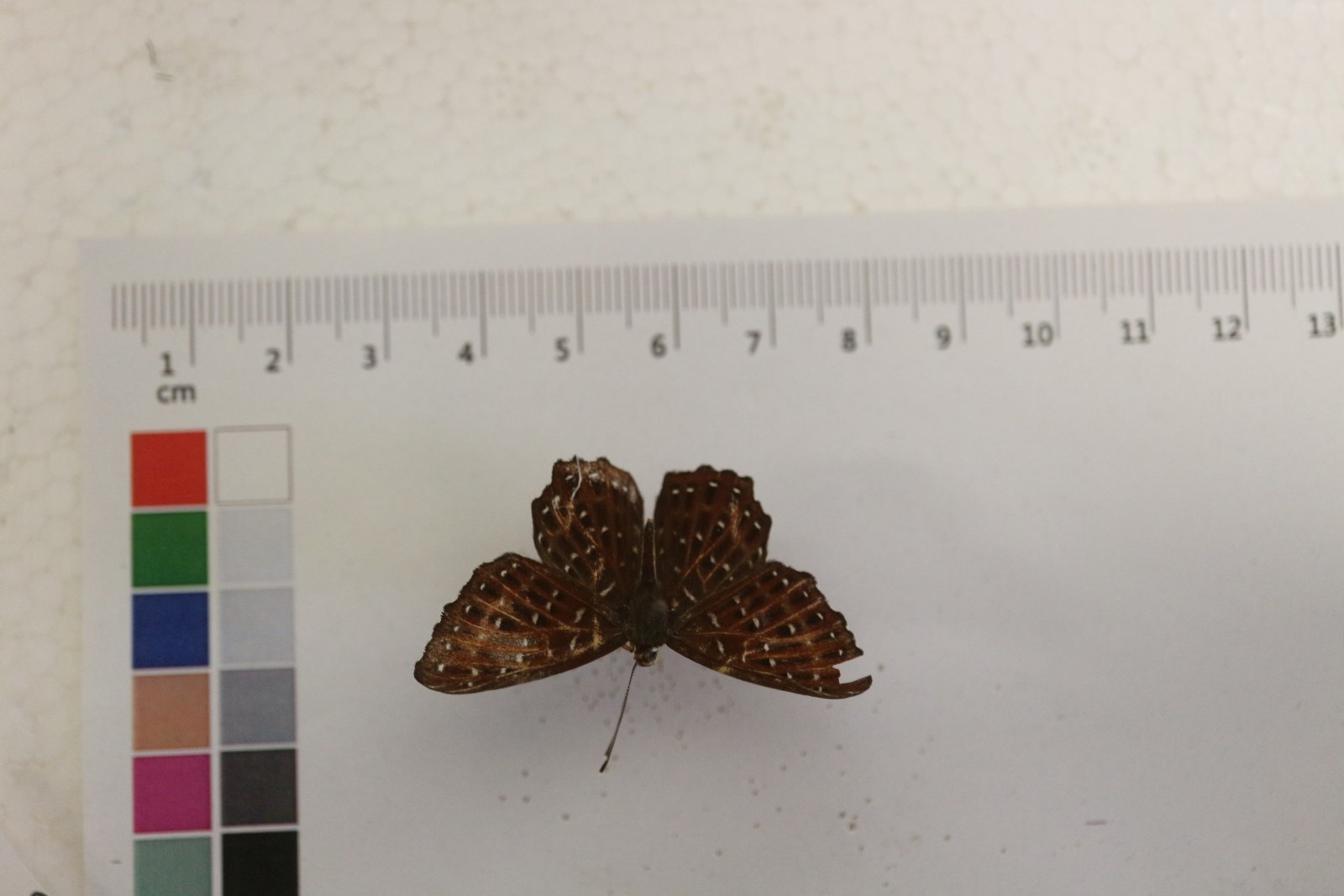 翅展34-45mm。触角细长,背面绯红褐色,顶端锤状,锤顶深黄色,节间有白环;体背面黑褐色,胸部和腹部基部被深褐色绒毛,腹面棕色,被黄色绒毛。前、后翅绯红褐色,翅脉棕色,具深褐色斑的外侧嵌有白点的斑,此种斑分散在各翅室内,每1翅室有1-4个斑,亚端部一列斑排列整齐;翅外缘波状,在Cu2脉和M3脉处微外突。在Cu1脉处内凹,后翅外缘M3脉处外突略呈齿状。前、后翅反面颜色稍浅。斑纹排列如翅正面。雌雄同型,雌蝶色稍浅。成虫常在林道两旁灌木间活动。