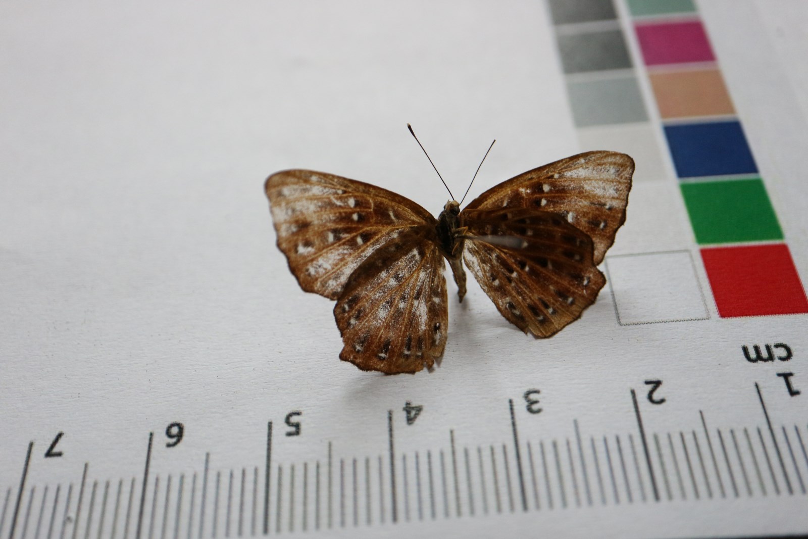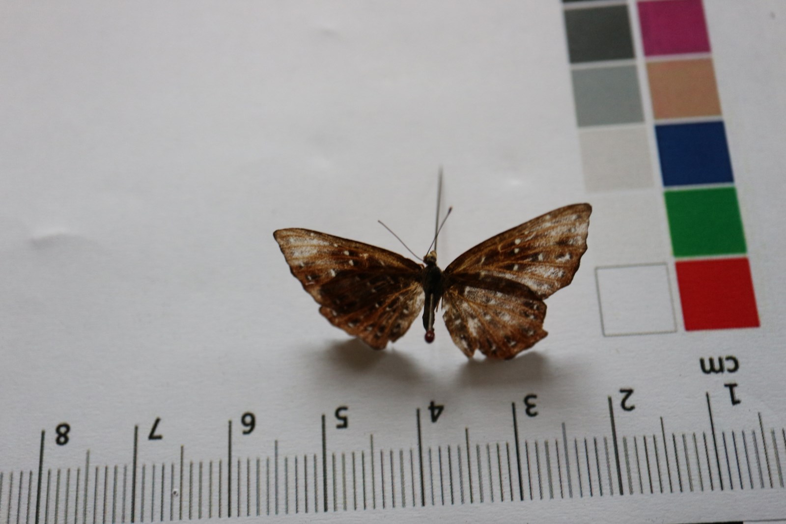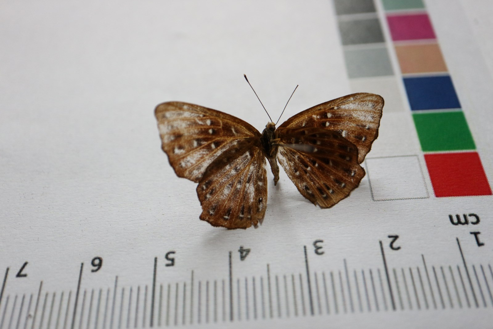 翅展34-45mm。触角细长,背面绯红褐色,顶端锤状,锤顶深黄色,节间有白环;体背面黑褐色,胸部和腹部基部被深褐色绒毛,腹面棕色,被黄色绒毛。前、后翅绯红褐色,翅脉棕色,具深褐色斑的外侧嵌有白点的斑,此种斑分散在各翅室内,每1翅室有1-4个斑,亚端部一列斑排列整齐;翅外缘波状,在Cu2脉和M3脉处微外突。在Cu1脉处内凹,后翅外缘M3脉处外突略呈齿状。前、后翅反面颜色稍浅。斑纹排列如翅正面。雌雄同型,雌蝶色稍浅。成虫常在林道两旁灌木间活动。