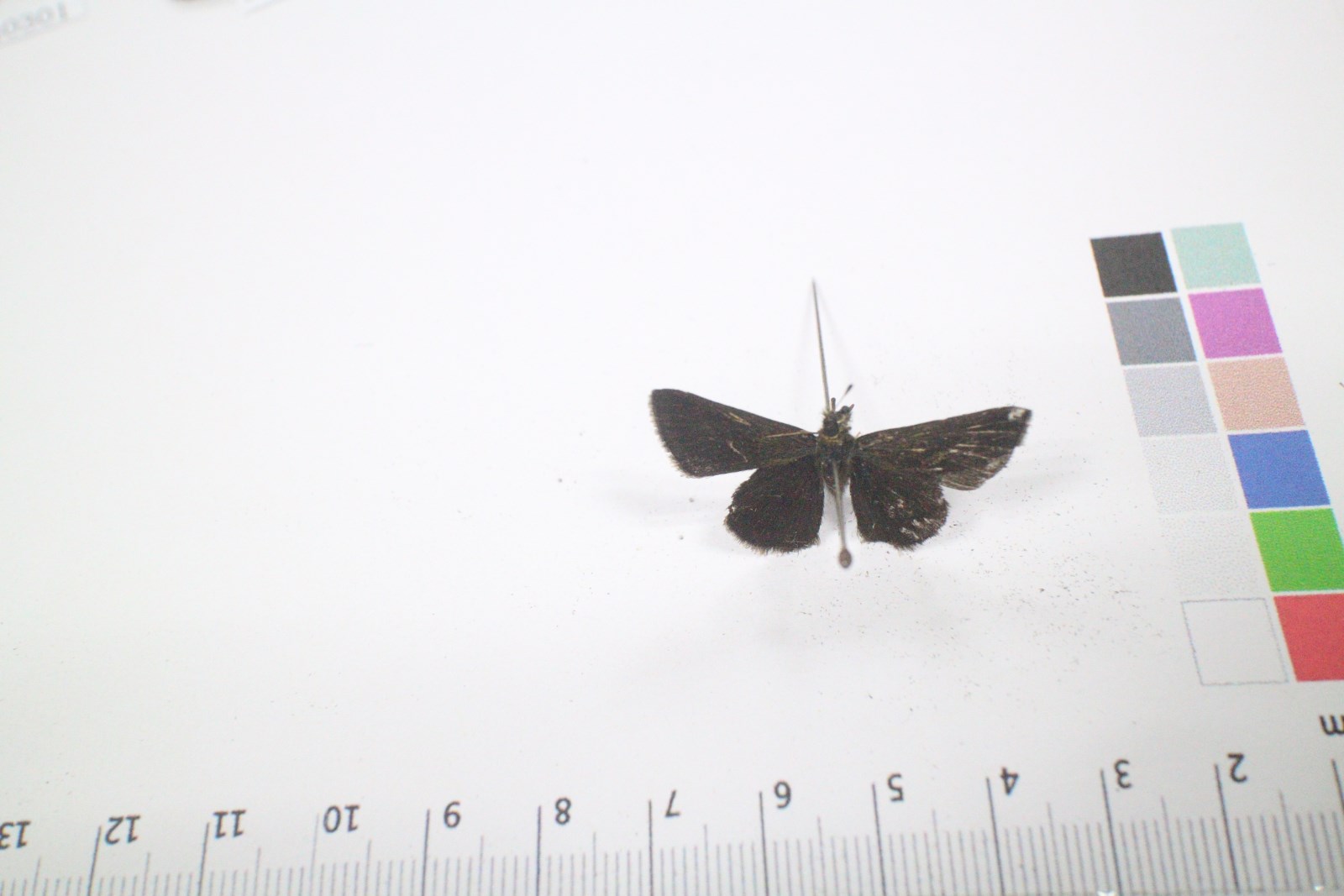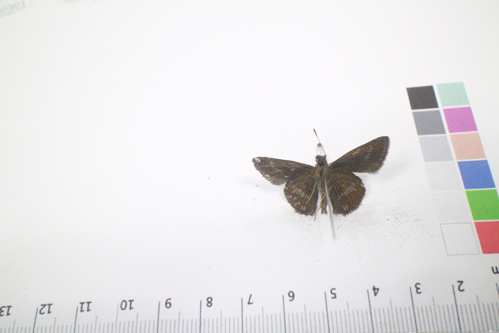 雄成虫:前翅长15~28 mm。触角短于前翅前缘长度的一半,棒部膨大不明显。翅面黑褐色,无斑纹。前翅狭长,前缘中部向前稍突出,稍呈弧形,外缘也向外突出呈弧形,后翅圆阔。 雌成虫:外形基本同雄性。本科蝴蝶种类较多。成虫属于小型蝶种,是蝶类中形态及生活习性最特殊的种类。弄蝶科成虫的触角端部呈尖钩状;雌雄成虫的前足均正常。弄蝶科体型中至小,身材粗短,密布鳞毛。触角棍棒状,末端数节尖细弯曲如钩,是本科独有的特徵。