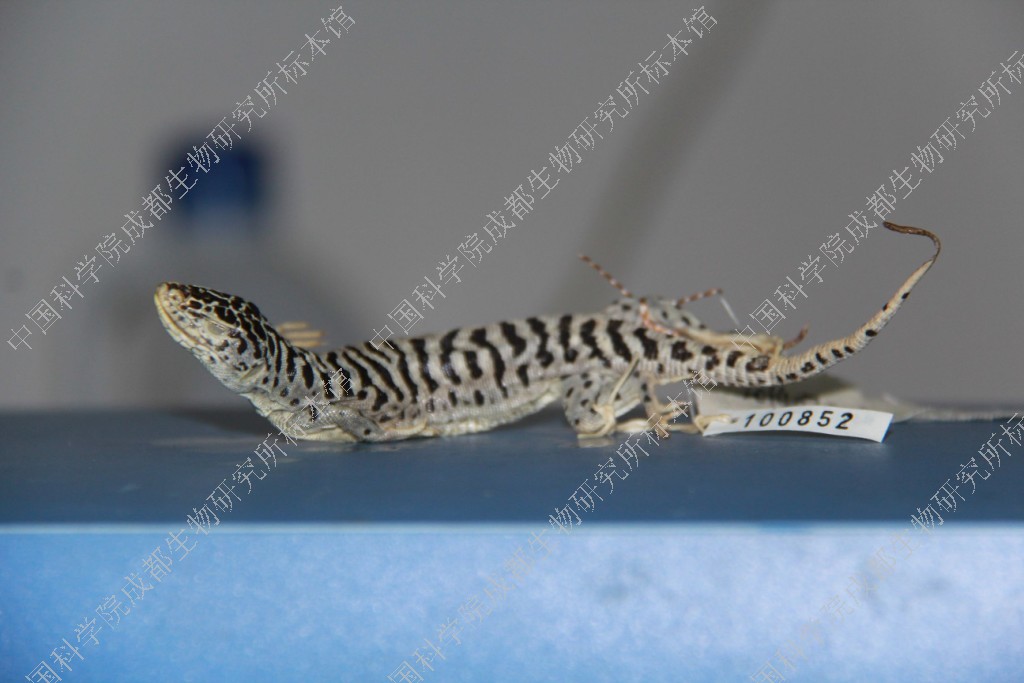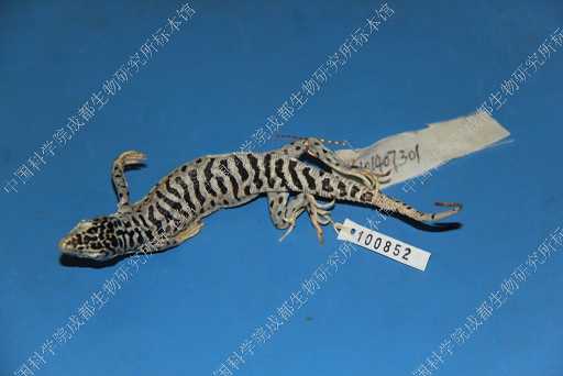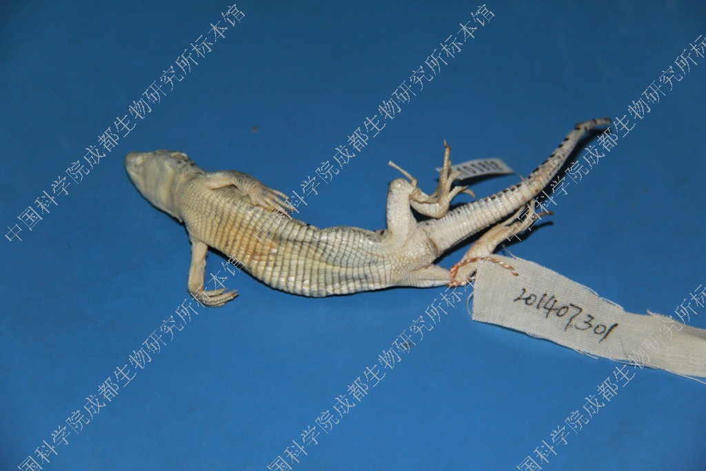 鉴定特征 体粗壮,成体长约220mm,尾为头体长的1—1.5倍;头中等,吻钝;颏片与领围之间一纵列鳞32—40枚;体背为圆粒鳞,多少排成横列;体中段每横列有鳞52—60枚;腹鳞方形,光滑;肛前鳞前端不规则;四肢粗壮,四肢背面为粒鳞和小鳞;前臂前侧、股前侧及胫腹面均为大鳞,指、趾下瓣显著;股窝每侧12-16个;尾基扁平,尾背鳞微具棱。体背黄褐色,具蓝黑色虫纹状斑;四肢背面具黑色横纹,腹面浅色。