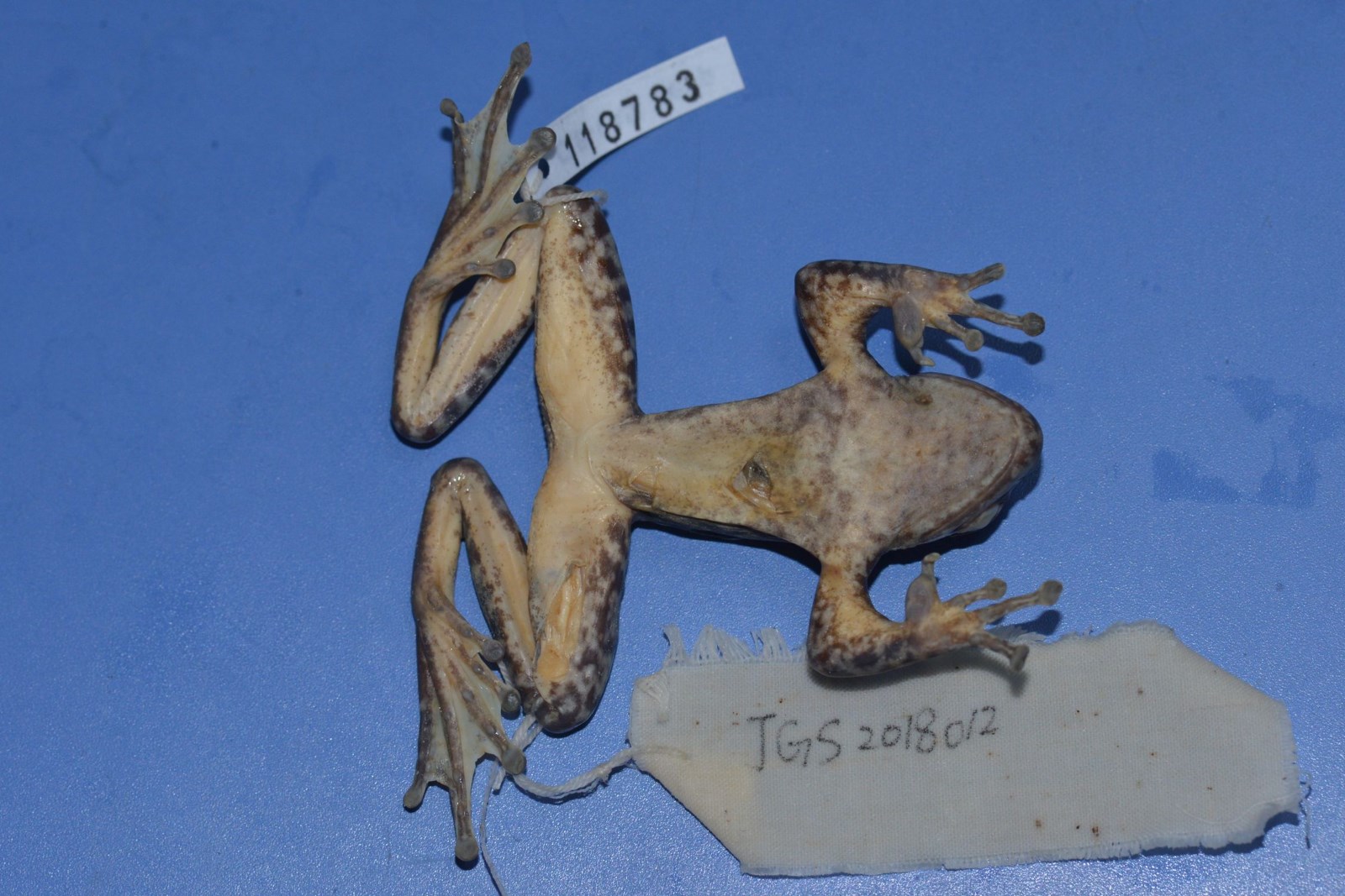 鉴定特征 雄蛙体长53毫米,雌蛙65毫米左右。头长略小于头宽,鼓膜小而明显,犁骨齿弱。体背面皮肤光滑,无背侧褶,头侧及肛周围有少数疣粒。第一指指端膨大无马蹄形横沟,其余各指均有大吸盘和横沟;胫跗关节前达鼻孔或超过,第四趾蹼达第三关节下瘤,其余趾为全蹼。体色变异颇大,背面绿色、棕褐色或蓝绿色有不规则棕色或绿色花斑,体侧及四肢背面具黑斑纹;咽胸部灰黑色,腹部乳黄色。雄蛙第一指具大婚垫,无声囊,无雄性线。