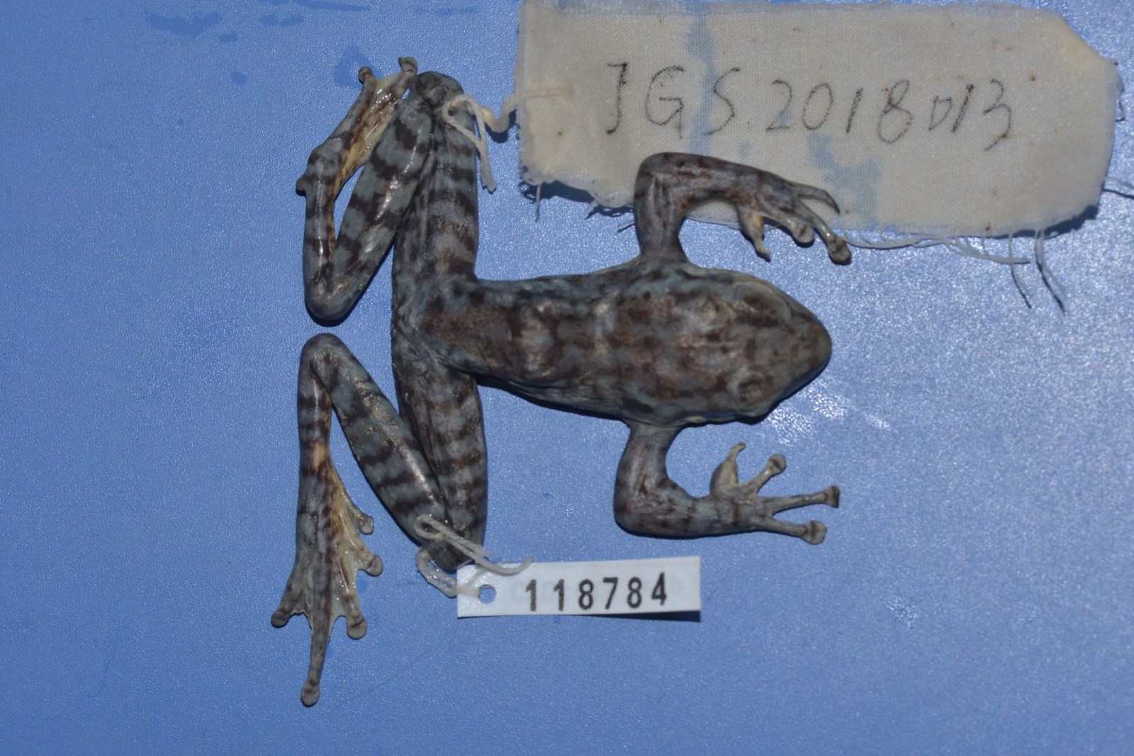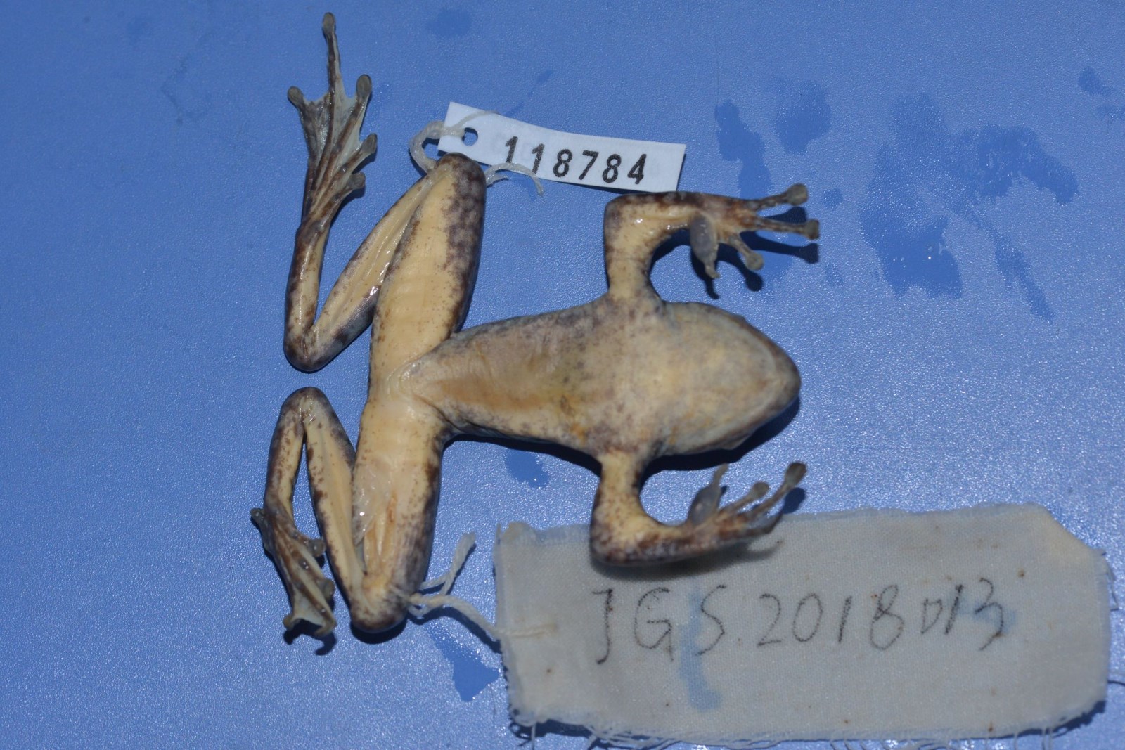 鉴定特征 雄蛙体长53毫米,雌蛙65毫米左右。头长略小于头宽,鼓膜小而明显,犁骨齿弱。体背面皮肤光滑,无背侧褶,头侧及肛周围有少数疣粒。第一指指端膨大无马蹄形横沟,其余各指均有大吸盘和横沟;胫跗关节前达鼻孔或超过,第四趾蹼达第三关节下瘤,其余趾为全蹼。体色变异颇大,背面绿色、棕褐色或蓝绿色有不规则棕色或绿色花斑,体侧及四肢背面具黑斑纹;咽胸部灰黑色,腹部乳黄色。雄蛙第一指具大婚垫,无声囊,无雄性线。
