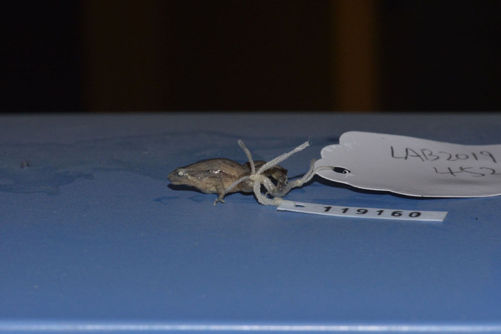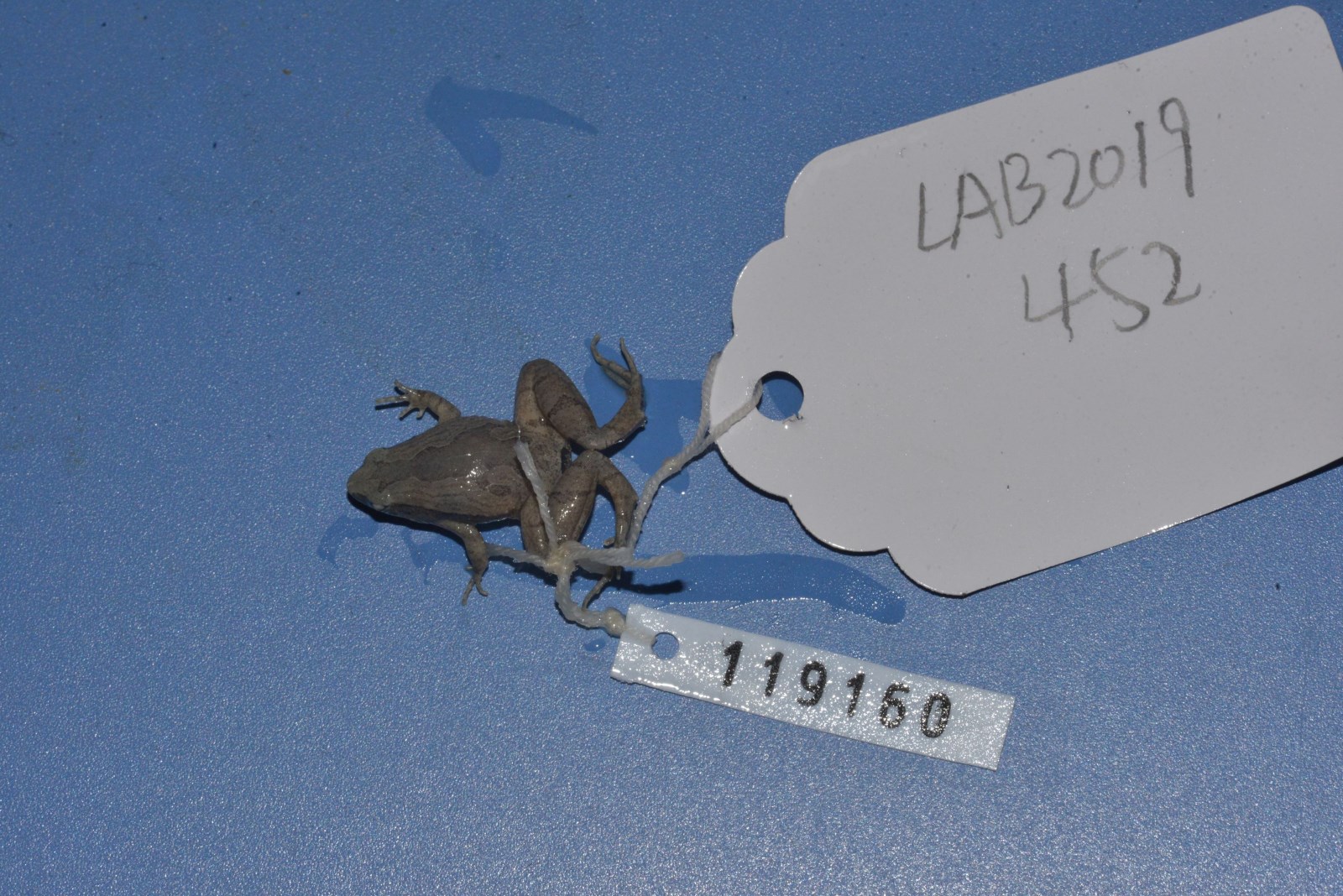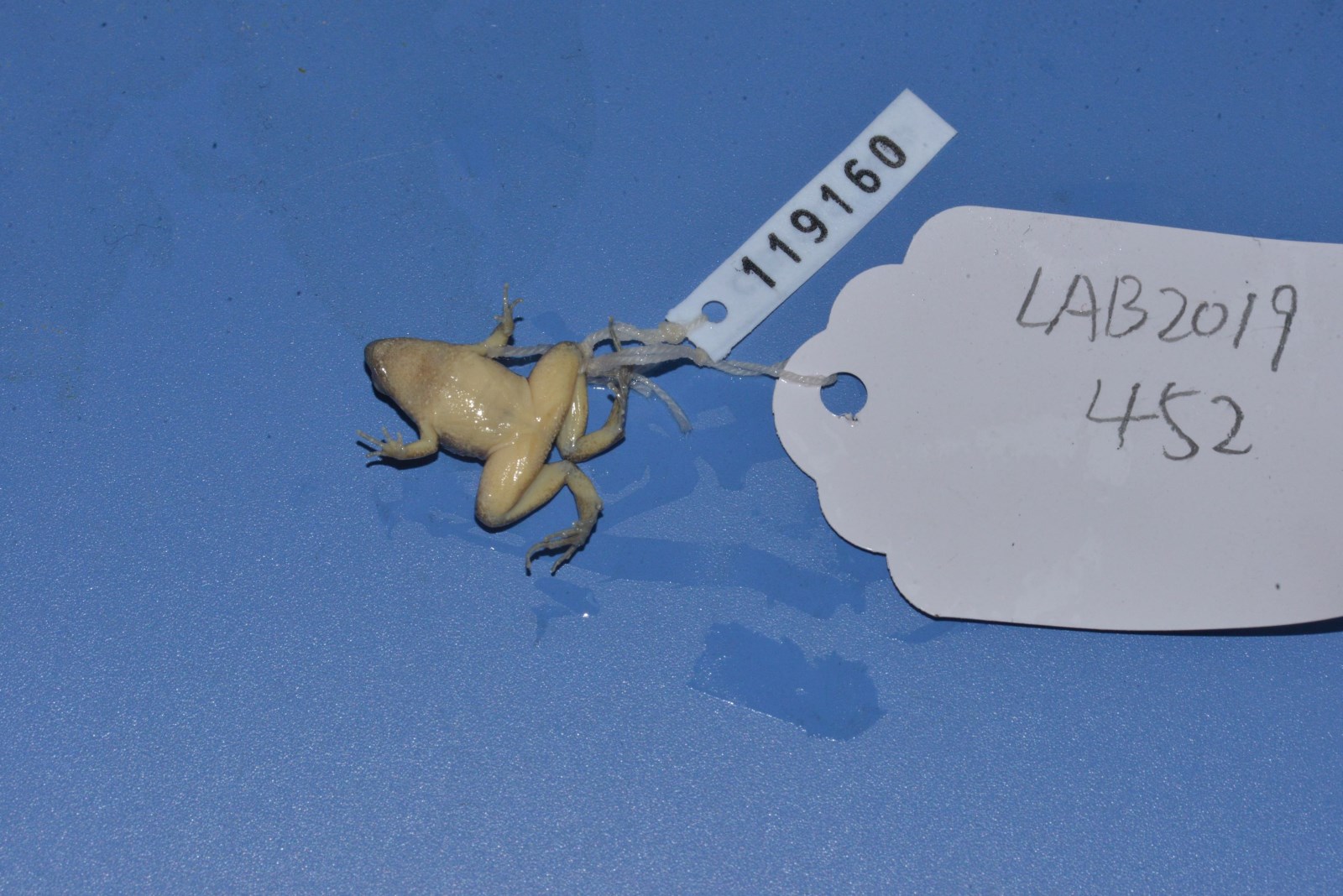 鉴定特征 体小,略呈三角形,雄蛙22毫米,雌蛙23毫米左右。头小,吻钝尖,鼓膜不显,无犁骨齿;舌后端圆。背面皮肤有小疣,由眼后至胯部前方有斜行大长疣;腹面光滑。指、趾端圆,均无吸盘和纵沟,掌突2;后肢粗短,胫跗关节前达肩部,趾间仅具蹼迹。背面粉灰色或灰棕色,上面有前后2个深棕色“^”形斑;咽喉部色深,胸、腹部及四肢腹面白色。雄性咽喉部黑色,具单咽下外声囊;有雄性线。